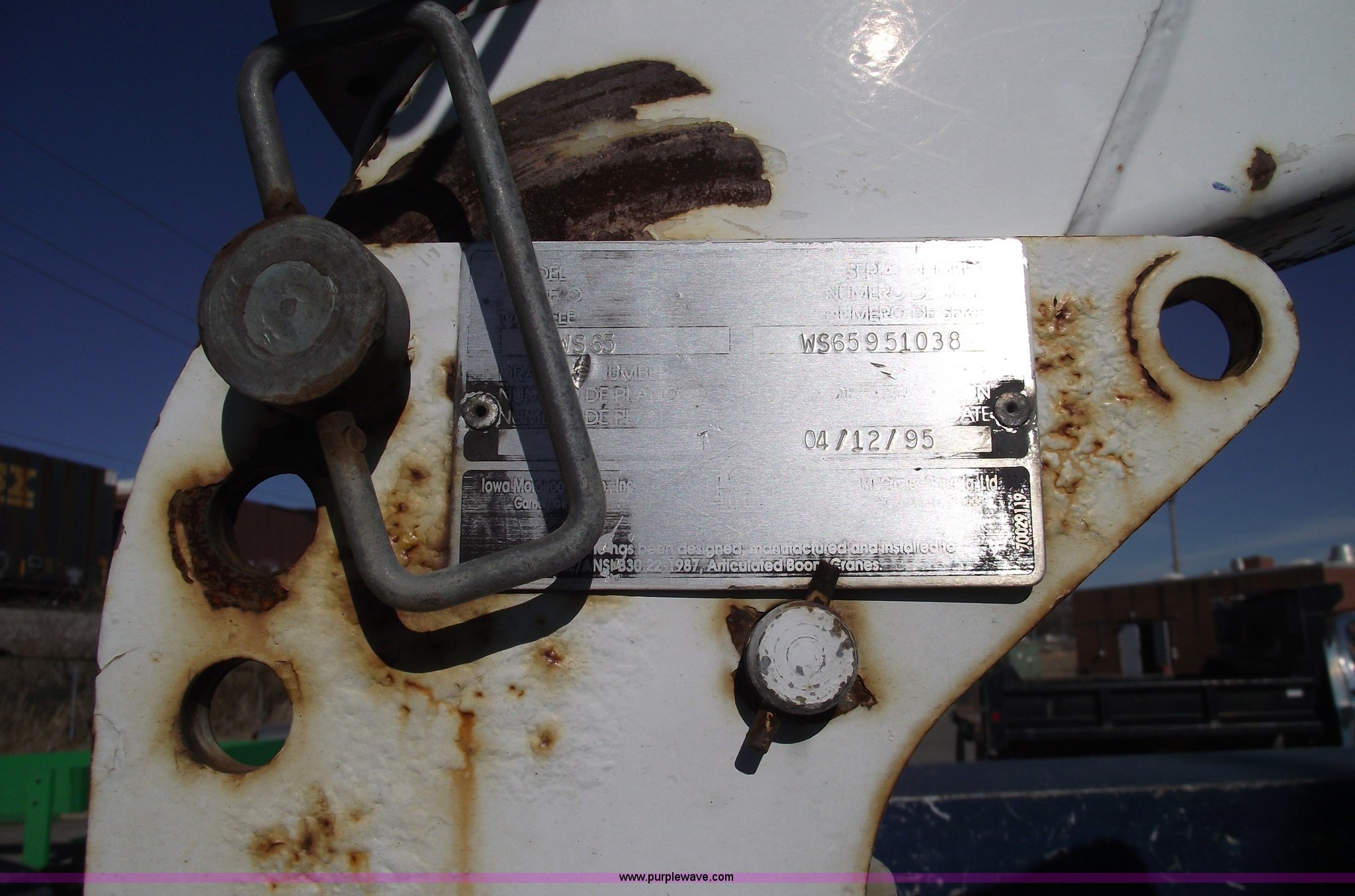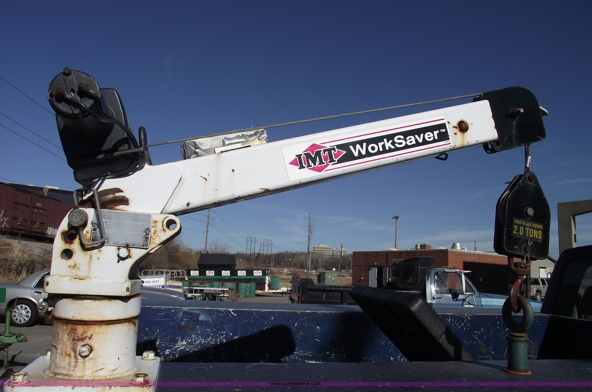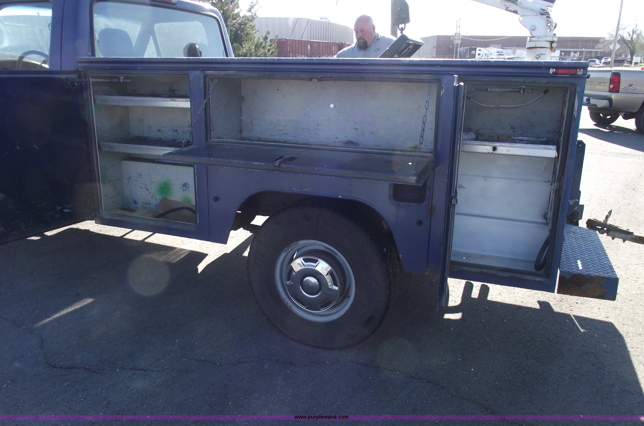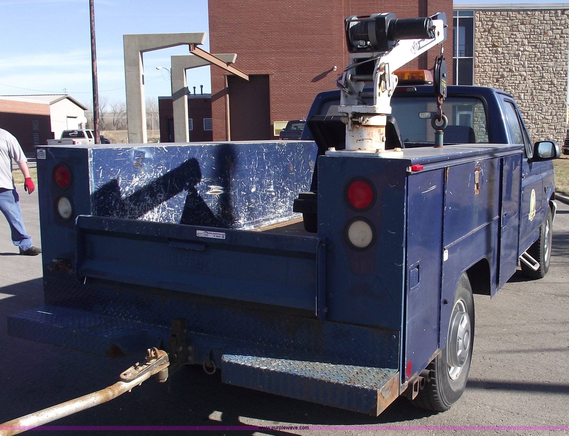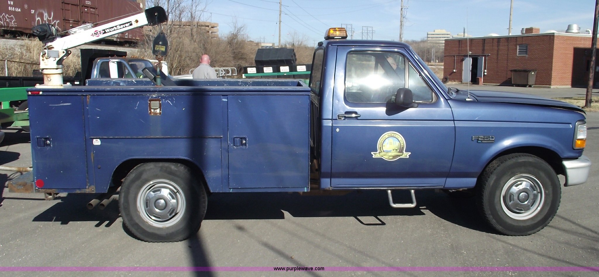 Purple Wave is selling a used Passenger Vehicle in Missouri. This item is a 1995 Ford F250 XL/XLT service truck with the following: 74,858 miles on odometer, 5.8L V8 EFI gas engine, Automatic transmission with over drive, AC and heat, Tilt, AM/FM, Manual windows and locks, Vinyl interior, Flashing beaken, Utility bed, Pintle hitch, Knapheide service bed, Model 65CLPE, Serial 748557-765736, Six bing doors, IMT work server crane, Model WS65, Two ton, 235-85-16 tires