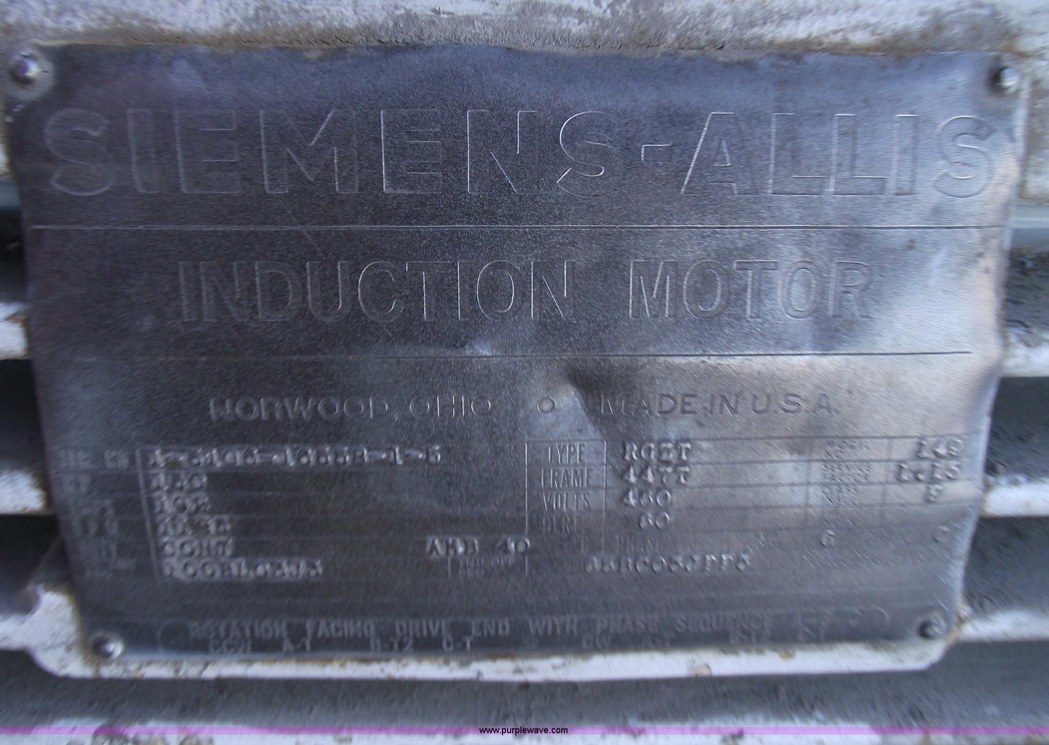 Purple Wave is selling a used Other Industrial or Business in Missouri. This item is a Siemens-ALL.S 150 hp electric motor with the following: 460 volt, Three phase, Model 149, Tested and operational, Removed from ADM Milling, Factory rebuilt, Serial 1-5106-16558-1-5