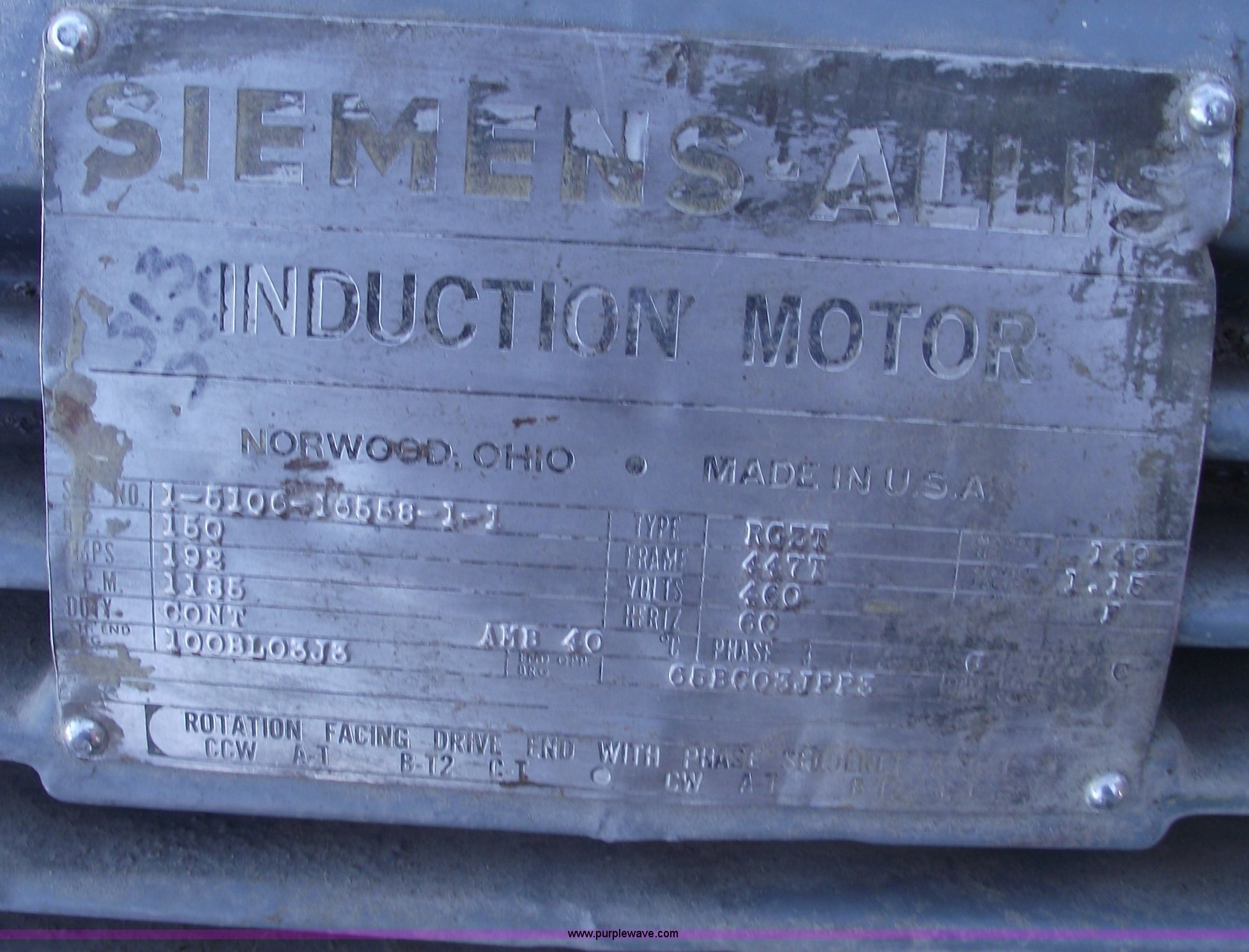 Purple Wave is selling a used Other Industrial or Business in Missouri. This item is a Siemens-Allis 150 hp electric motor with the following: Model 149, 460 volt, Three phase, Tested and operational, Removed from ADM Milling, Factory rebuilt