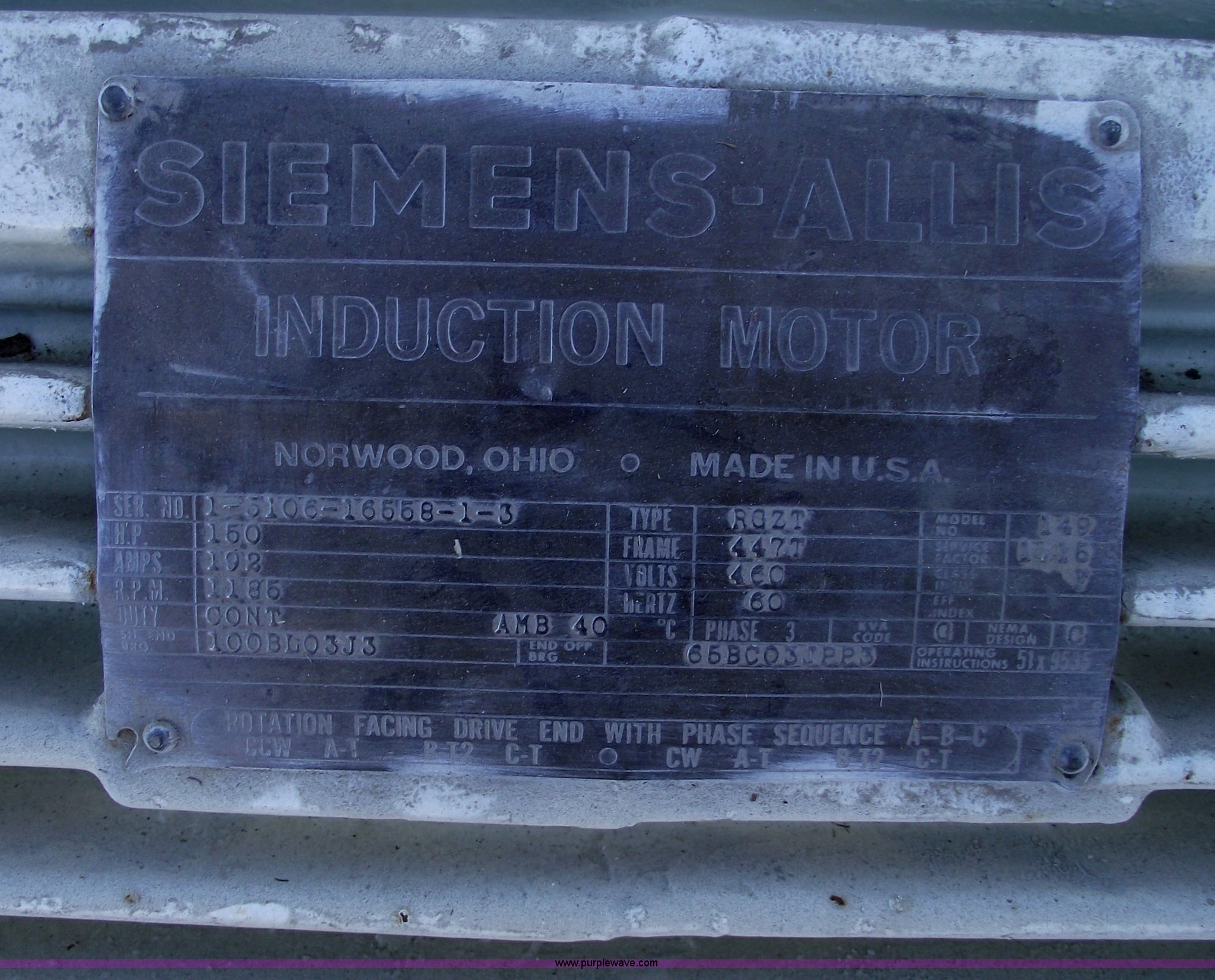 Purple Wave is selling a used Other Industrial or Business in Missouri. This item is a Siemens-Allis 150 hp electric motor with the following: Model 149, 460 volt, Three phase, Tested and operational, Removed from ADM Milling, Factory rebuilt, Serial 1-5106-16558-1-3