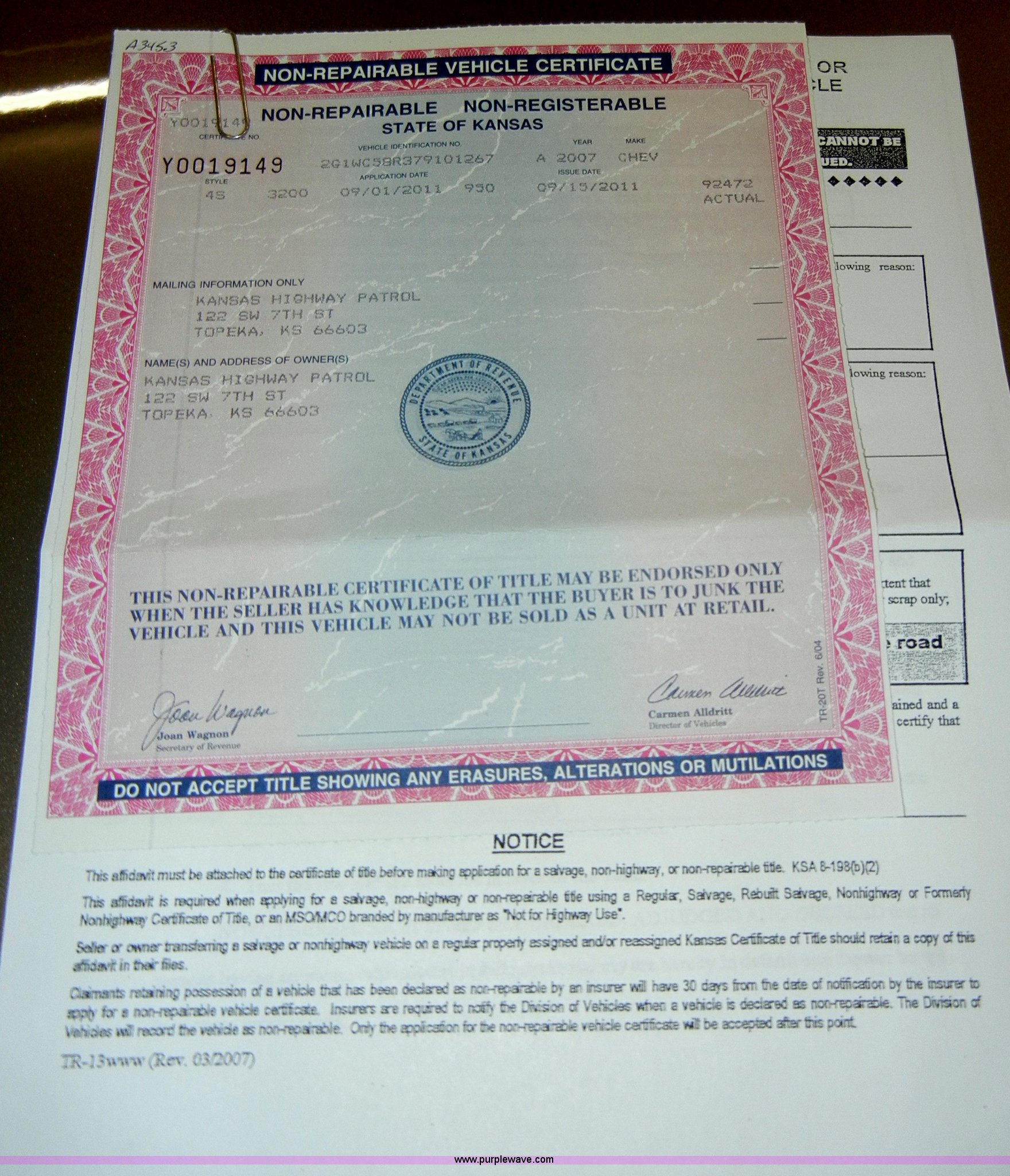 2007 Chevrolet Impala LT Non-repairable certificate, parts only has sold in Topeka, Kansas for $2310. Item A3453 sold on February 8th, 2012.