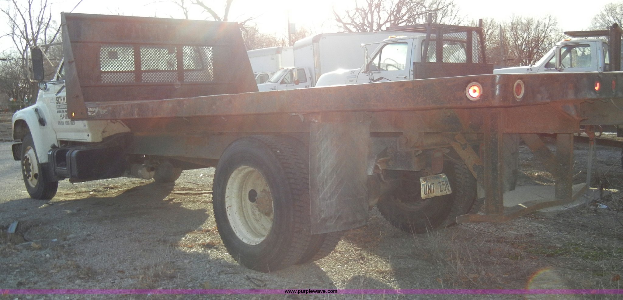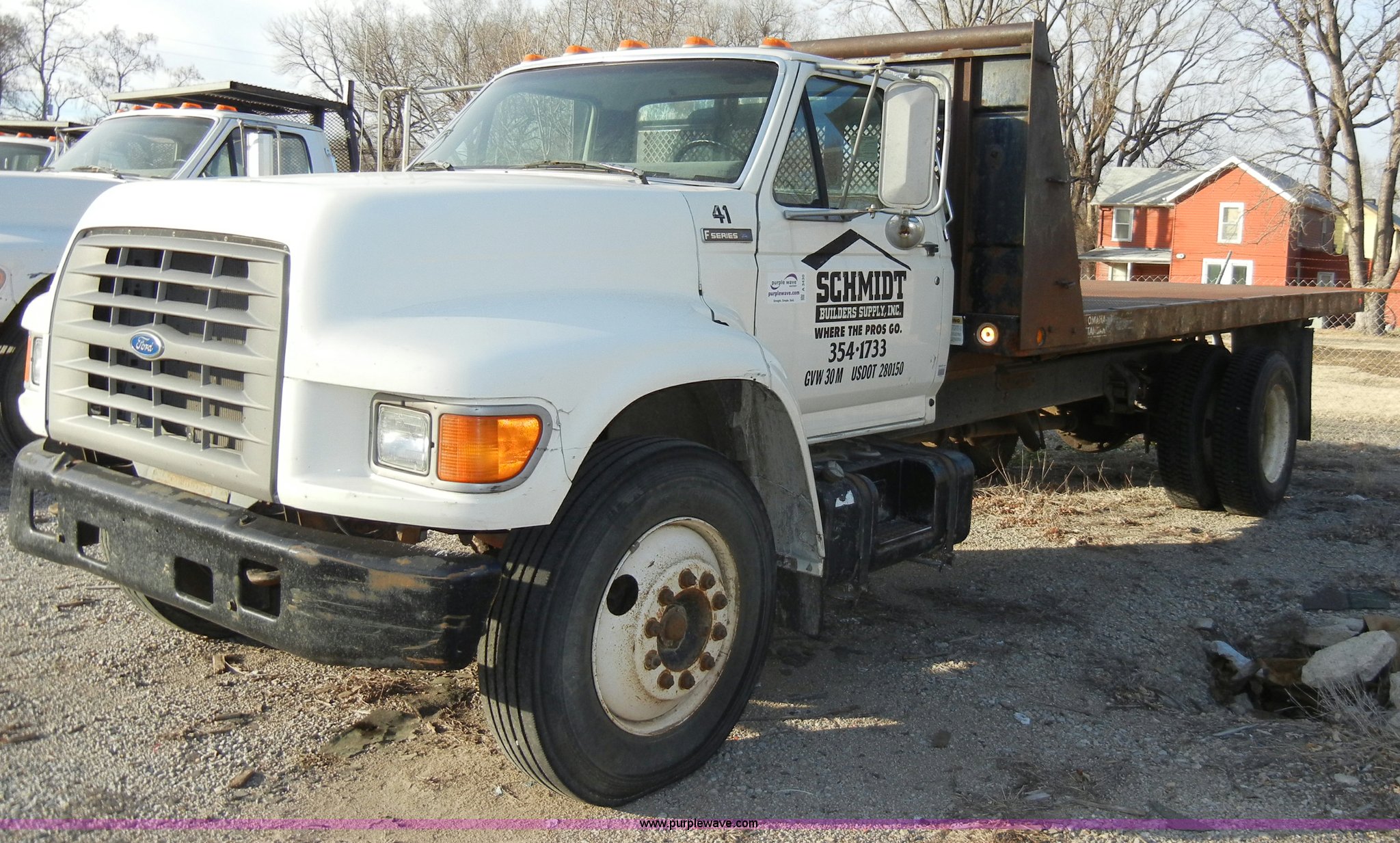 Purple Wave is selling a used Flat Bed Truck in Kansas. This item is a 1996 Ford F700 truck with the following: 281,798 miles on odometer, Ford 7.0L V8 gas engine, Five speed manual transmission, AC and heat, AM/FM, Manual windows and locks, Cloth bench seat, Chelsea PTO, Omaha Standard flatbed, 18' x 8', Diamond plate steel bed, Load straps, Air brakes, Front tow hooks, Dual 50 gallon fuel tanks, 10R22.5 tires, GVWR 24,500 lbs, FAWR 7,000 lbs, RAWR 17,500 lbs, Cosmetic damage to hood, ID# 41