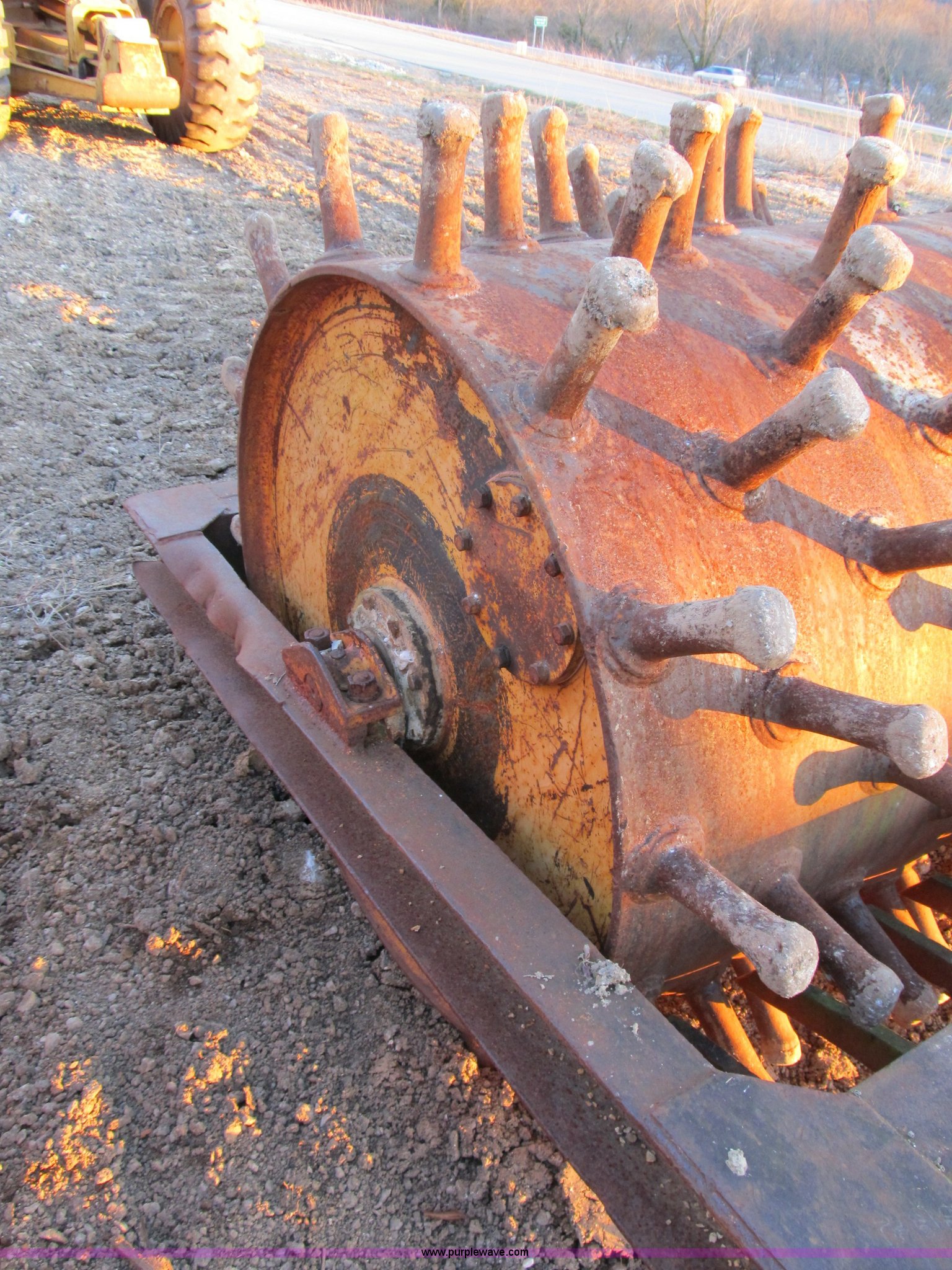 Purple Wave is selling a used Pull Type Roller Compactor in Missouri. This item is a Ferguson double drum sheeps foot roller with the following: 48"L x 40" diameter drum, 9' overall width, 7" tines