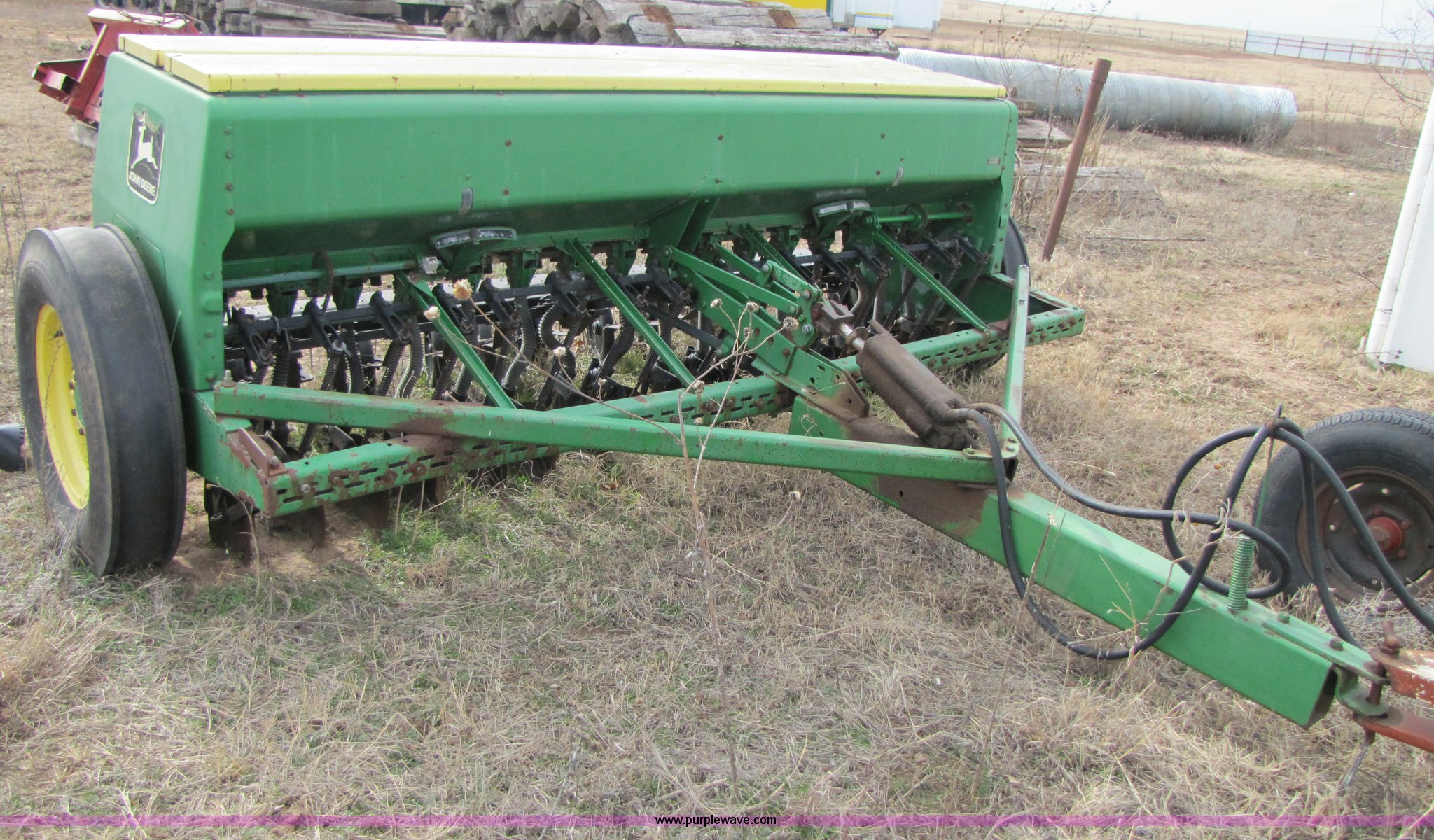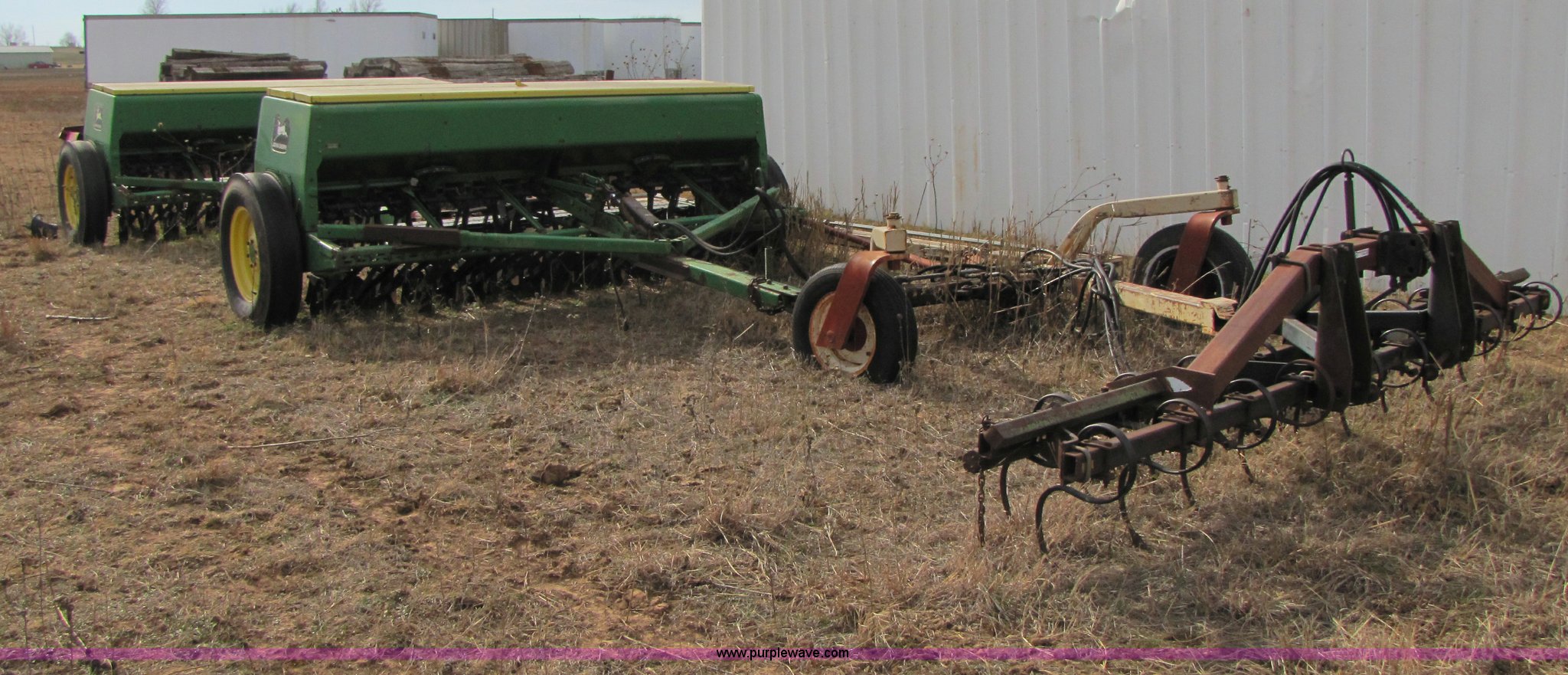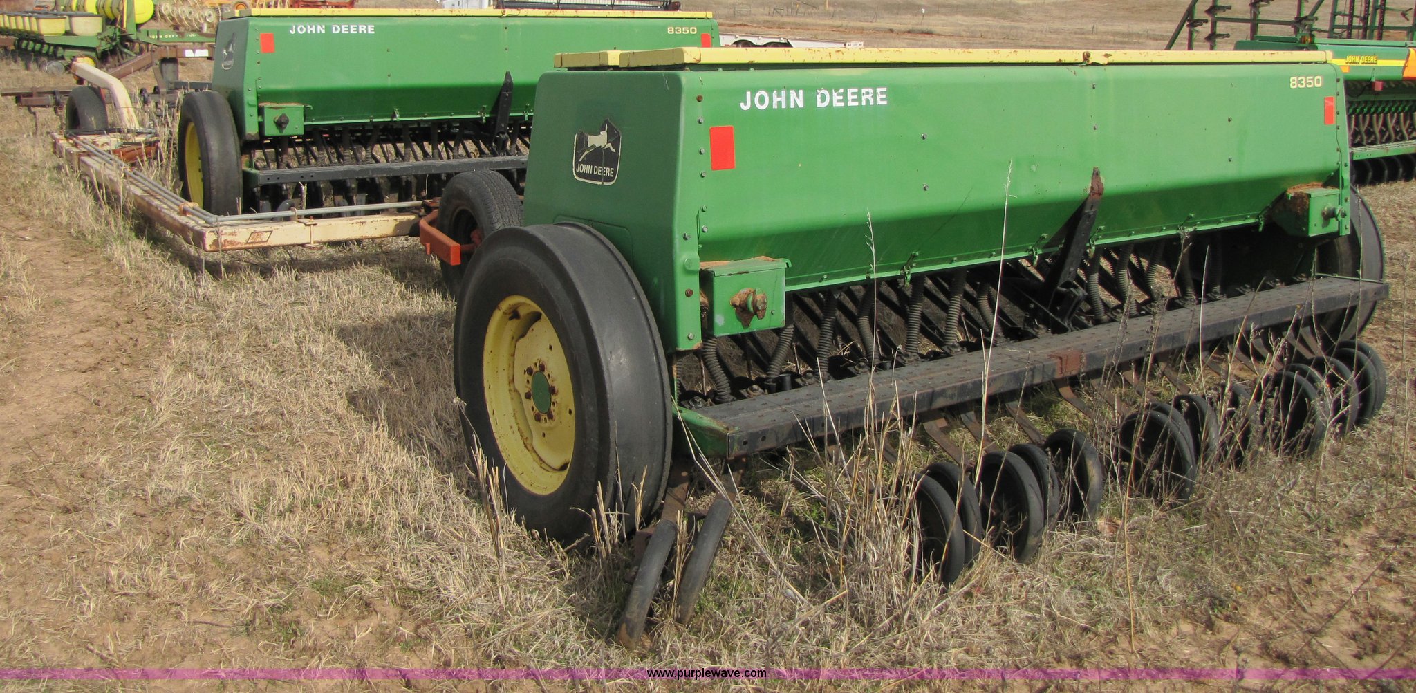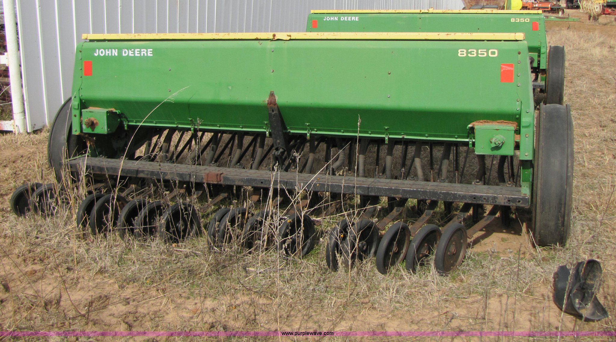 Purple Wave is selling a used Grain Drill or Seeder in Oklahoma. This item is a (2) John Deere 8350 16 row drills with tandem hitch with the following: 10.5'W each, 8" row spacing, Press wheels, Single disk openers, Setup for dry fertilizer, Needs repair, Hydraulic height adjust, Hydraulic folding tandem drill hitch, 15" tires, Hiniker three point track scratcher hitch, Pin hitch, 7.50-20 tires, Serial 003396N, 003261N