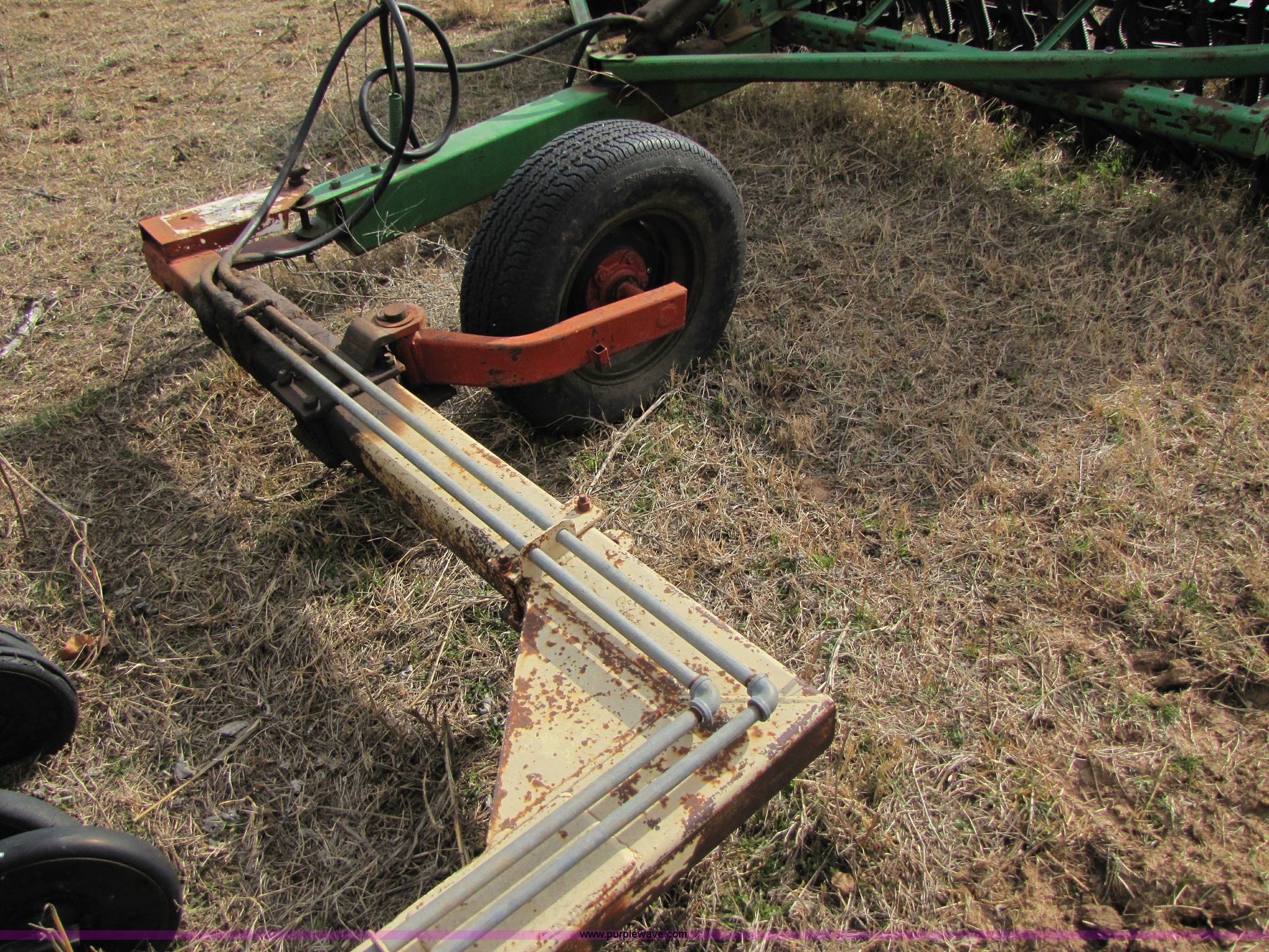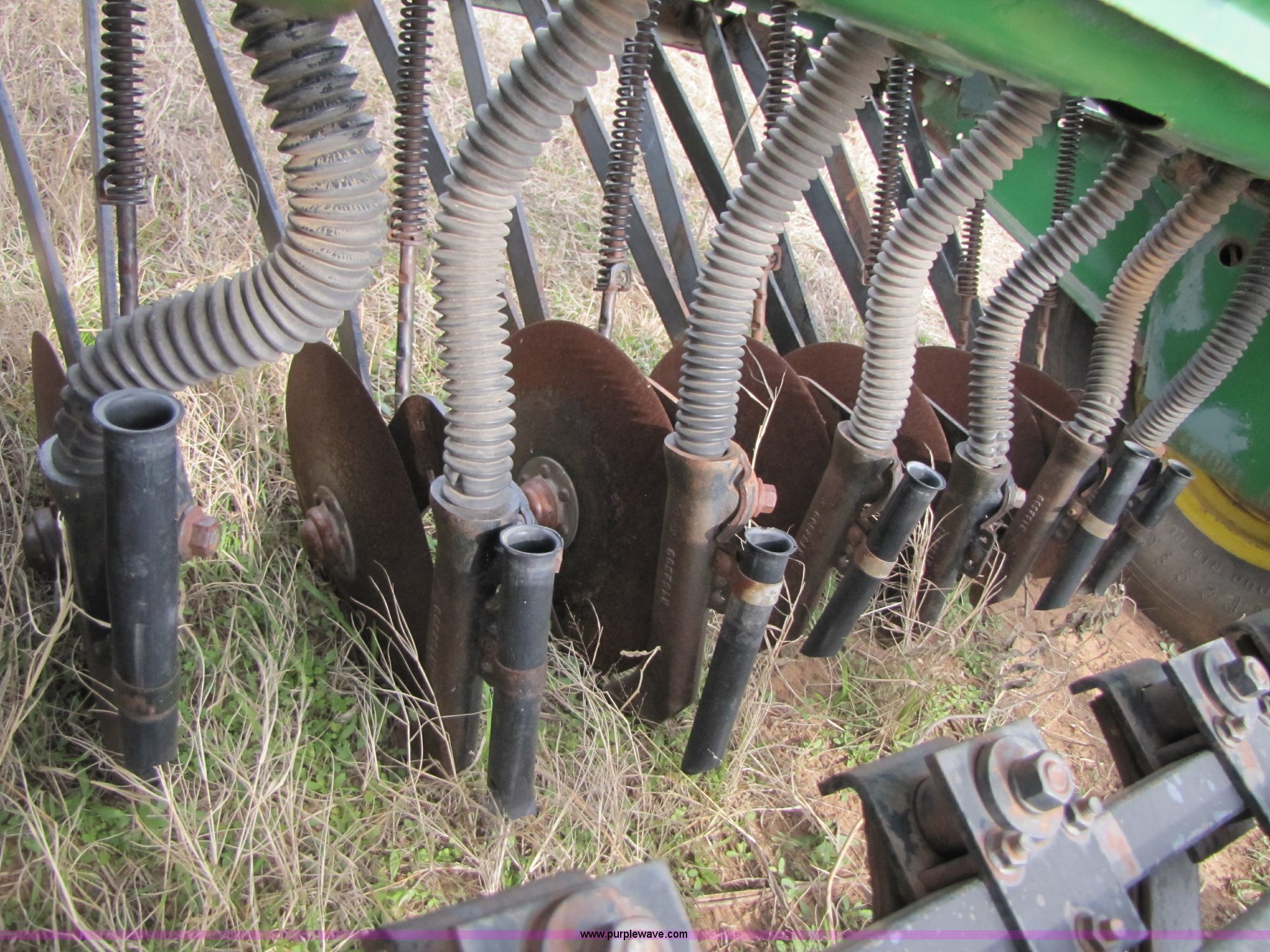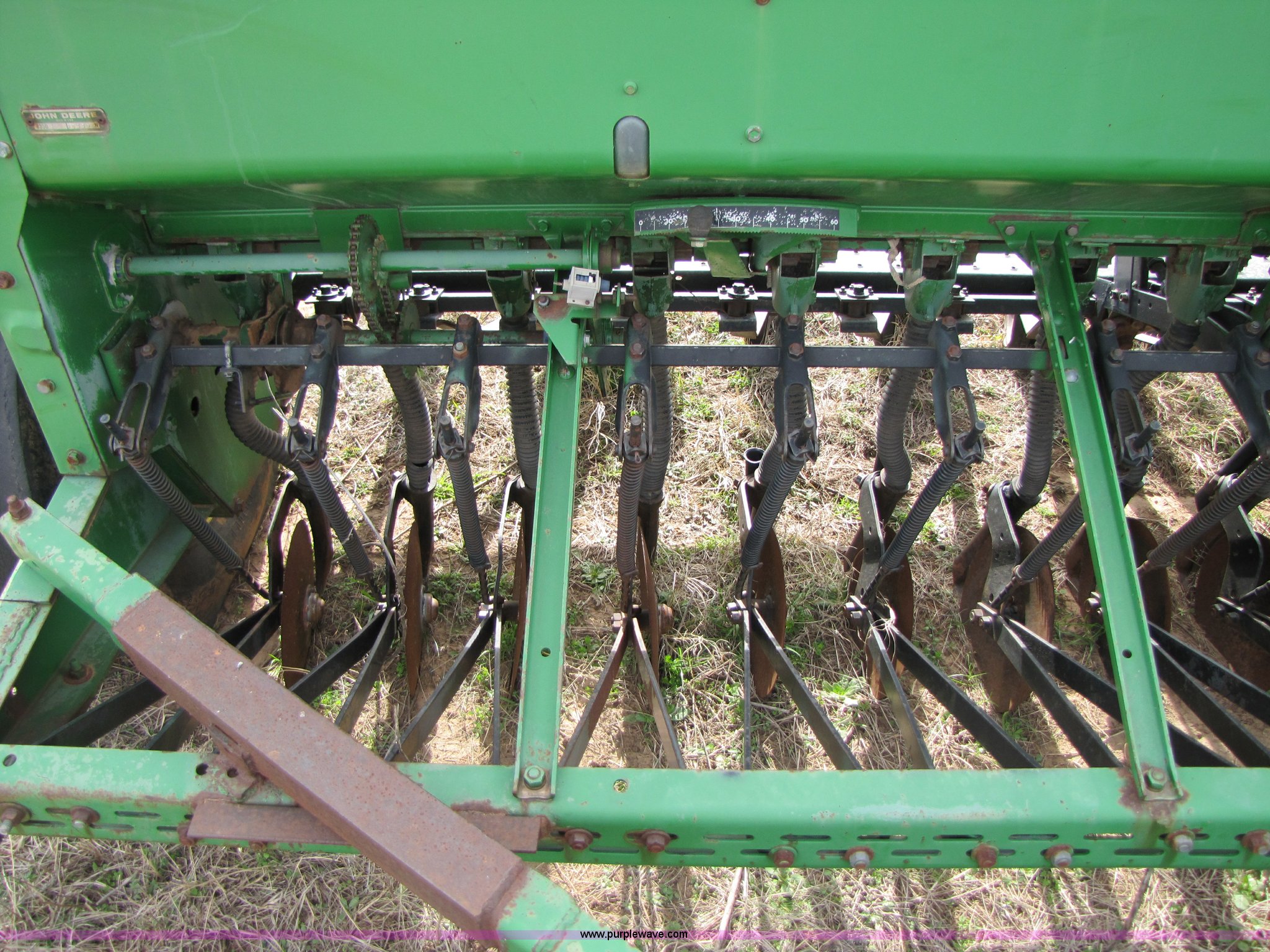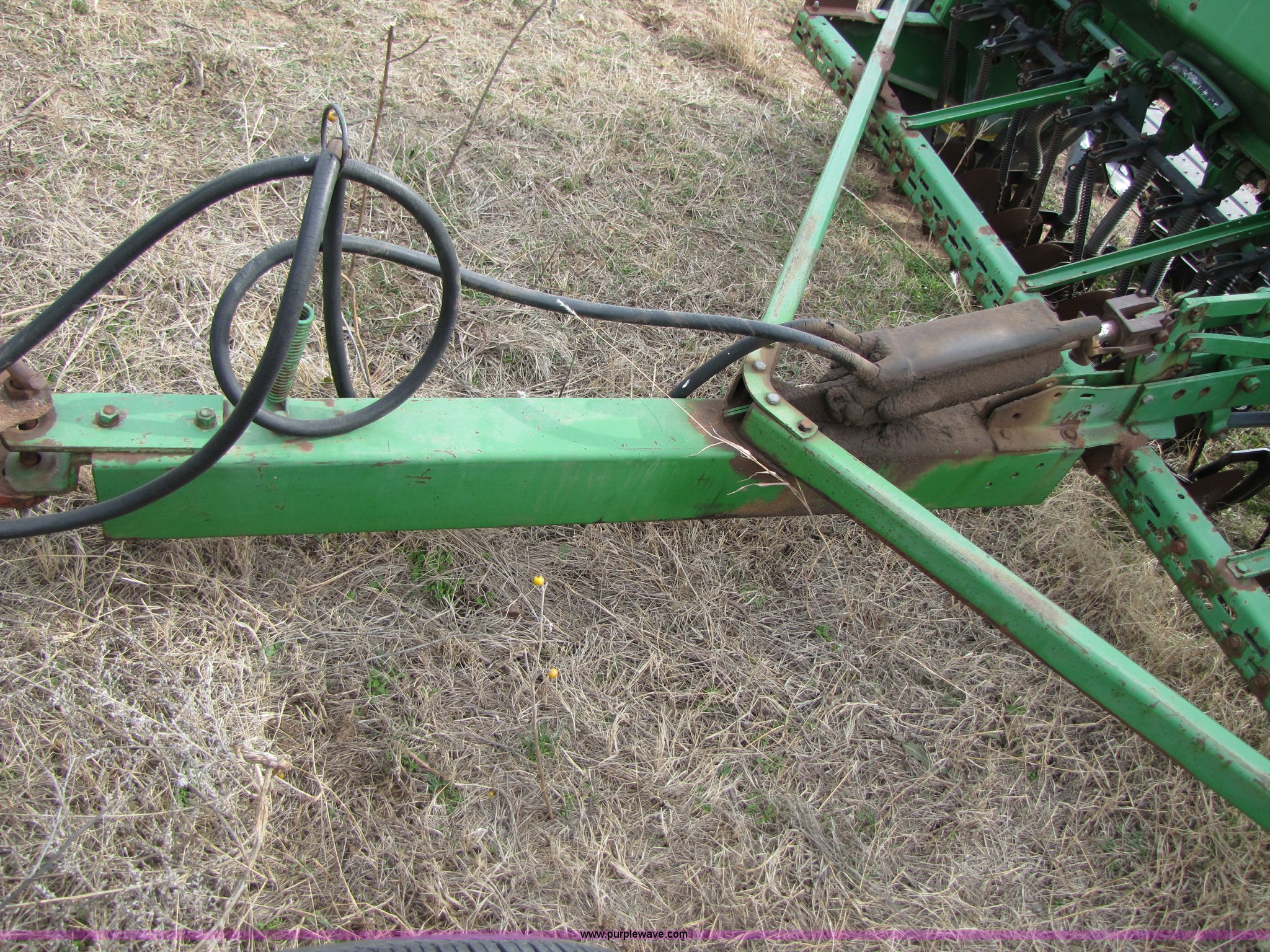 Purple Wave is selling a used Grain Drill or Seeder in Oklahoma. This item is a (2) John Deere 8350 16 row drills with tandem hitch with the following: 10.5'W each, 8" row spacing, Press wheels, Single disk openers, Setup for dry fertilizer, Needs repair, Hydraulic height adjust, Hydraulic folding tandem drill hitch, 15" tires, Hiniker three point track scratcher hitch, Pin hitch, 7.50-20 tires, Serial 003396N, 003261N