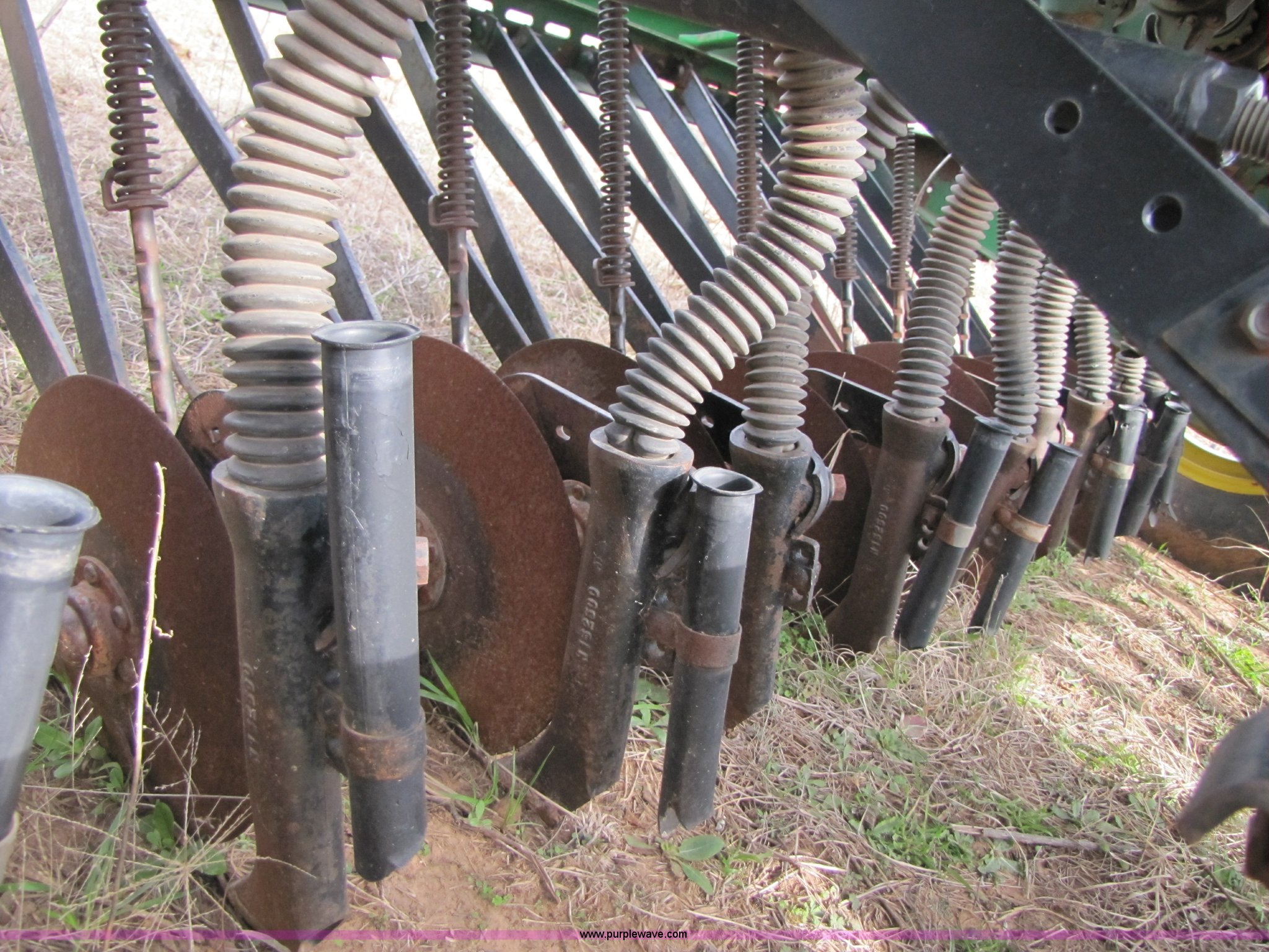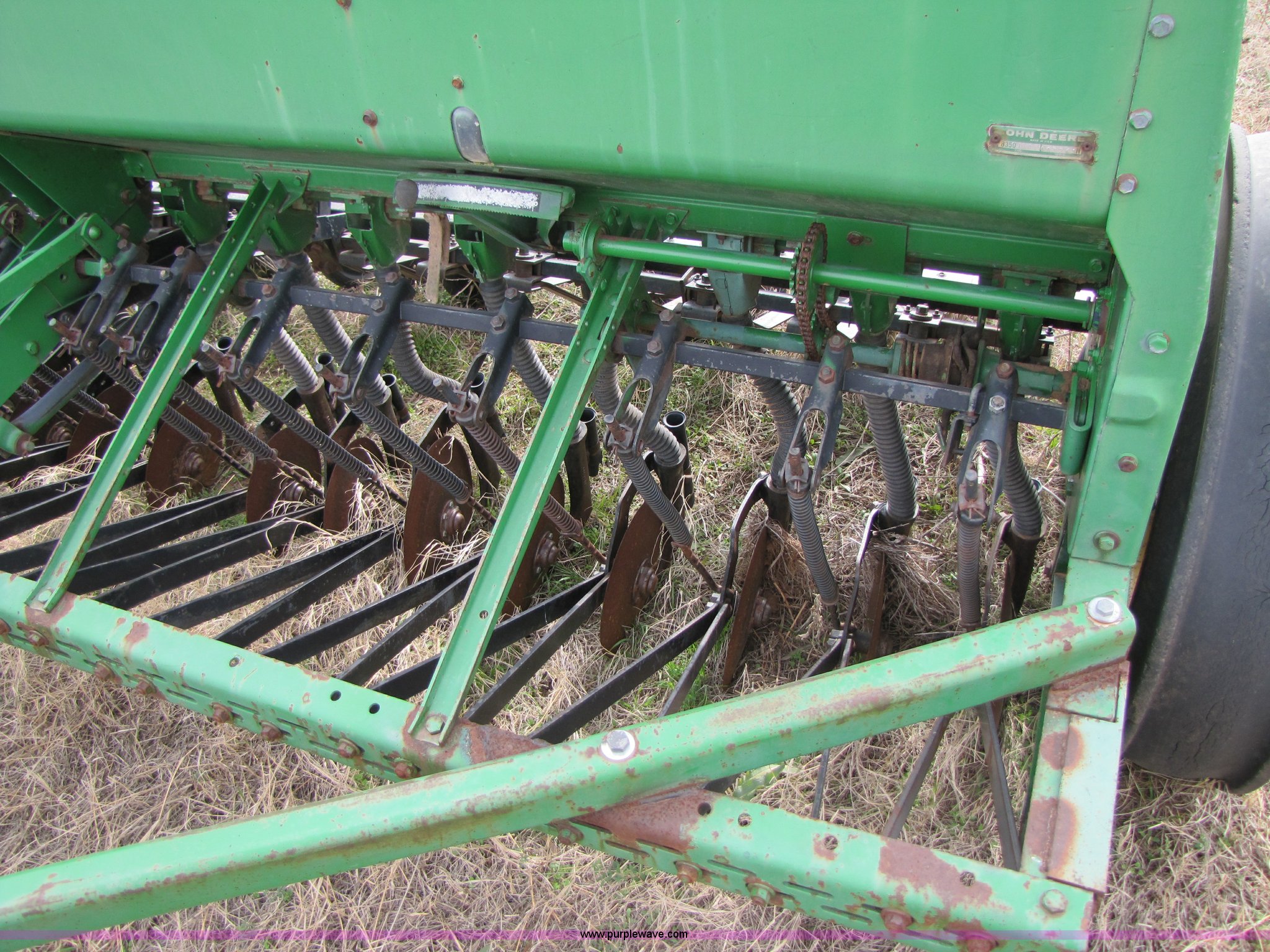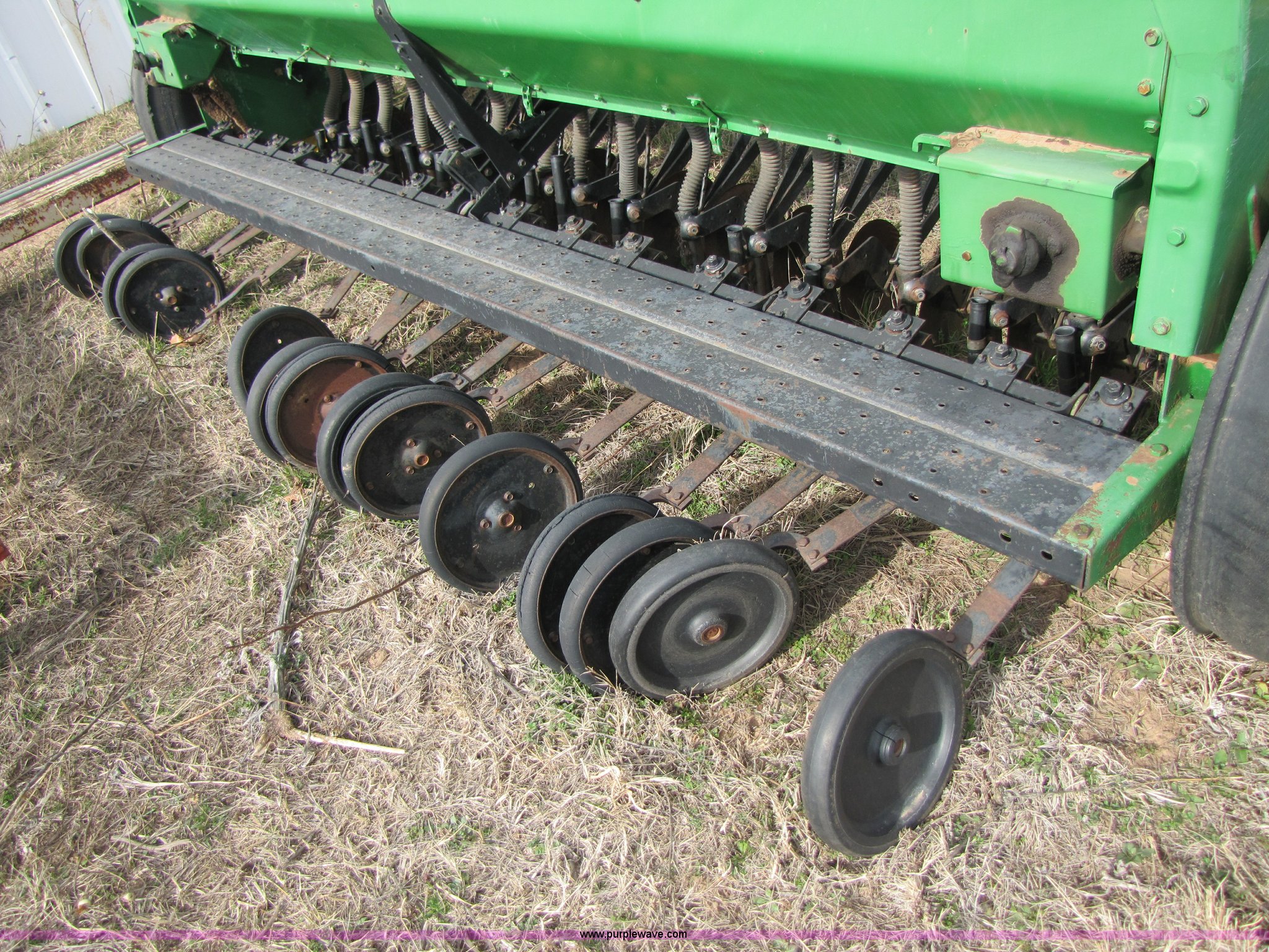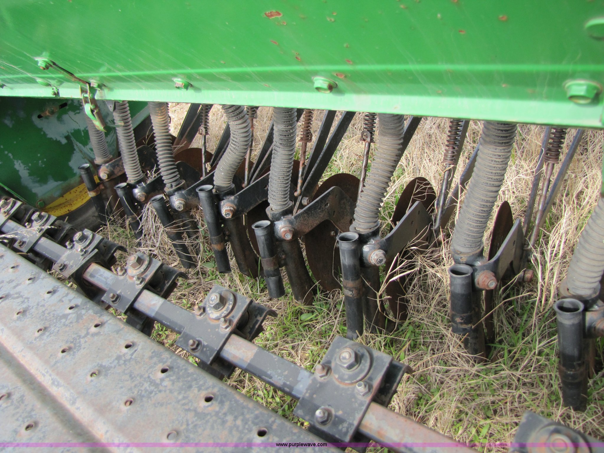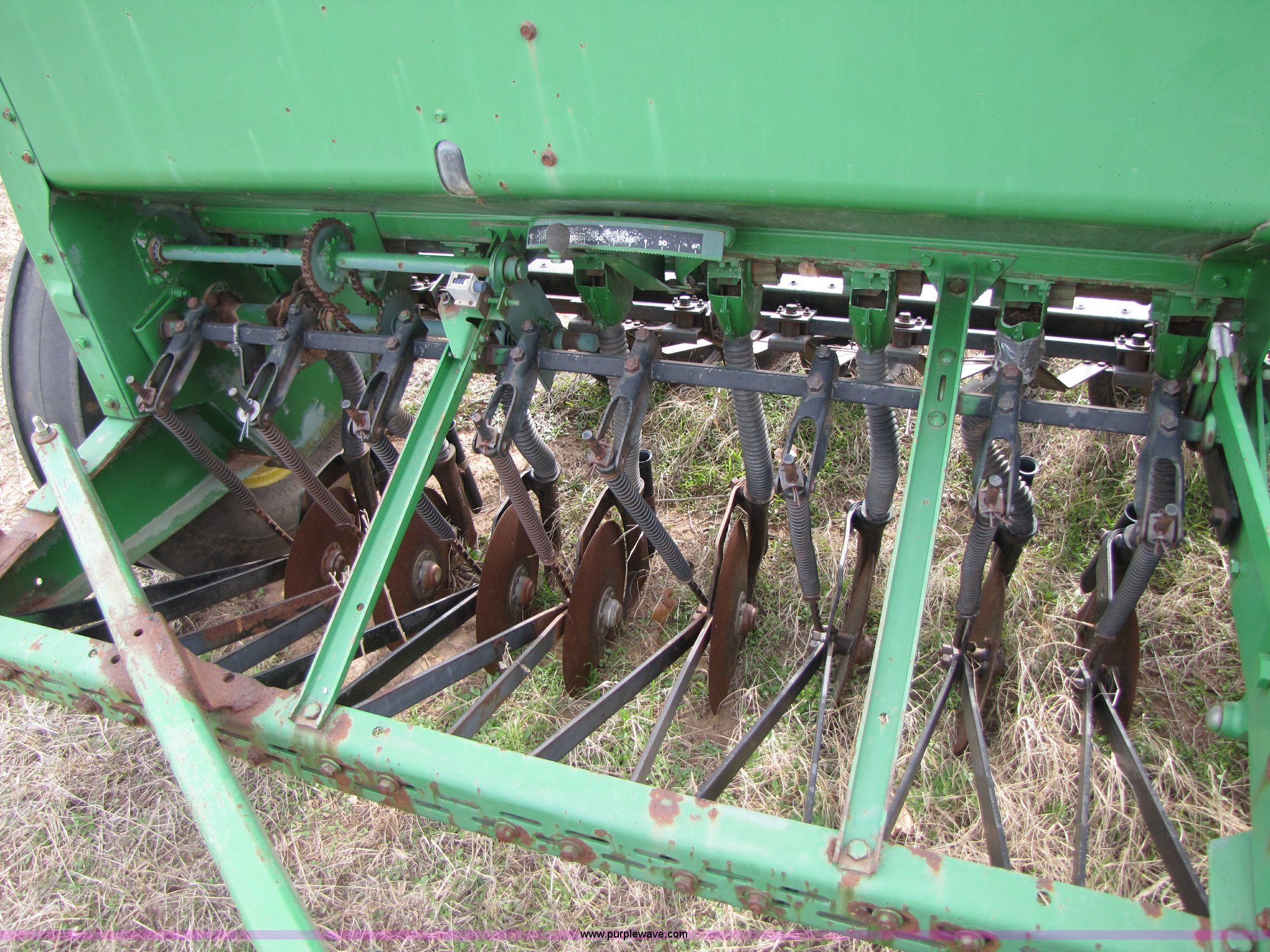 Purple Wave is selling a used Grain Drill or Seeder in Oklahoma. This item is a (2) John Deere 8350 16 row drills with tandem hitch with the following: 10.5'W each, 8" row spacing, Press wheels, Single disk openers, Setup for dry fertilizer, Needs repair, Hydraulic height adjust, Hydraulic folding tandem drill hitch, 15" tires, Hiniker three point track scratcher hitch, Pin hitch, 7.50-20 tires, Serial 003396N, 003261N