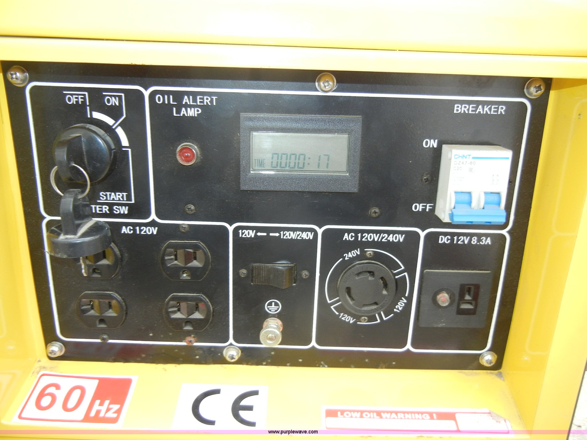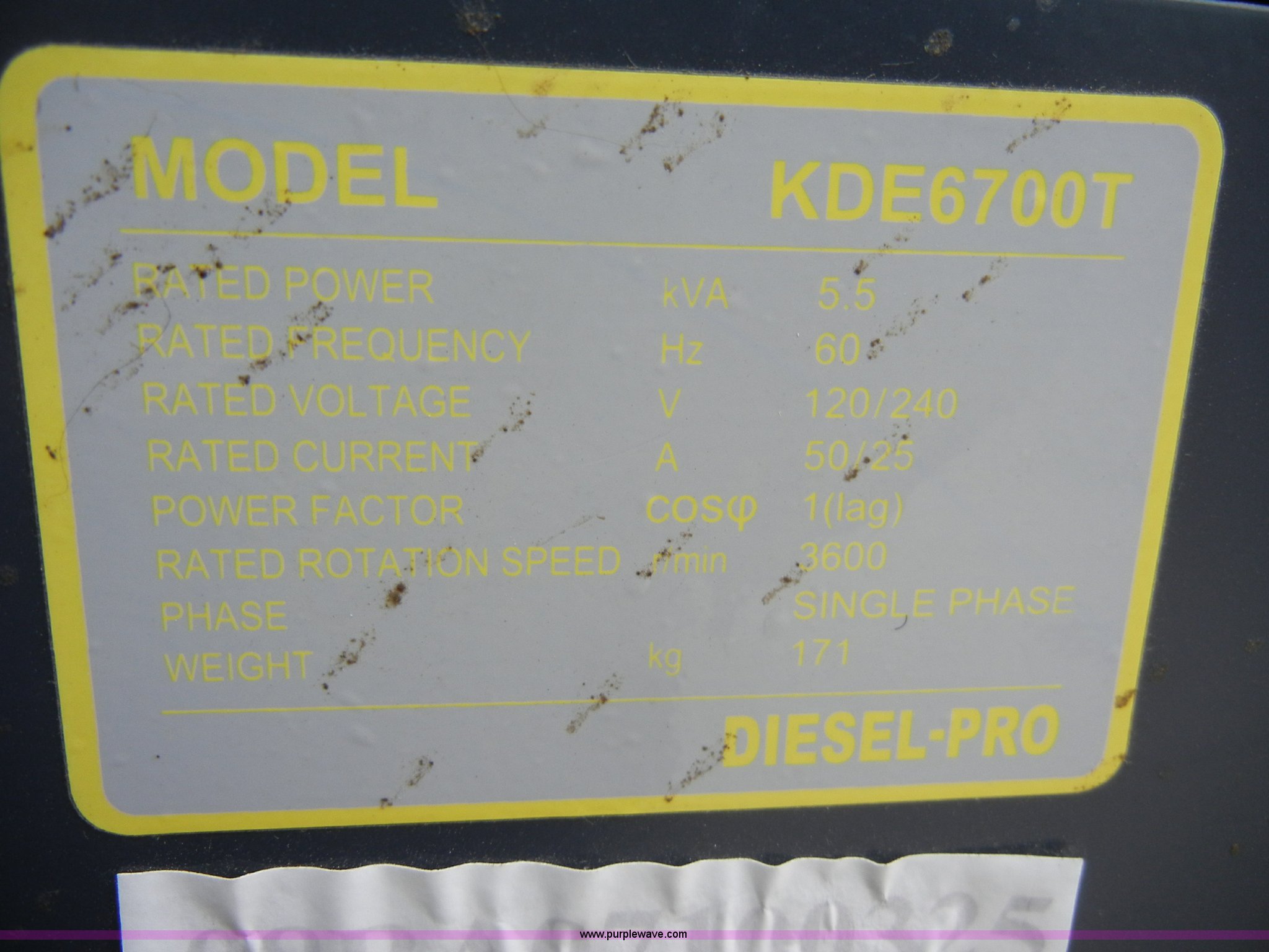 Purple Wave is selling a used Generator Set in Kansas. This item is a KDE 6700T diesel generator with the following: .17 hours on meter, Engine model SU186FA, Single phase, No battery, Powers on, New