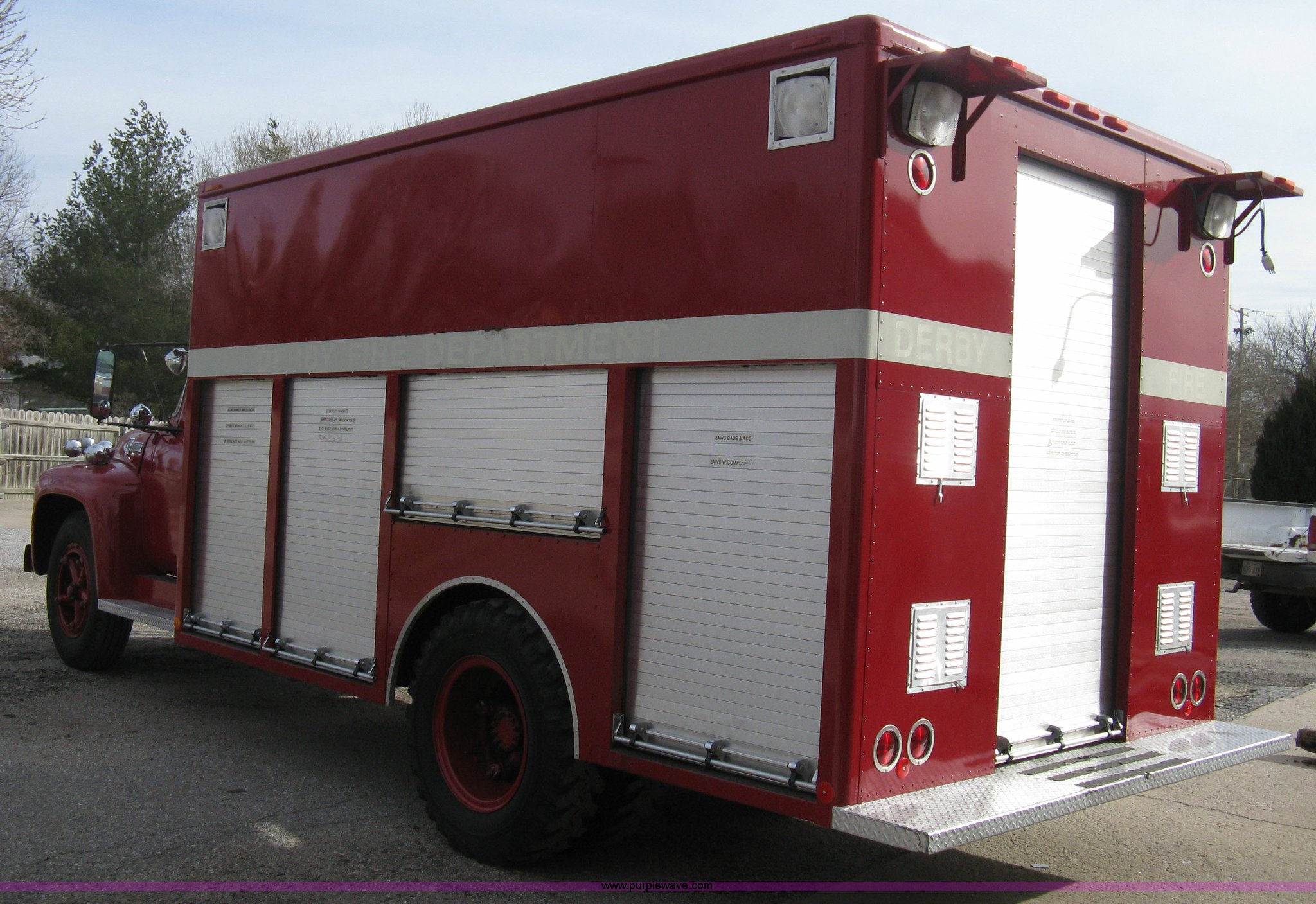 Purple Wave is selling a used Fire Truck or Emergency Vehicle in Kansas. This item is a 1956 Ford F800 Big Job firetruck with the following: 15,266 miles on odometer, Gas engine, Five speed manual transmission, Manual windows, (2) manual spotlights, 1992 Better Built custom body, 14'L x 8'W, (8) roll up door side cabinets, On board fire control system, Step up rear bumper, 9.00-20 tires, GVW 25,000 lbs