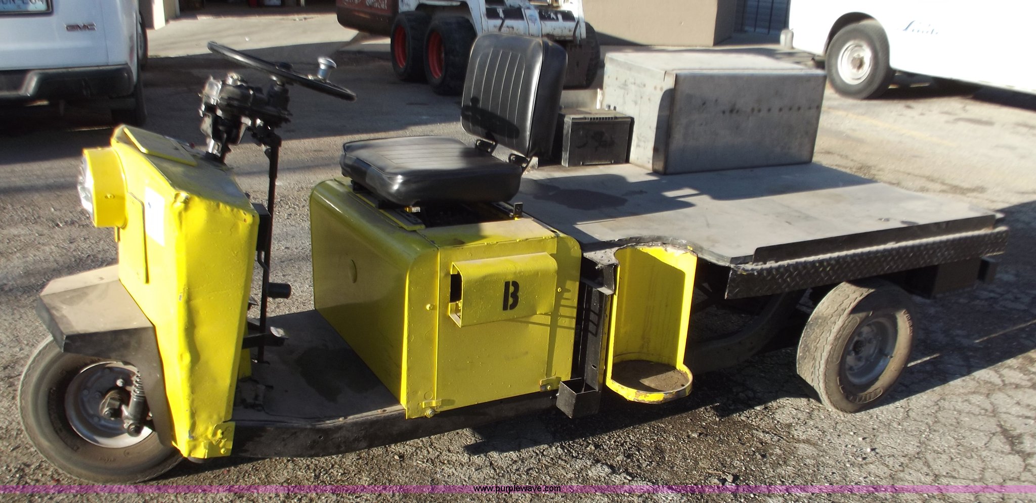 Purple Wave is selling a used Utility Vehicle in Missouri. This item is a Cushman three wheel welding cart with the following: Two cylinder gas engine, 2,000 lb rated payload, Stainless steel toolbox, Oxygen and acetylene tank holder, 5.70-8 tires, Gear reduction steering, Serial 8984147410