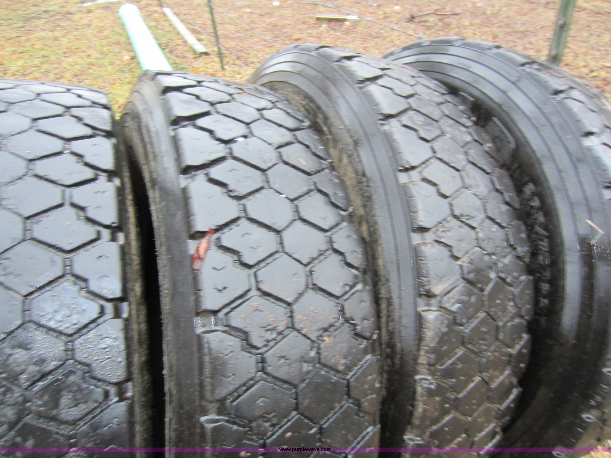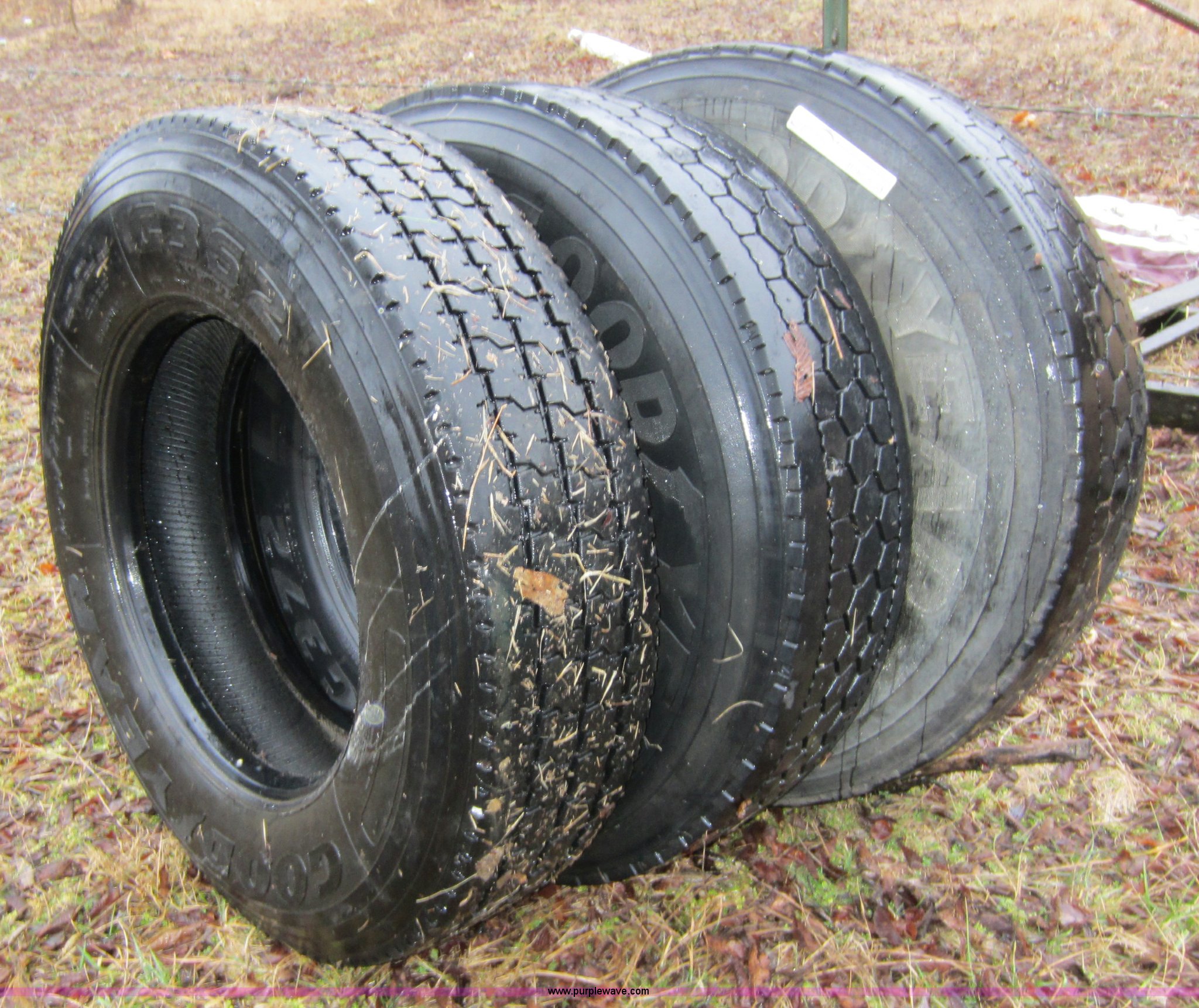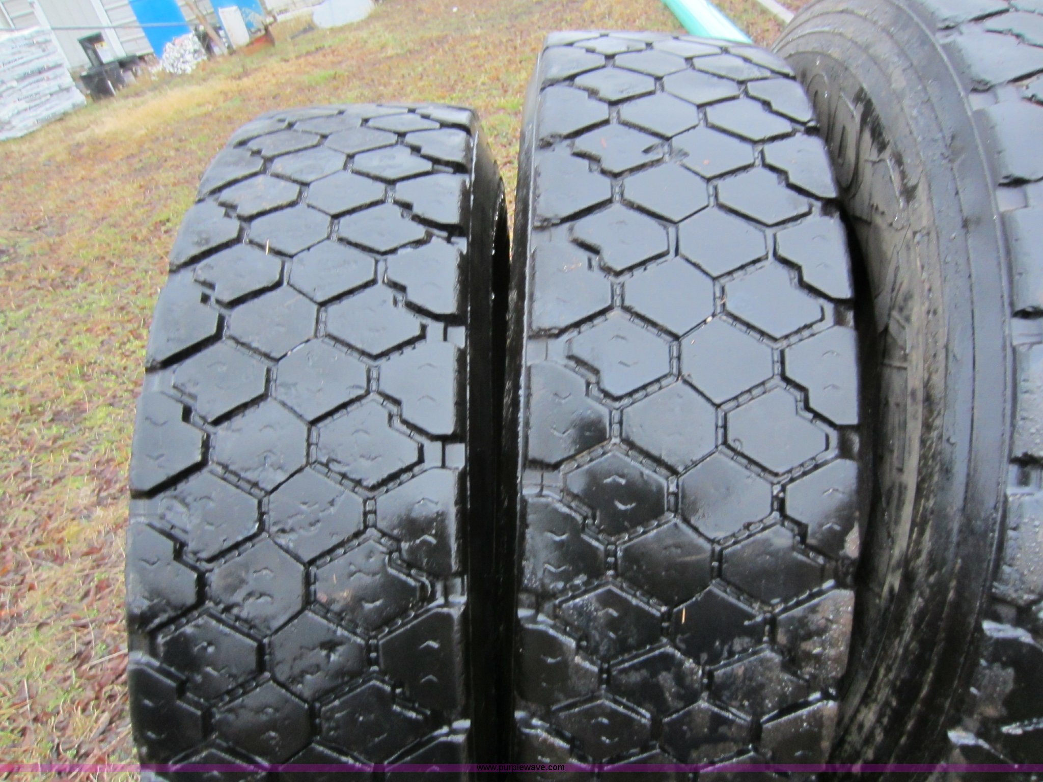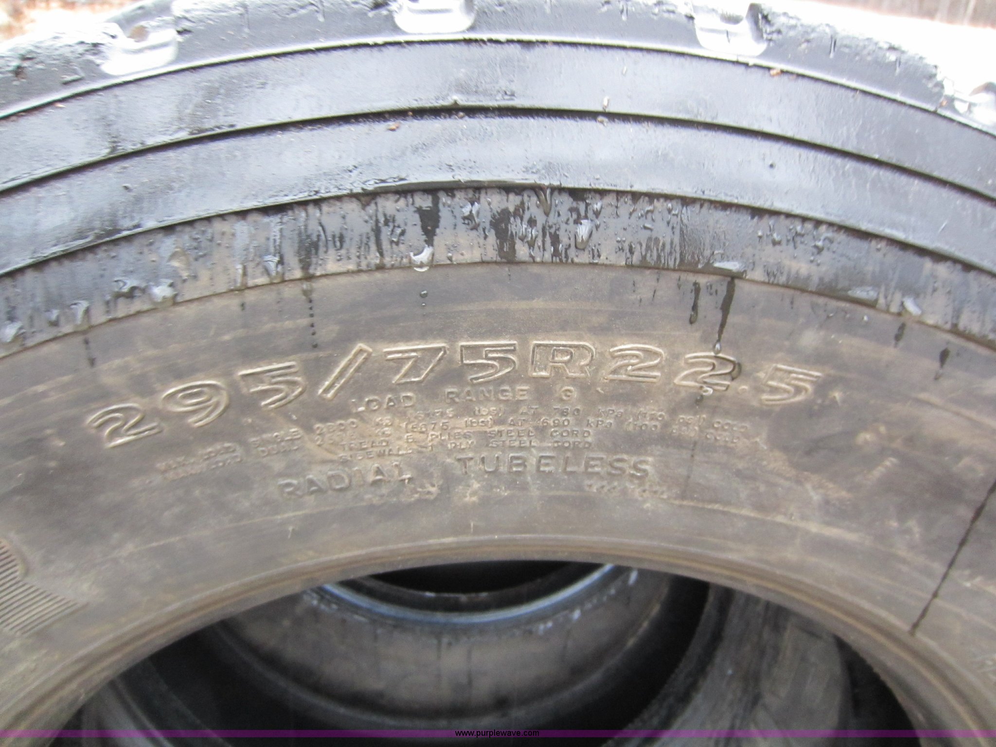 Purple Wave is selling a used Industrial Tires or Tracks in Kansas. This item is a (9) semi truck tires with the following: 295/75R22.5, All virgin casings
