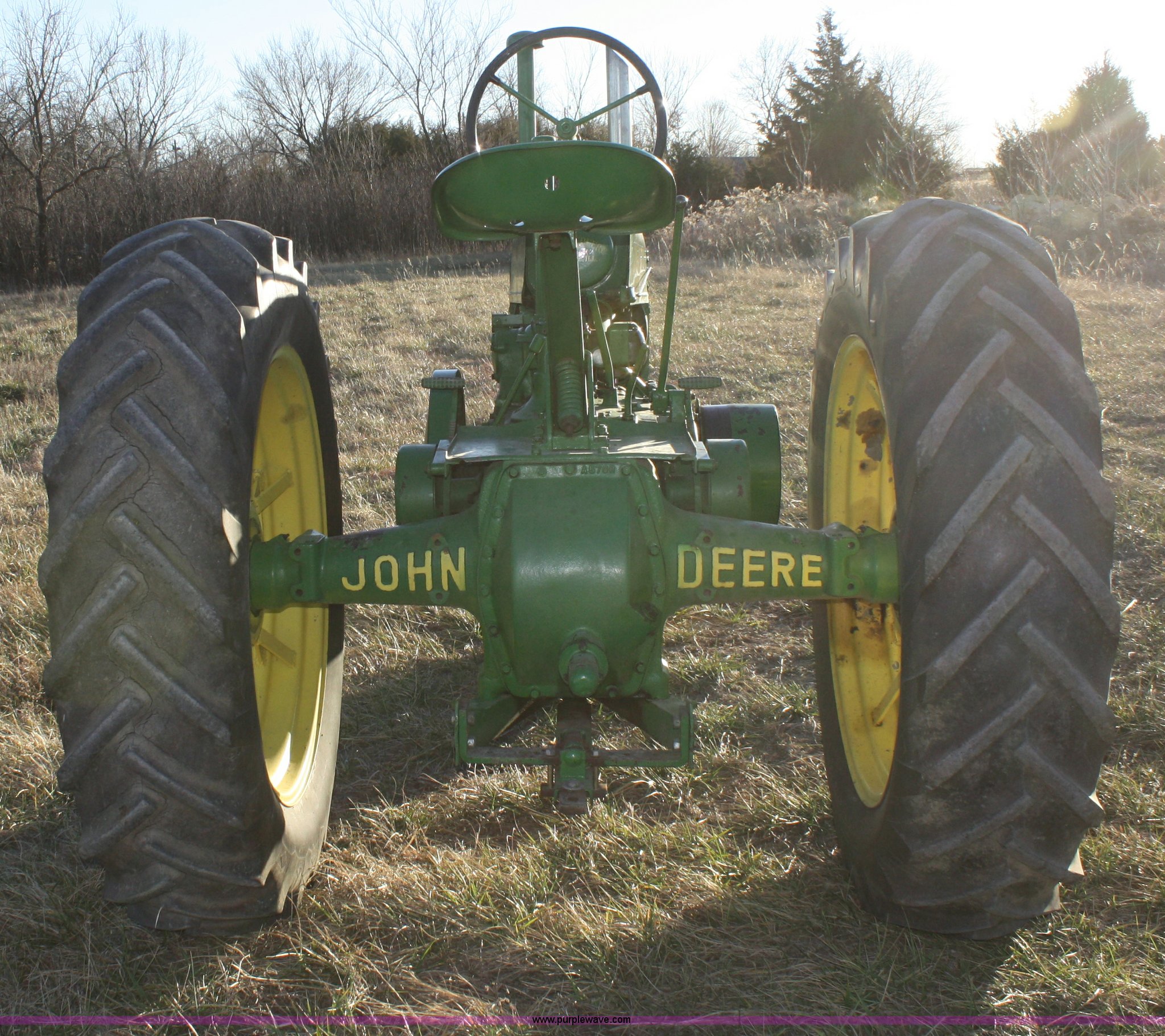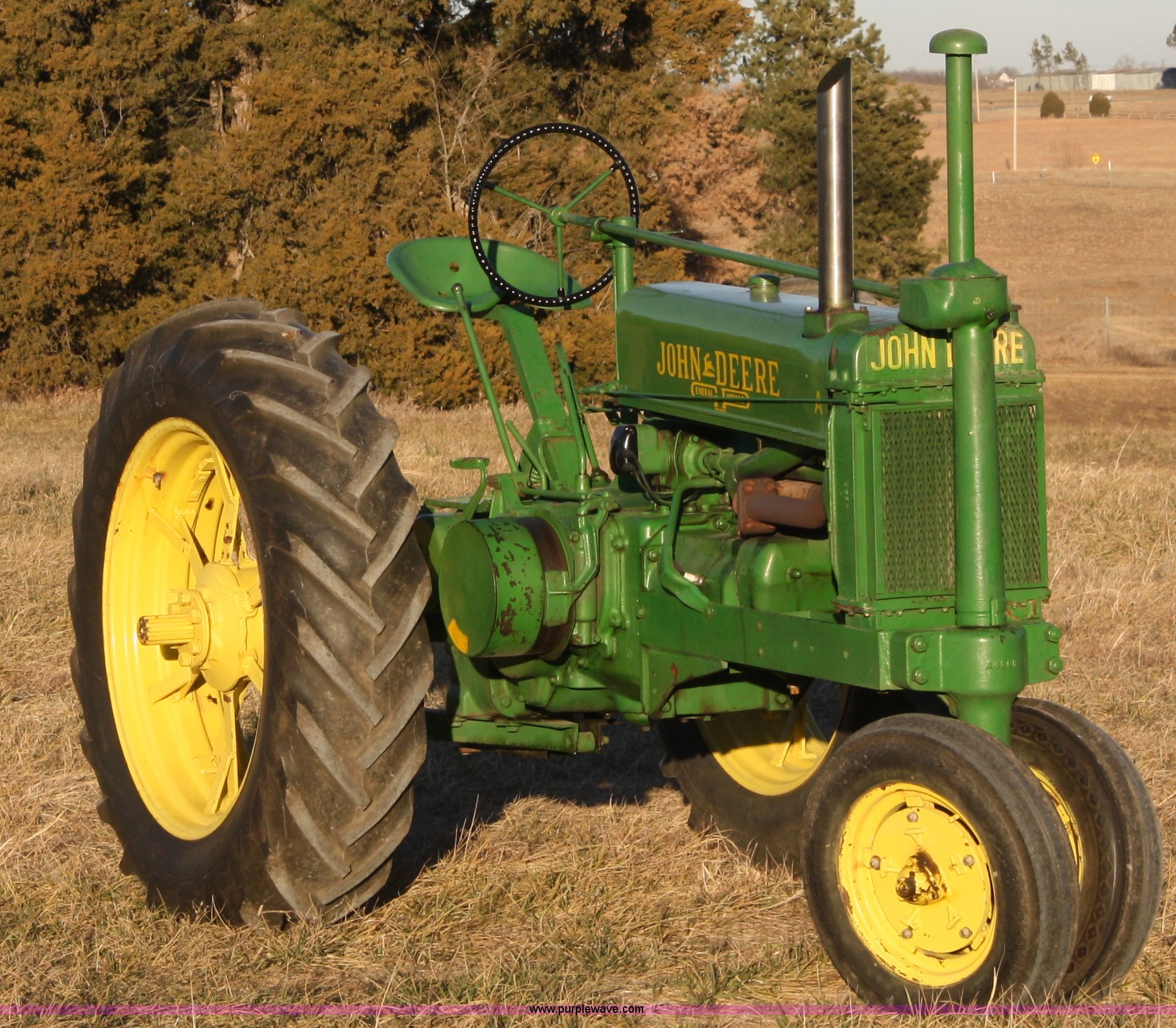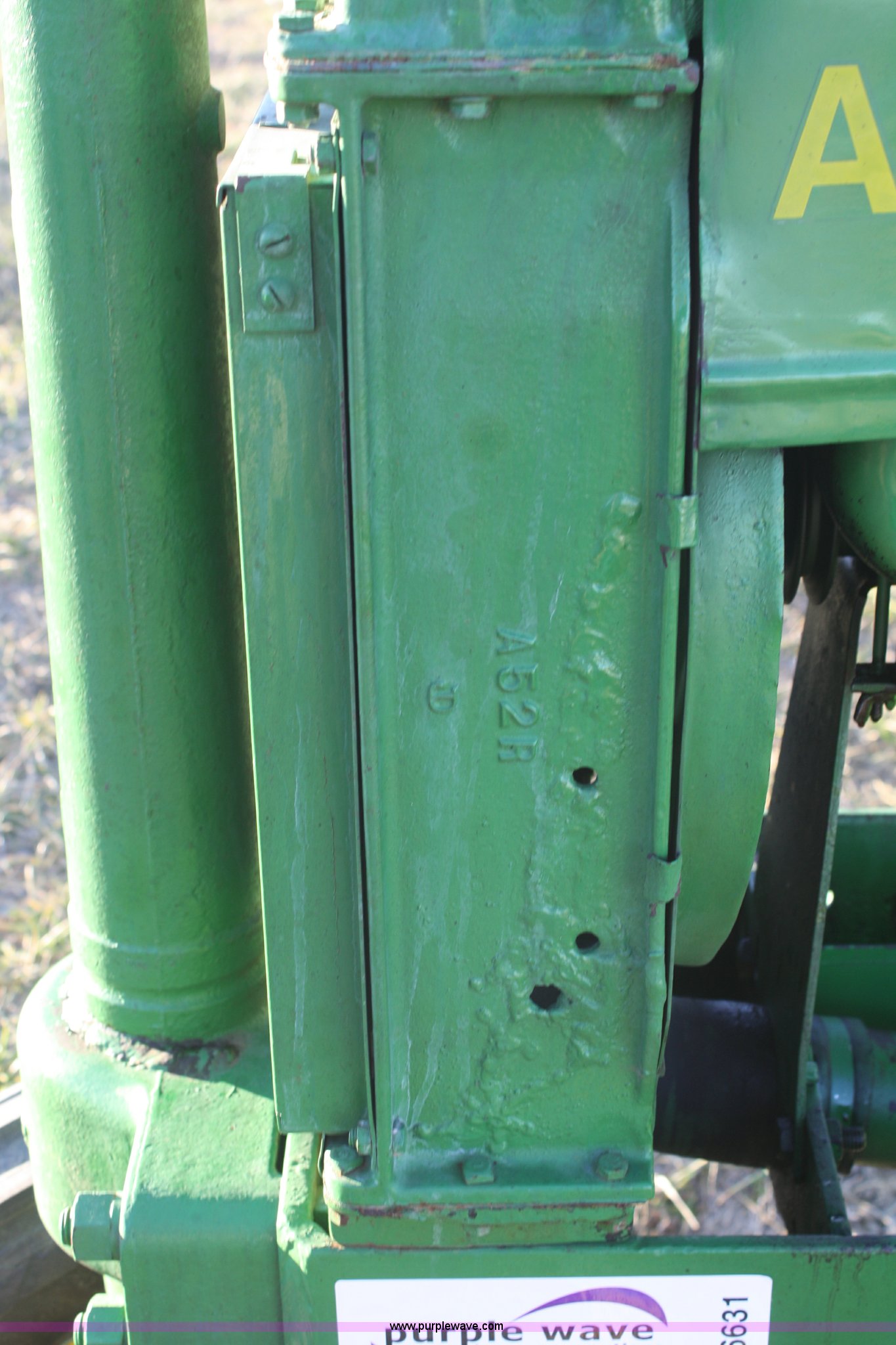 Purple Wave is selling a used Tractor in Kansas. This item is a 1937 John Deere Model A tractor with the following: Two cylinder gas engine, Four speed transmission, Behler overdrive, Shutters, 14.9-38 tires, Serial 458757