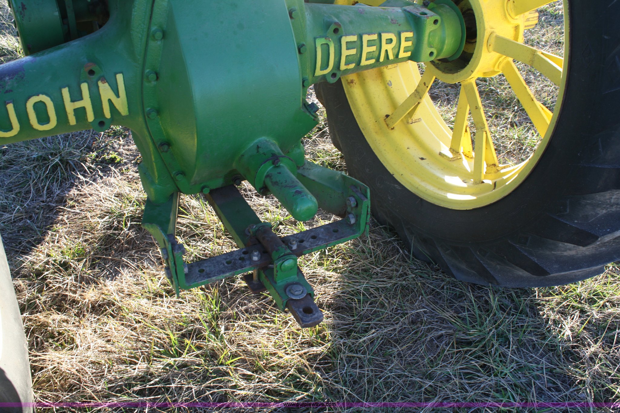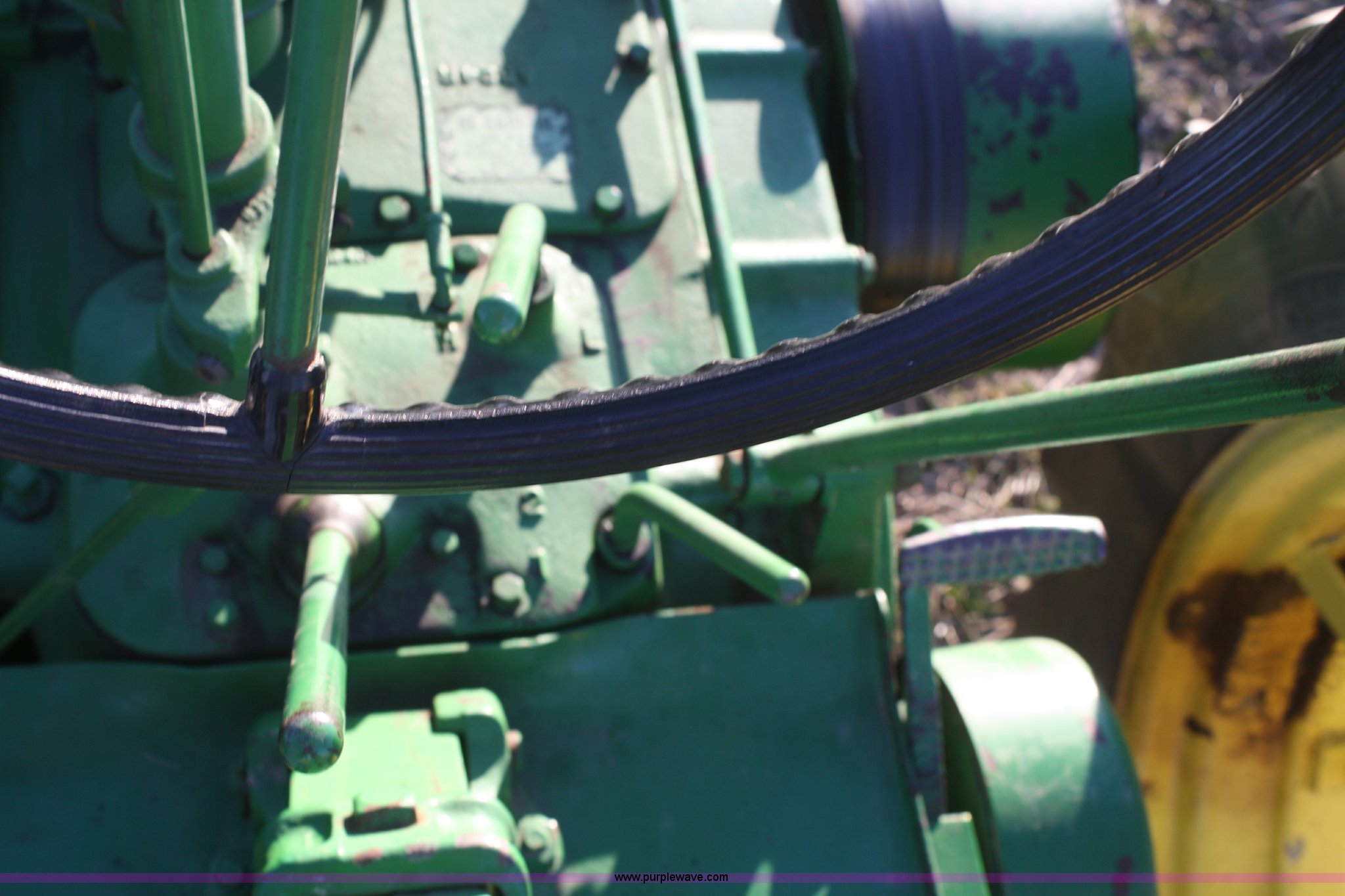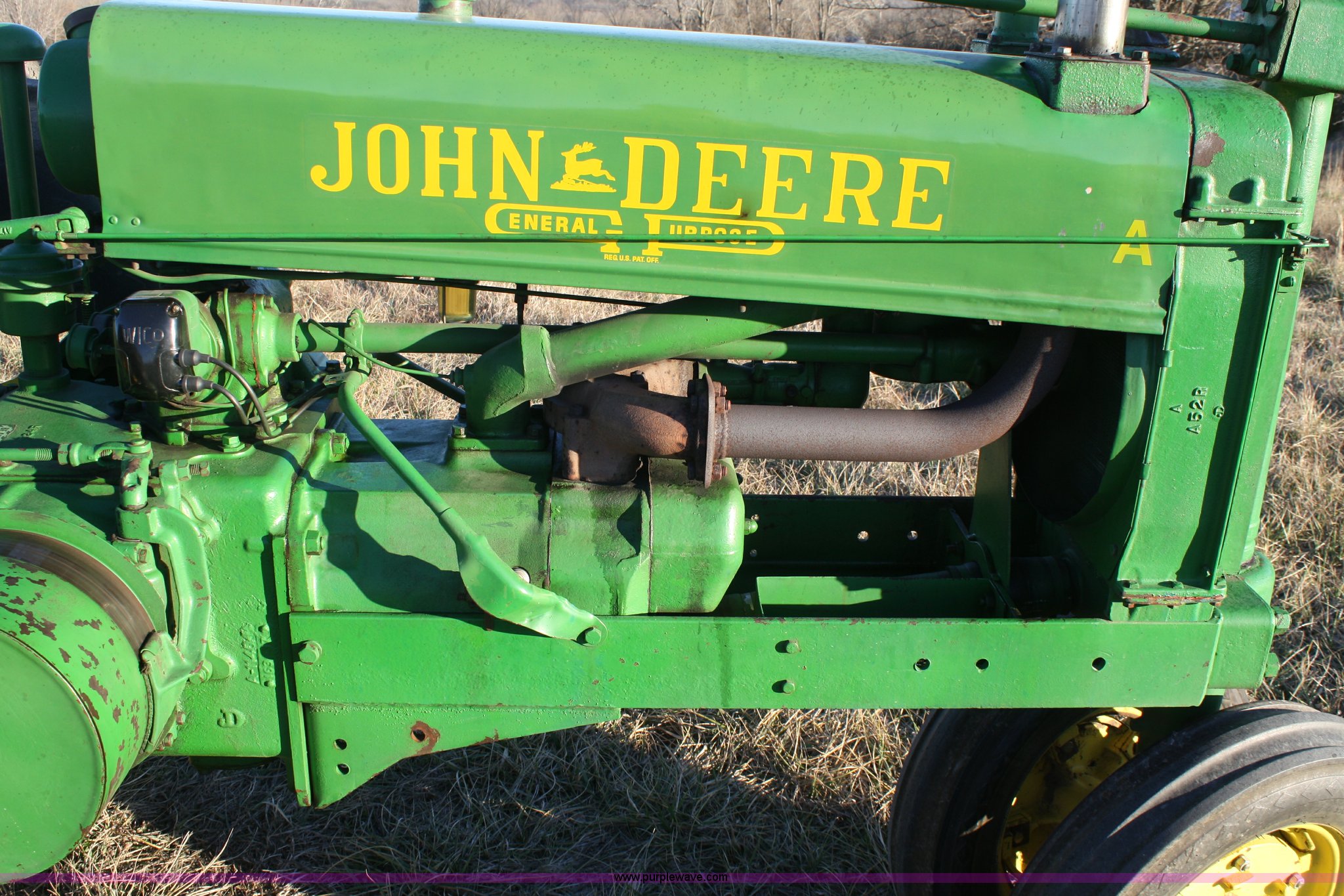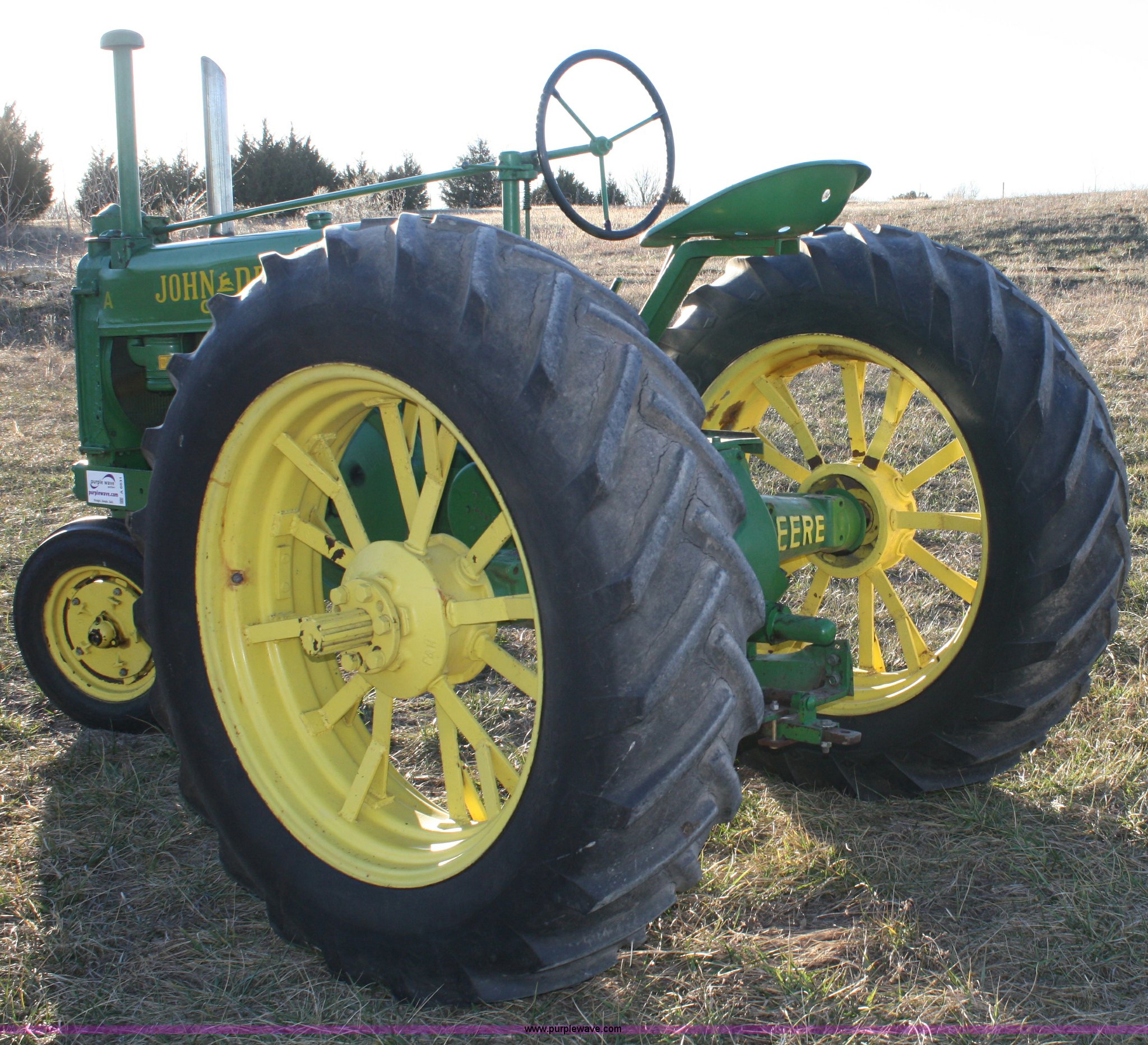 Purple Wave is selling a used Tractor in Kansas. This item is a 1937 John Deere Model A tractor with the following: Two cylinder gas engine, Four speed transmission, Behler overdrive, Shutters, 14.9-38 tires, Serial 458757