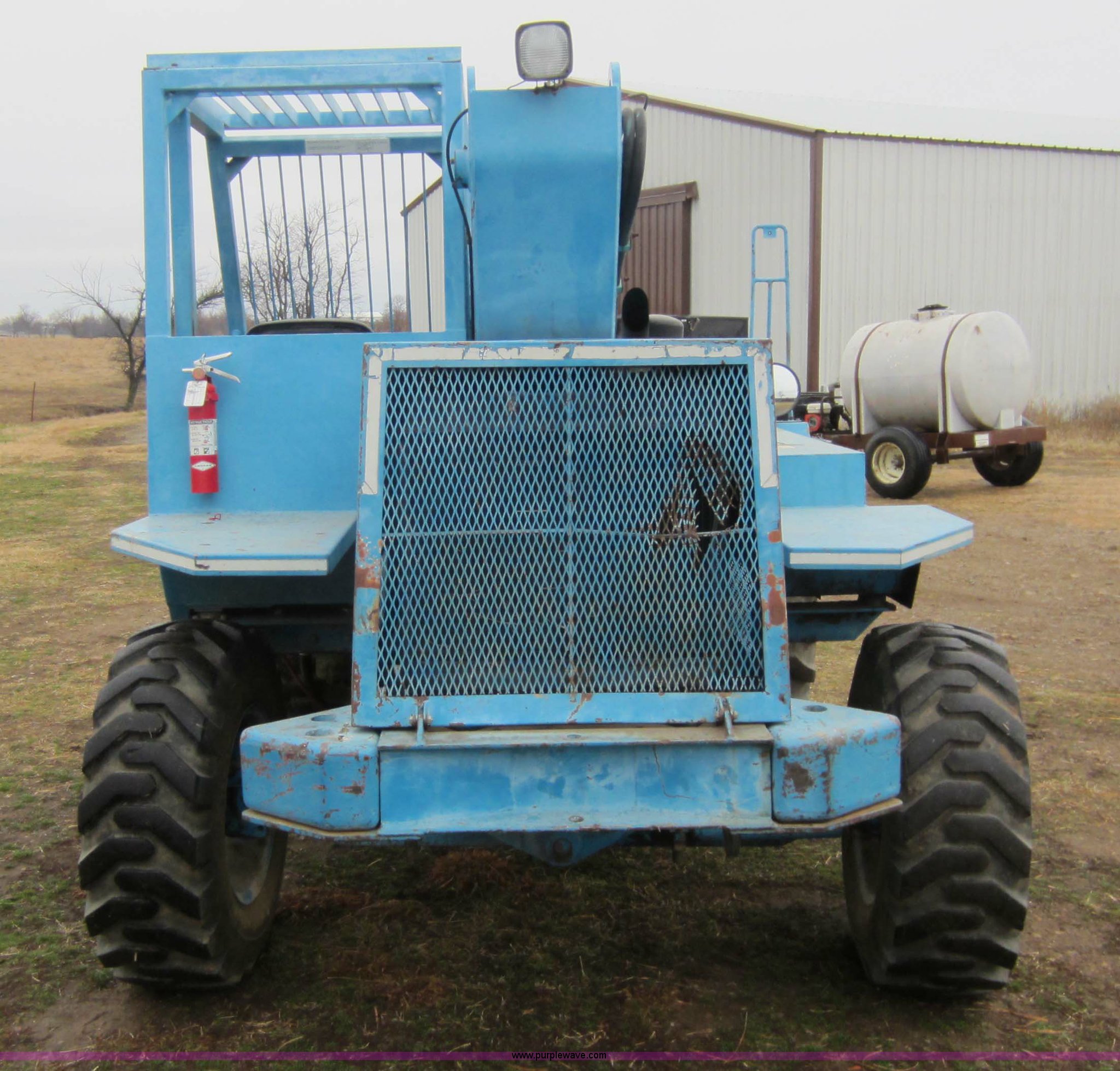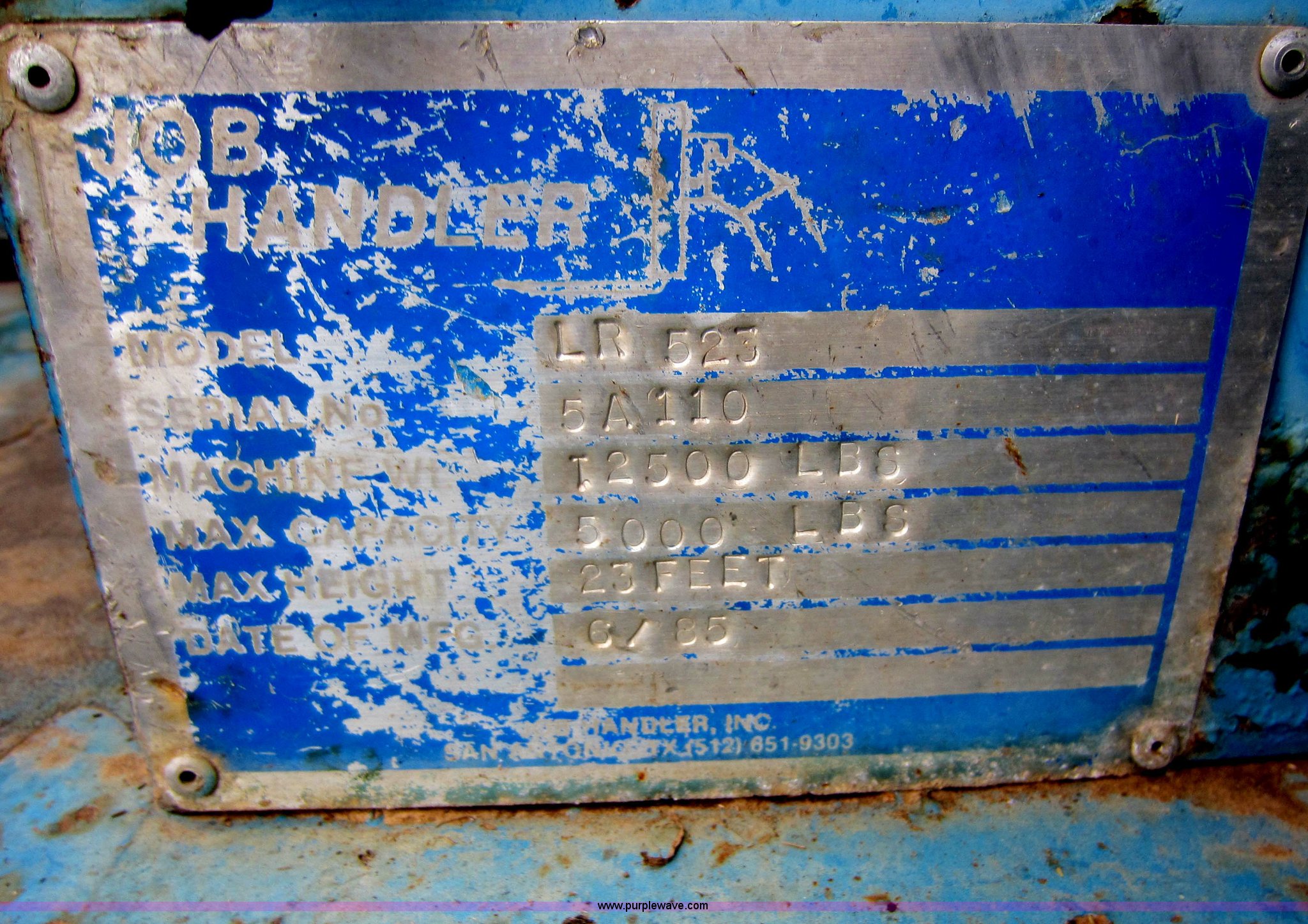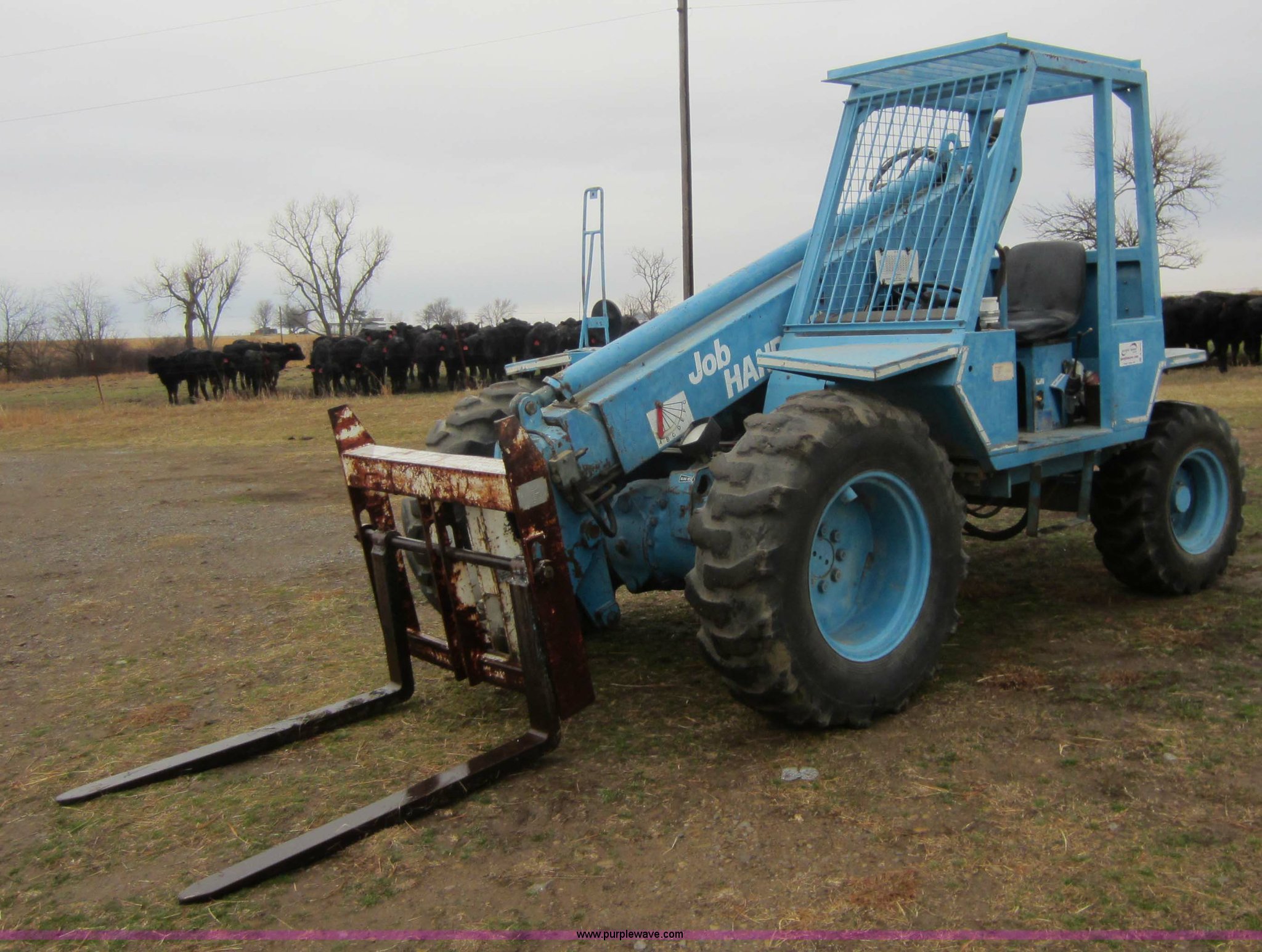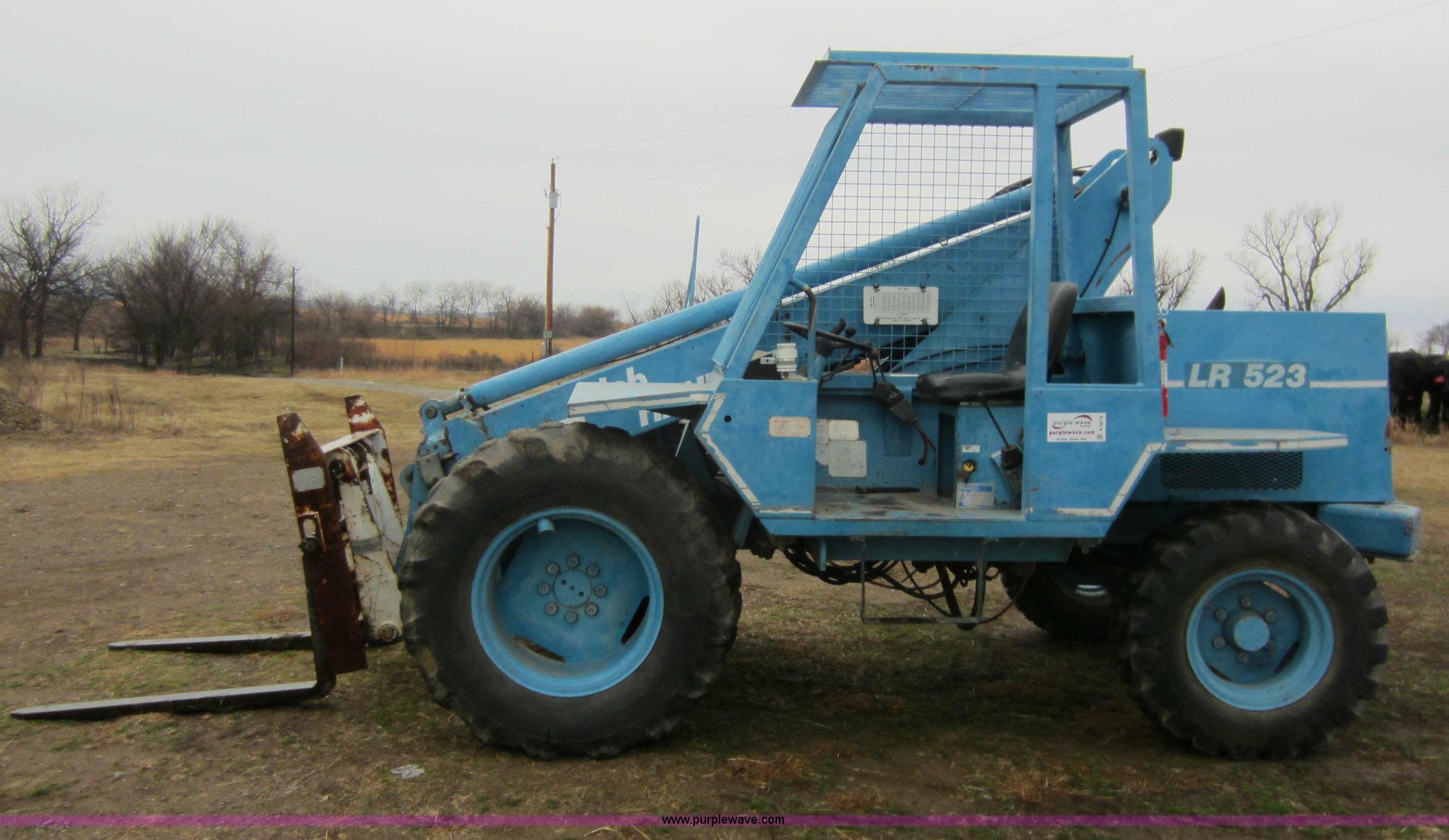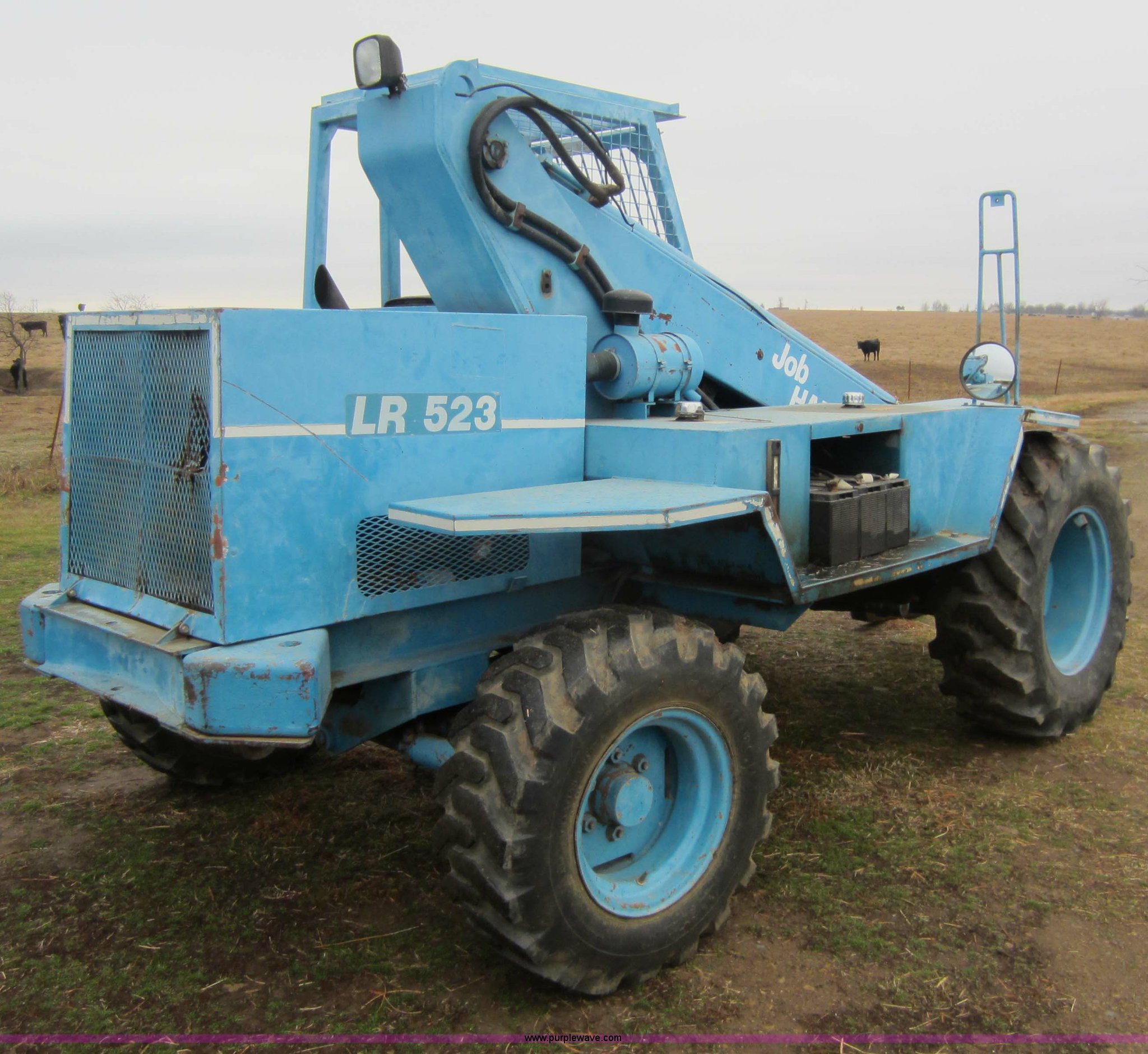 Purple Wave is selling a used Telehandler in Oklahoma. This item is a 1985 Job Handler LR523 telehandler with the following: 1,794 hours on meter, Four cylinder diesel engine, 23' max lift height, 5,000 lbs max capacity, 48" forks, Rear wheel steer, 12.5-80-18 tires, 12,500 lbs. base operating weight, Serial 5A110