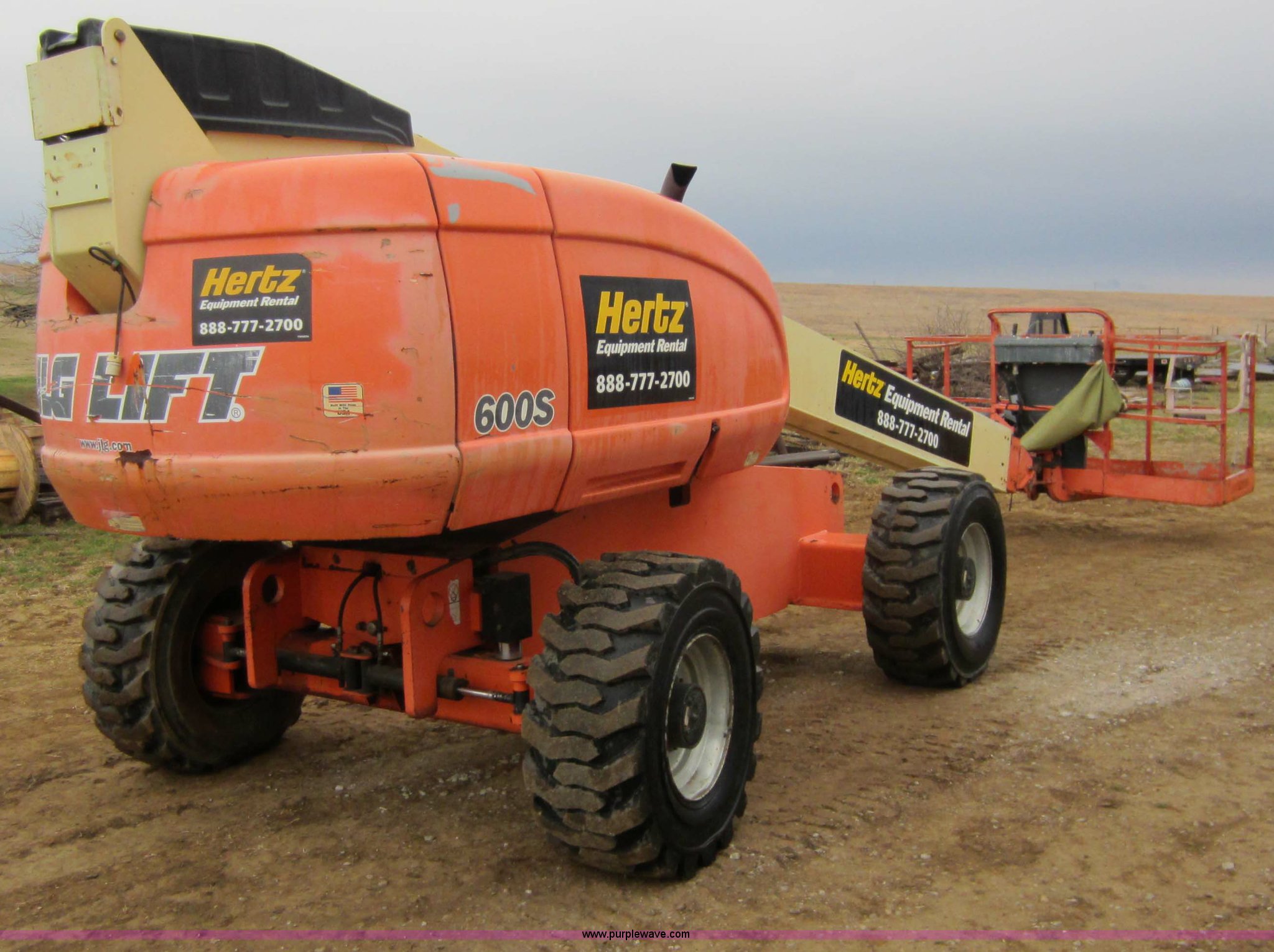 Purple Wave is selling a used Boom Lift in Oklahoma. This item is a 2004 JLG 600S boom lift with the following: 2,767 hours on meter, Duetz four cylinder diesel engine, 60' lift, 500 lbs unrestricted capacity, 1,000 lbs max capacity, Upper and lower controls, 15-19.5 tires, 22,455 lbs. base operating weight, Rebuilt upper boom controls, Serial 0300079328