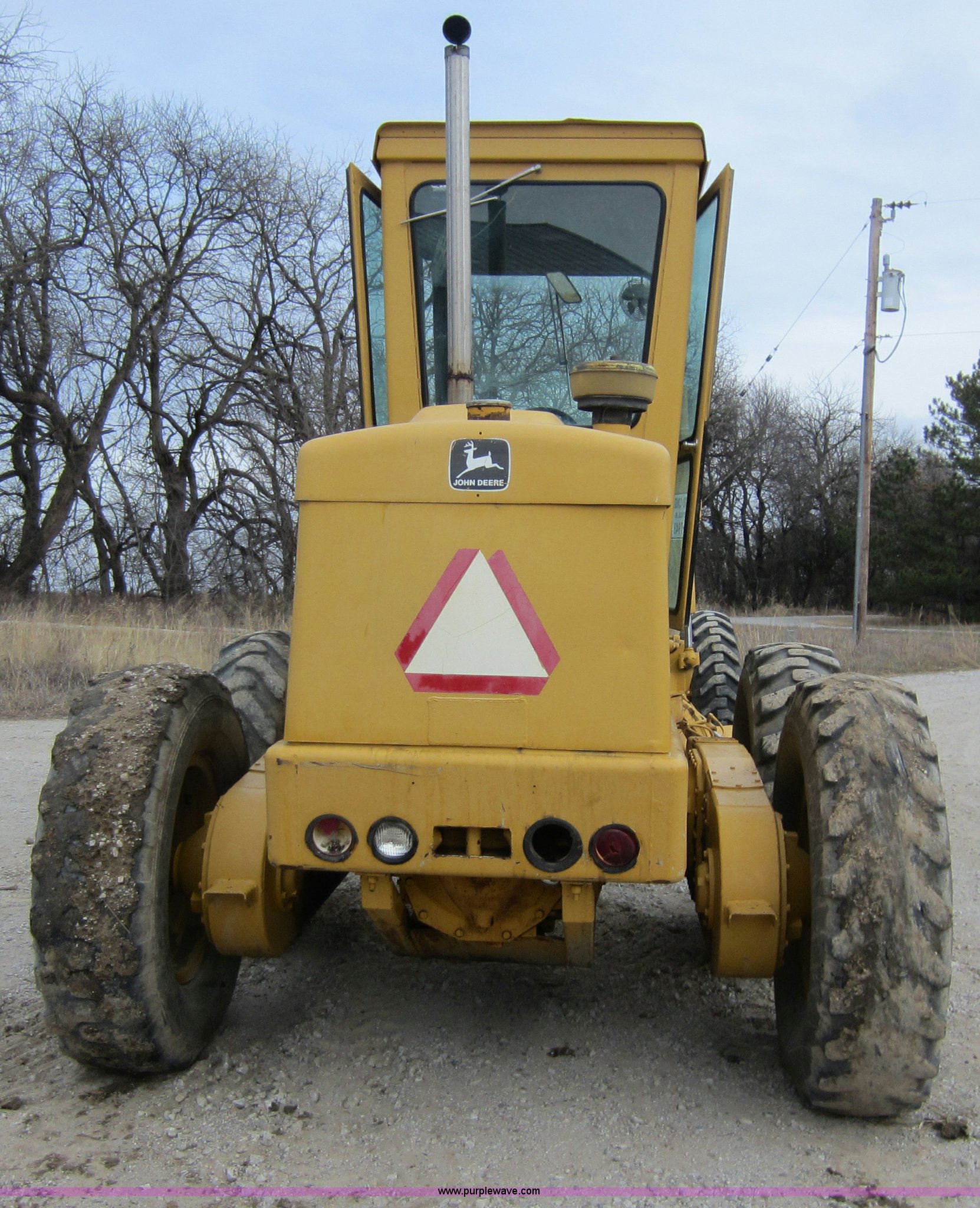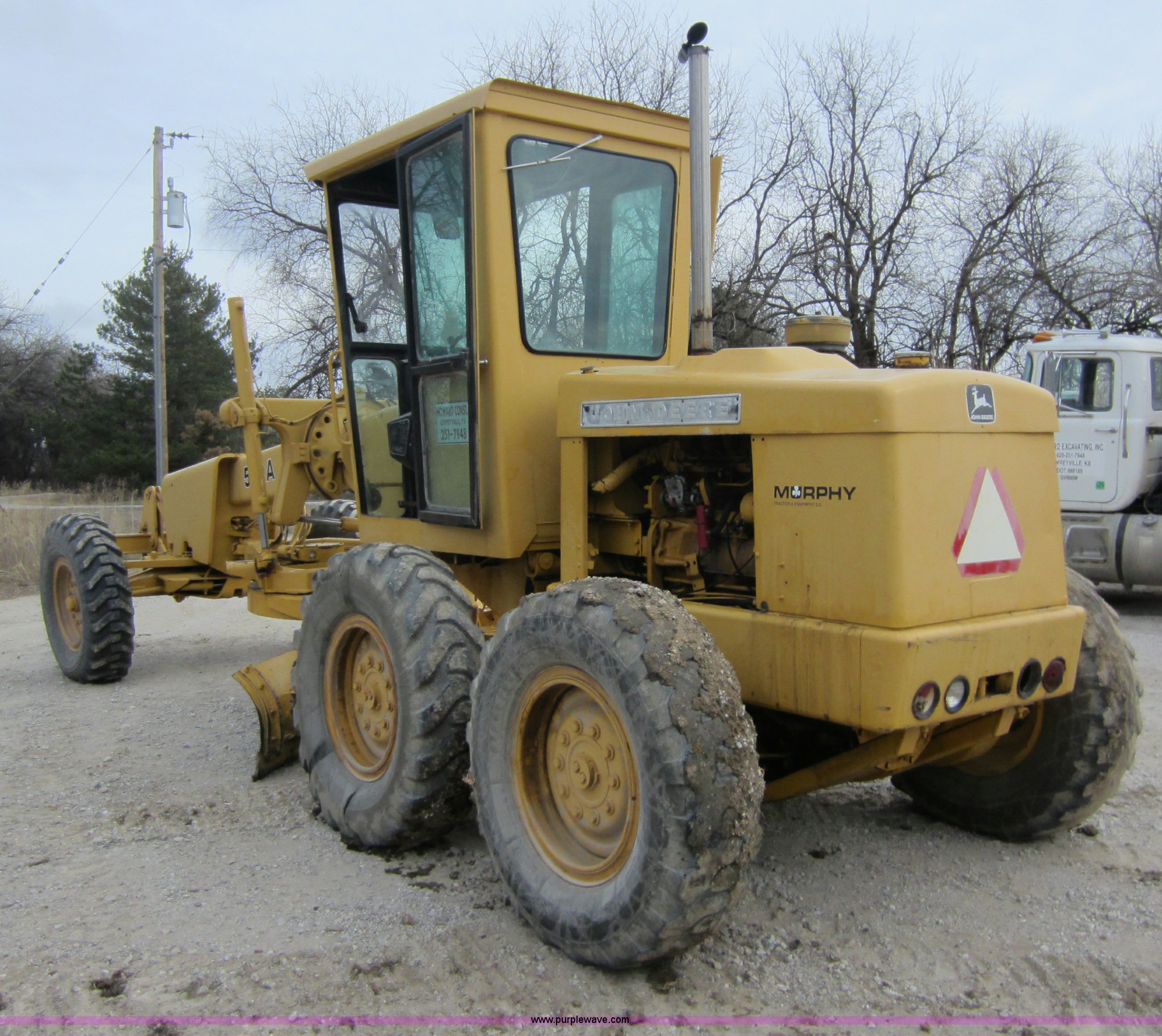 Purple Wave is selling a used Motor Grader in Kansas. This item is a 1980 John Deere 570A motor grader with the following: 644 hours on meter, John Deere 6329D six cylinder diesel engine, 85 HP, Serial 537684T, 8F-8R gears, 12' moldboard, Front scarifier, 13.00-24 tires, 21,703 lbs. base operating weight, Serial 09684T