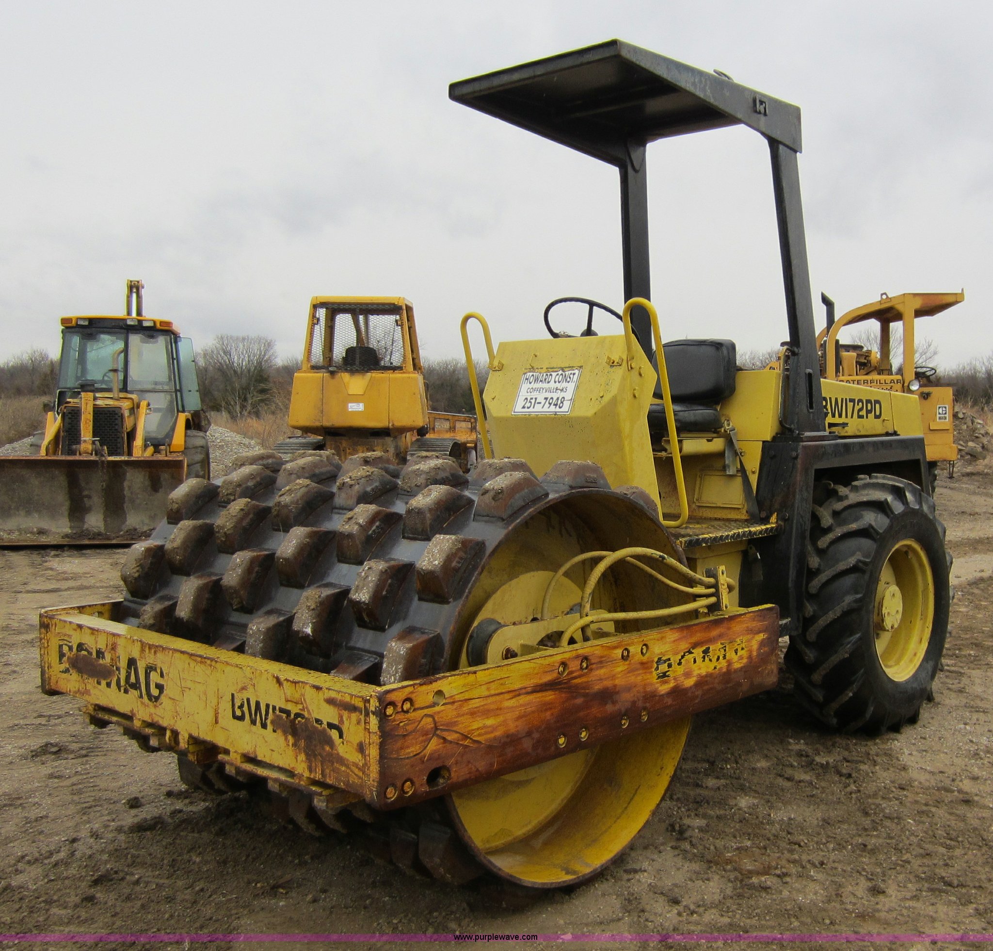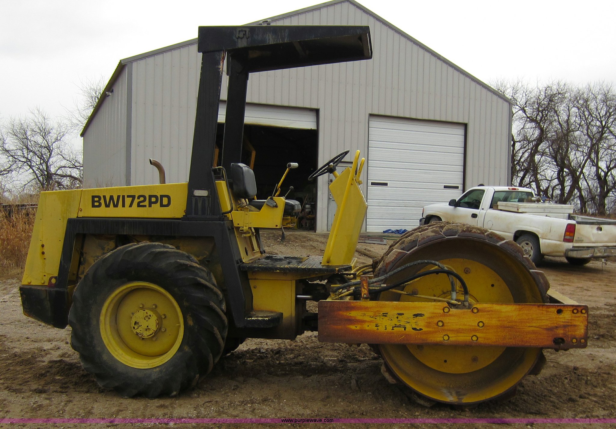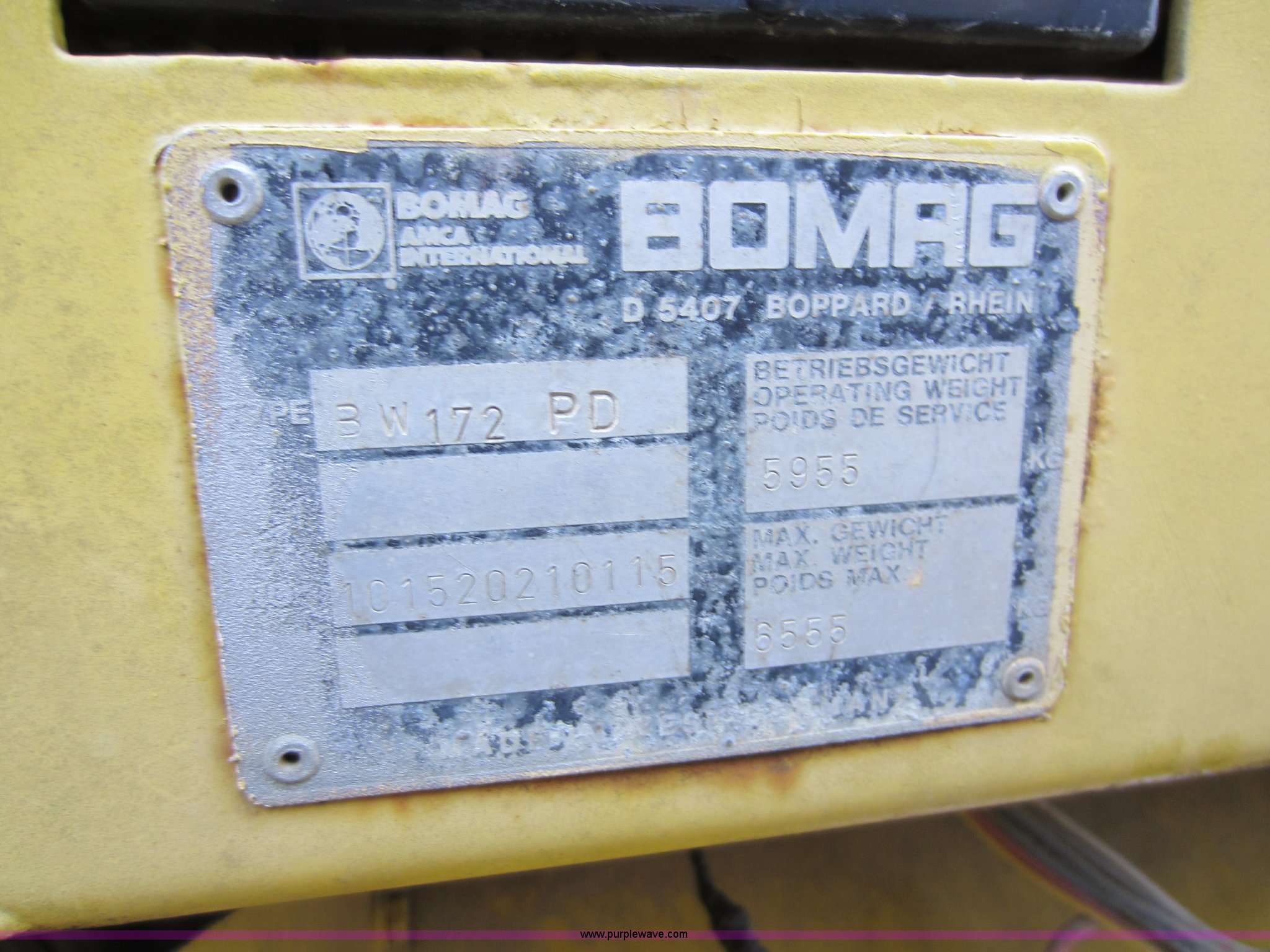 Purple Wave is selling a used Single Drum Roller Compactor in Kansas. This item is a Bomag BW172PD vibratory roller with the following: 5,155 hours on meter, Four cylinder diesel engine, Hydrostatic transmission, 4' diameter drum, 66" wide, 5,955 lbs lbs. base operating weight, 14.9-24 rear tires, Serial 101520210115
