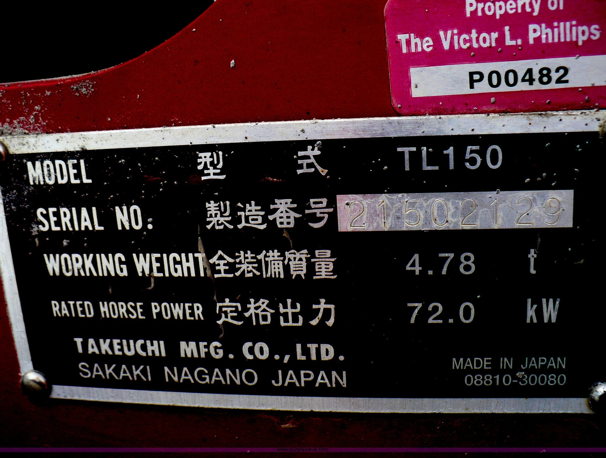 Purple Wave is selling a used Tracked Skid Steer Loader in Missouri. This item is a 2005 Takeuchi TL150 skid steer with the following: 4,920 hours on meter, Yanmar four cylinder diesel engine, 97 HP, Two speed transmission, Open ROPS, Hand controls, 75"W toothed bucket, 18"W tracks, Auxiliary hydraulics, 10,802 lbs. base operating weight, Service records available, Serial 21502129