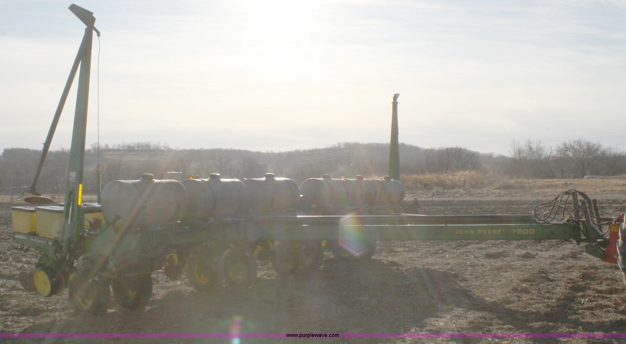 Purple Wave is selling a used Planter in Kansas. This item is a John Deere 7200 12 row planter with the following: 30" spacing, (2) John Blue squeeze pumps, (6) 70 gallon fertilizer tanks, Row cleaners, Double disk fertilizer openers, Corn and bean meters, Markers, Two point hitch, Population monitor with GPS, Speed sensor, Serial A07200C400339