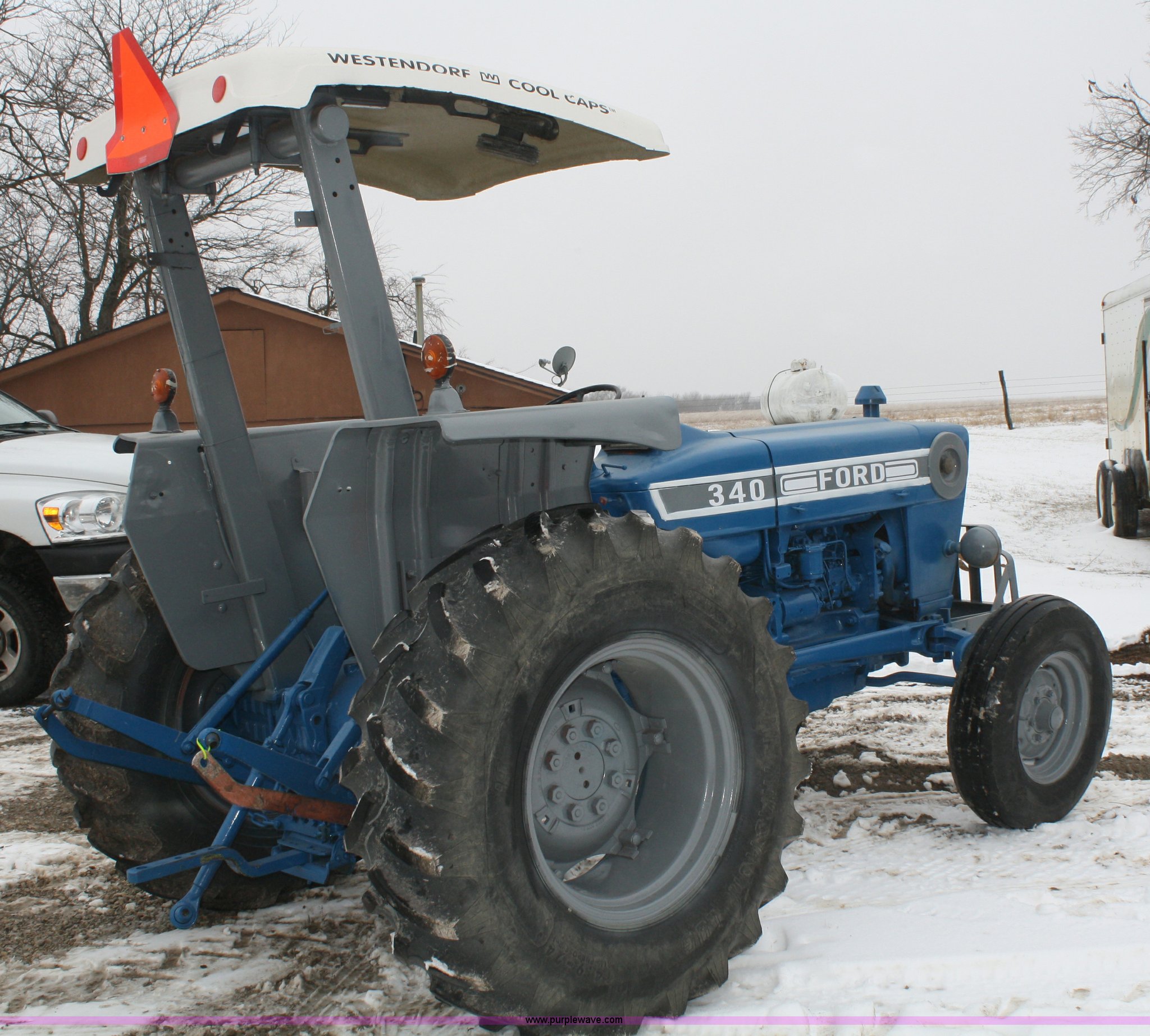 Purple Wave is selling a used Tractor in Kansas. This item is a 1989 Ford 340 industrial tractor with the following: 3383 hours on meter, Ford three cylinder, 2.9L diesel engine, Eight speed manual transmission, Eight forward, Two reverse, 540 PTO, Three point, Draw bar, Differential lock, 16 gallon fuel tank, Westendorf Cool Cap canopy, 14.9-24 rear tires, 7.50-16 front tires, Calcium in rear tires, Fresh paint, Serial C610900