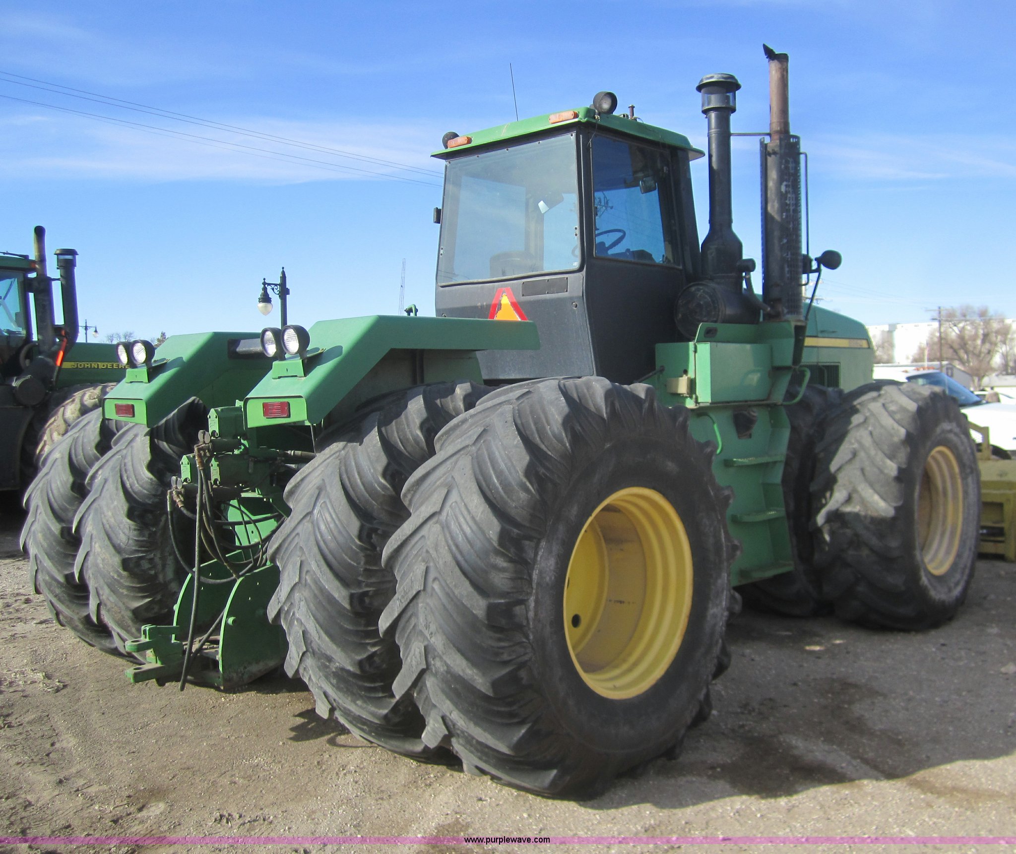 Purple Wave is selling a used Articulated 4-Wheel Drive Tractor in Kansas. This item is a 1990 John Deere 8960 4WD tractor with the following: 500 hours on meter, Actual hours unknown, Cummins NTA-855 diesel engine, 322 engine horse power, Full Powershift transmission, 12F-2R gears, AC and heat, Tilt, Spring ride seat, Cobra CB radio, Draw bar, (3) rear hydraulic remote sets, 650/75R32 tires, Serial RW8960P001916