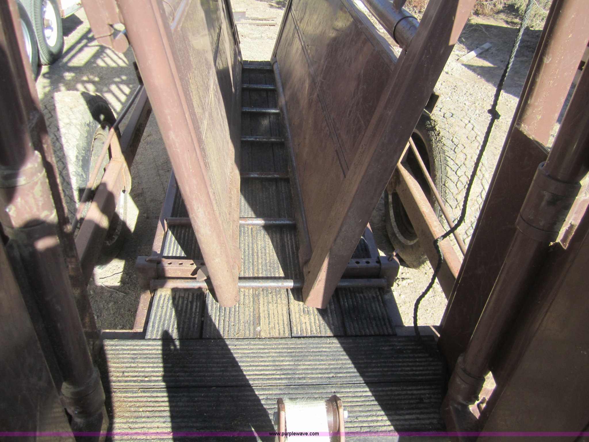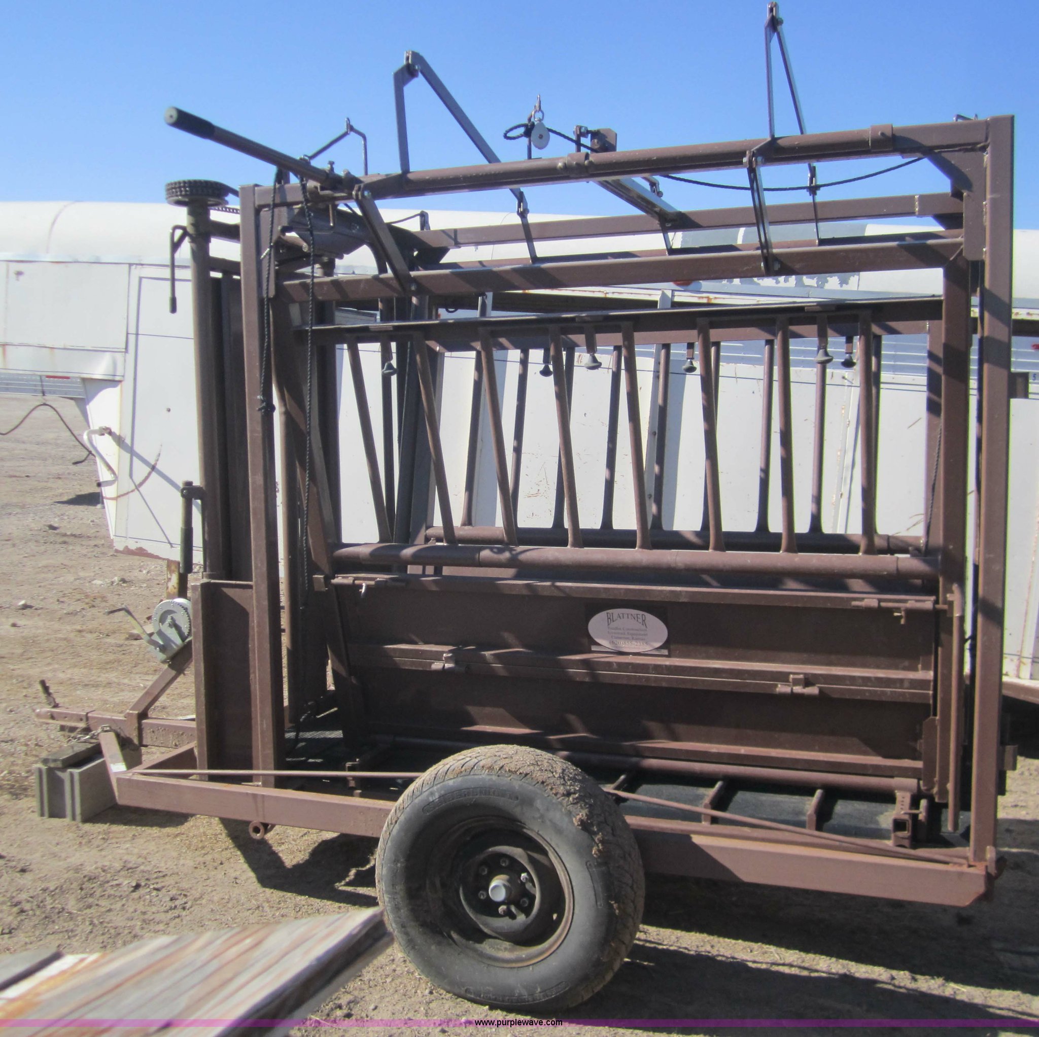 Purple Wave is selling a used Livestock Equip. in Kansas. This item is a Blattner portable squeeze chute with the following: 2" ball hitch, P235/75R15 tires, Self catch head gate, Removable bottom panels, Right side exit gate, Drop down end gate, Adjustable bottom width, Removable trailer, Rubber flooring