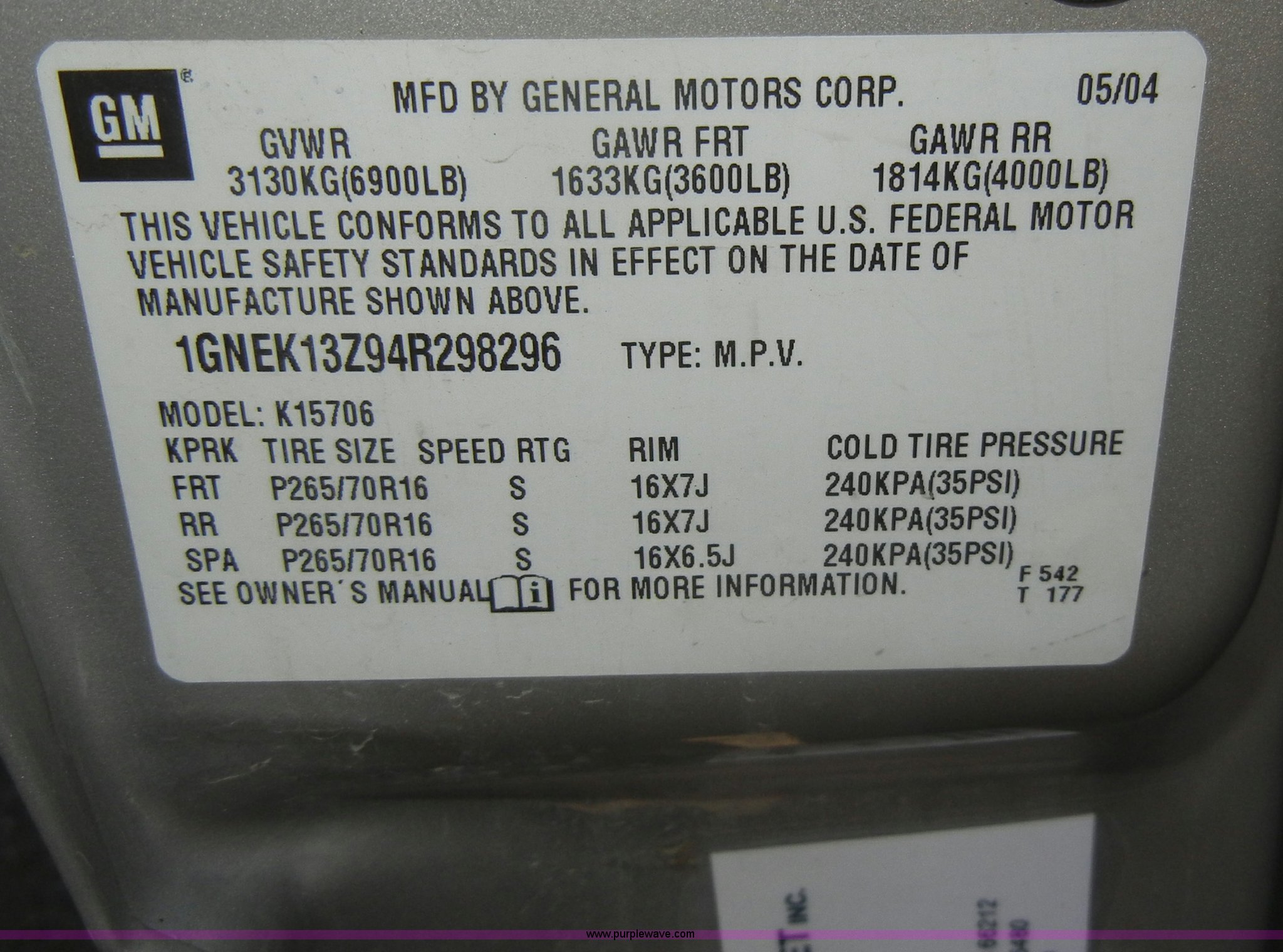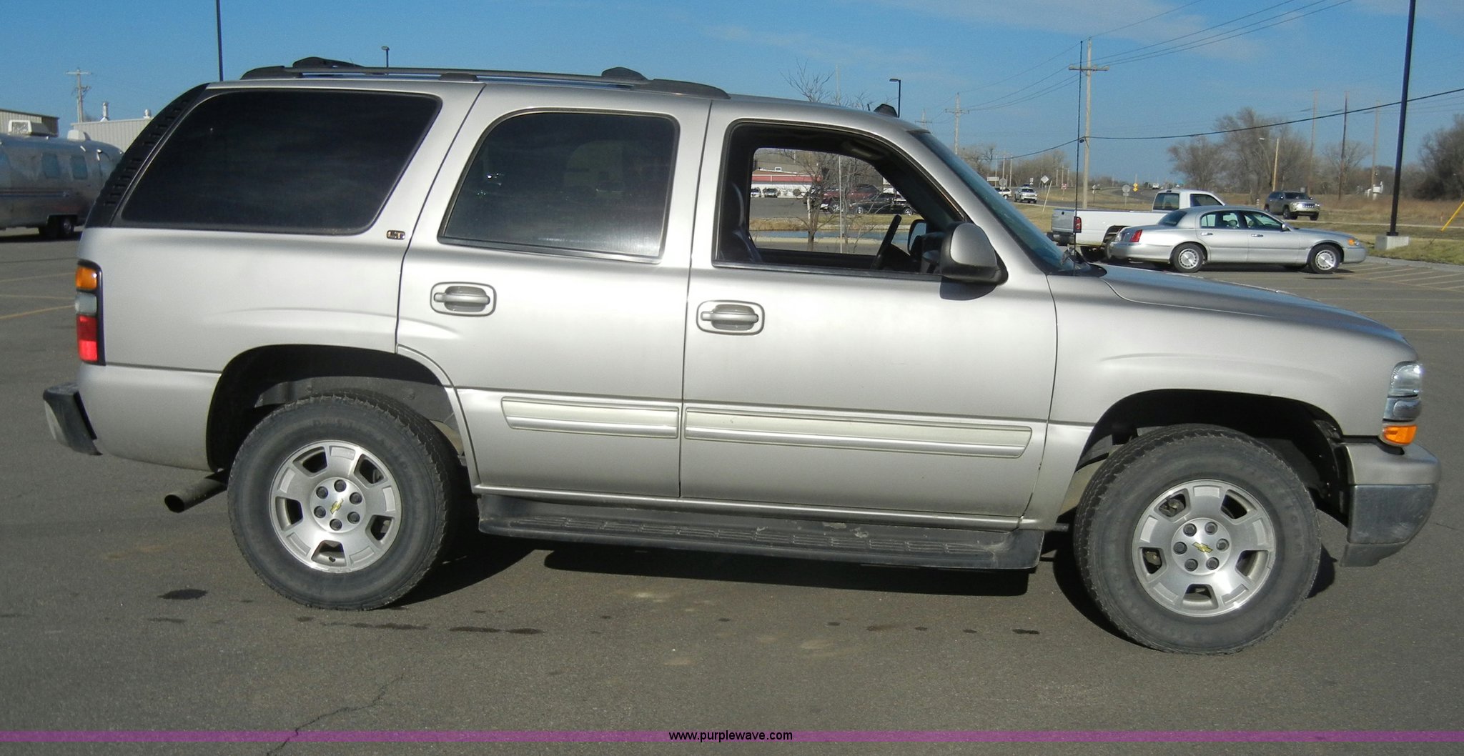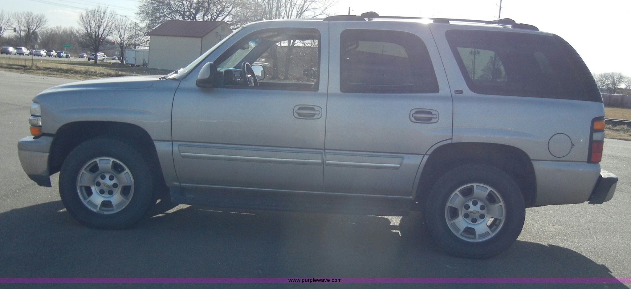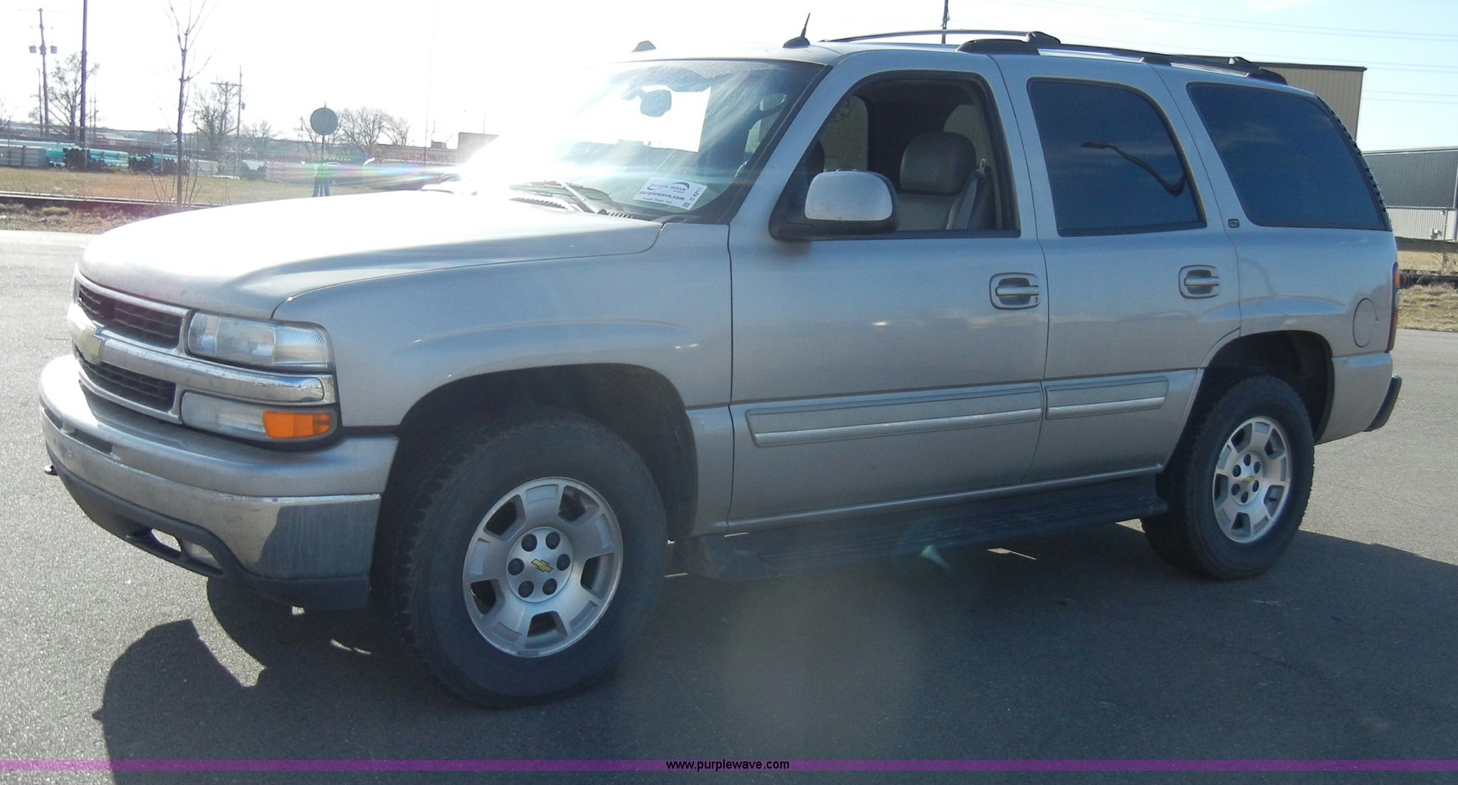 Purple Wave is selling a used Passenger Vehicle in Kansas. This item is a 2004 Chevrolet Tahoe 1500 LT SUV with the following: 163,443 miles on odometer, 5.3L V8 SFI engine, Automatic transmission, Four wheel drive, Tow/haul package, AC and heat, Tilt, Cruise, AM/FM/CD, Power windows, locks, mirrors, and seats, Heated seats, Vinyl interior, Third row seating, Sunroof, Radio control on wheel, Compass and temp display, Running boards, Front tow hooks, Receiver hitch, Trailer wiring, 265/70R17 tires, Tire monitor light on