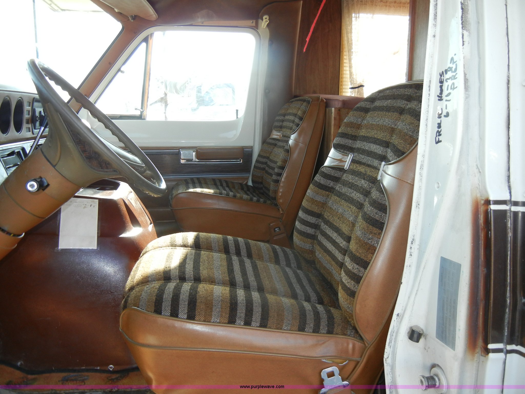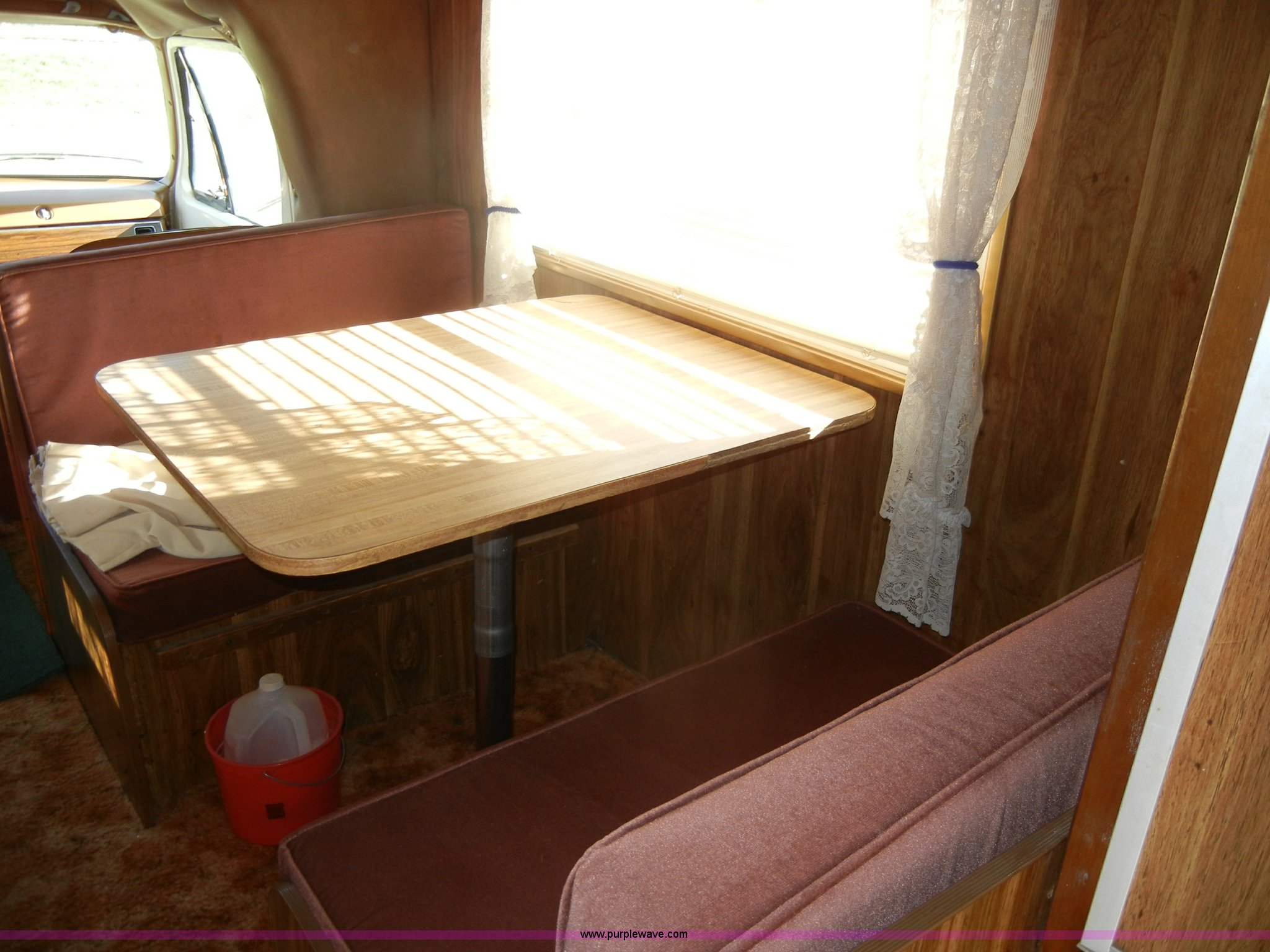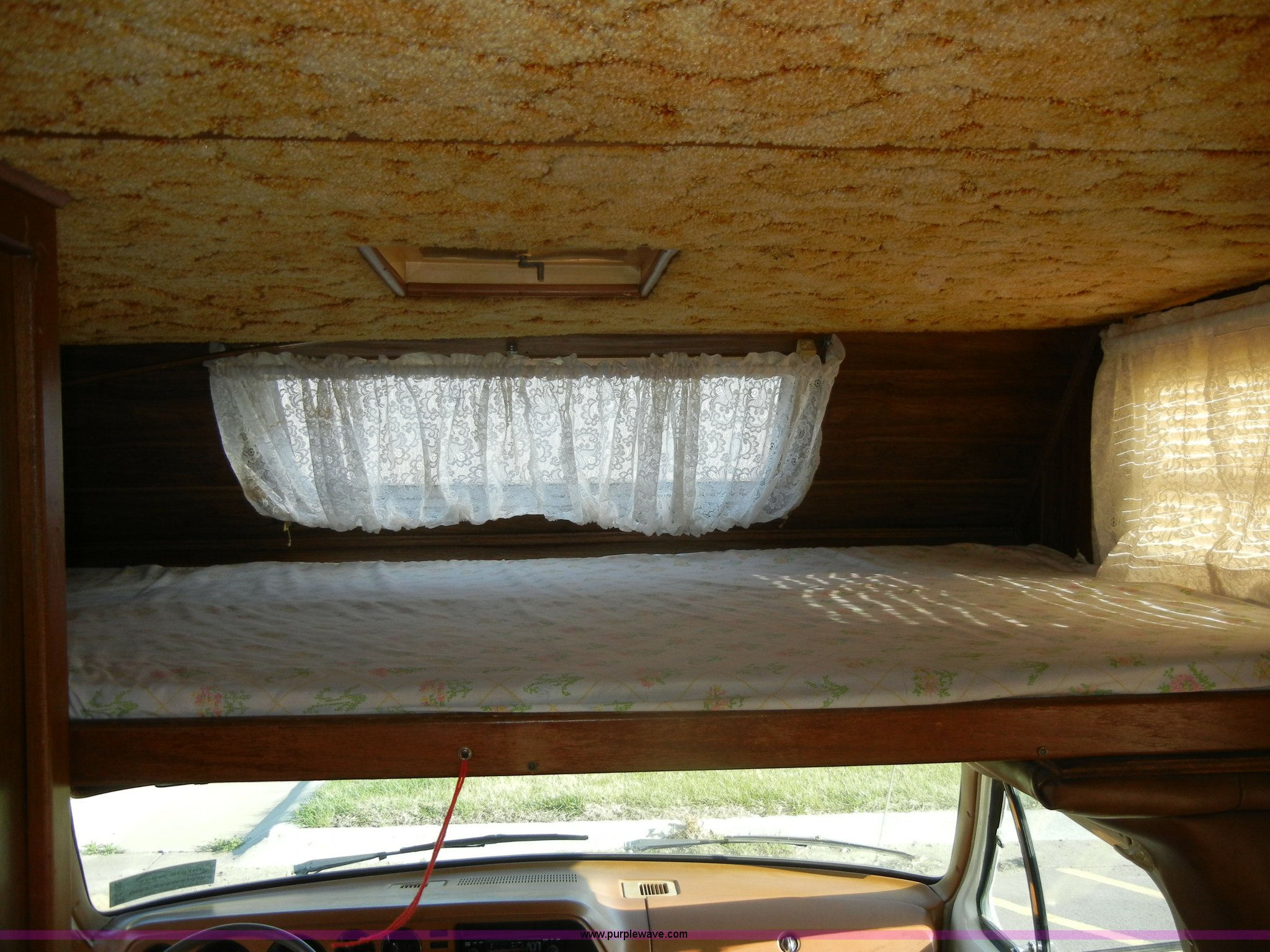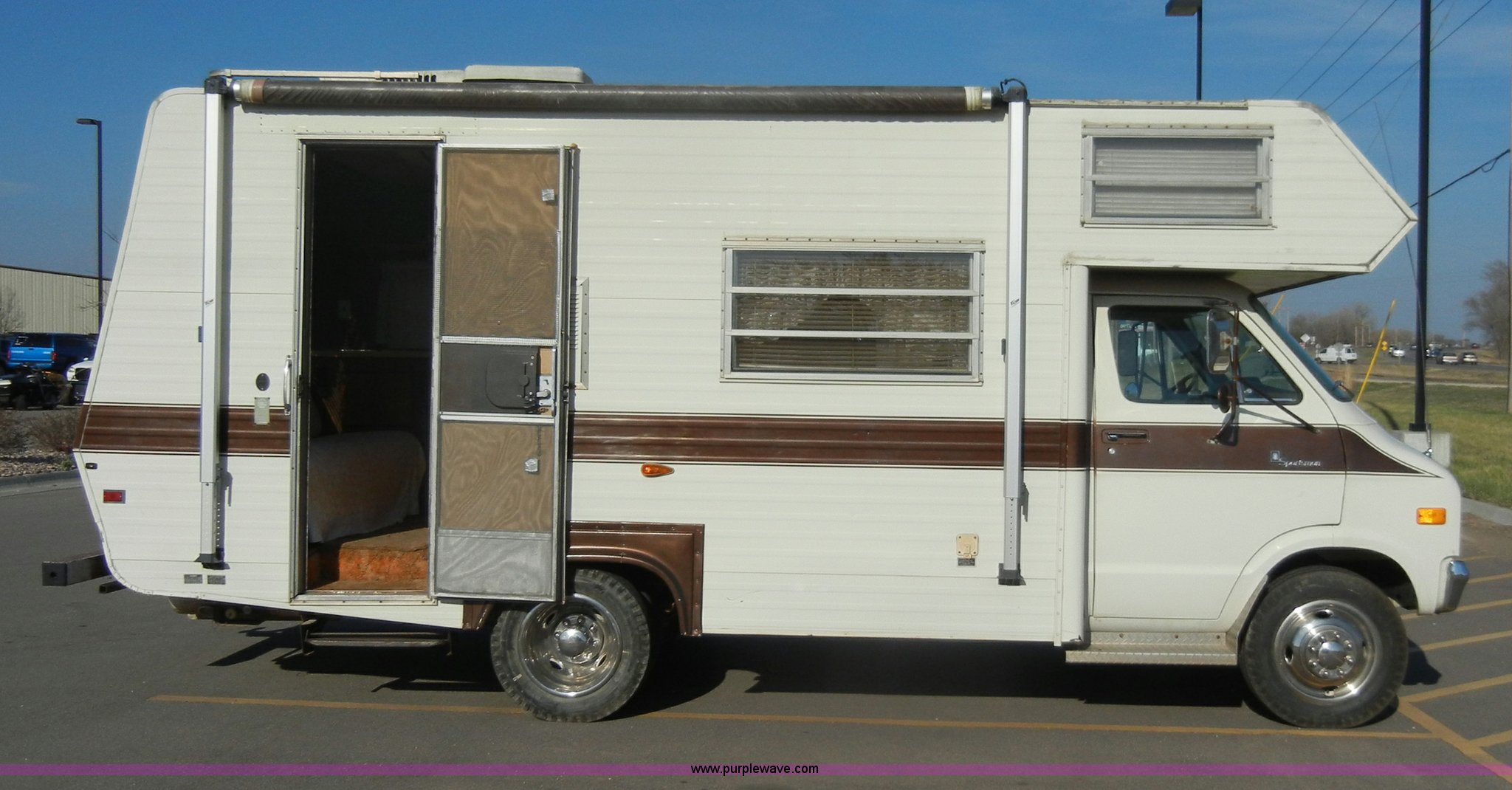 Purple Wave is selling a used RV in Kansas. This item is a 1978 Dodge Sportsman RV camper with the following: 61,702 miles on odometer, Gas engine, Automatic transmission, AC and heat, AC low on fluid, AM/FM/Cassette, Cloth seats, 9'8"H overall, Water connection, Six gallon water heater, Overhead canopy, Carpeted floor and ceiling, Fold down couch to bed, New microwave, Magic Chef fridge, sink, stove, Table with two bench seats, Toilet and shower, Over cab bunk bed, Overhead storage, DuoTherm AC/heat unit, Onan generator, 278 hours on meter, Remote start inoperable, Recently replaced battery, Ball hitch, 8.00-16.5 tires, Exterior cosmetic damage, Fuel gauge inoperable