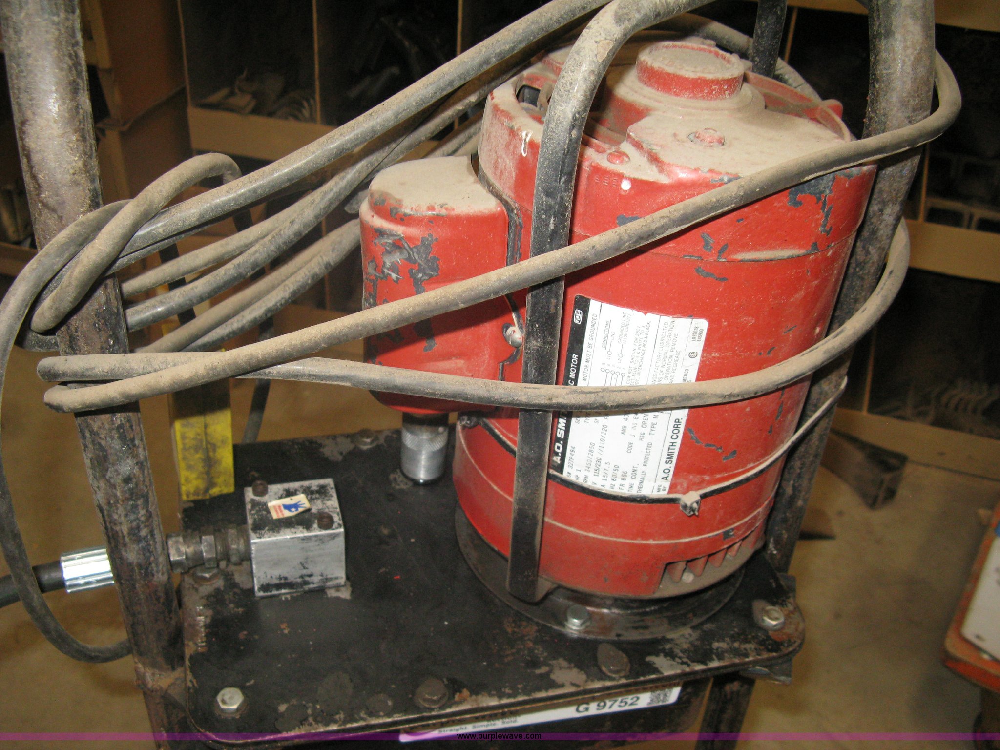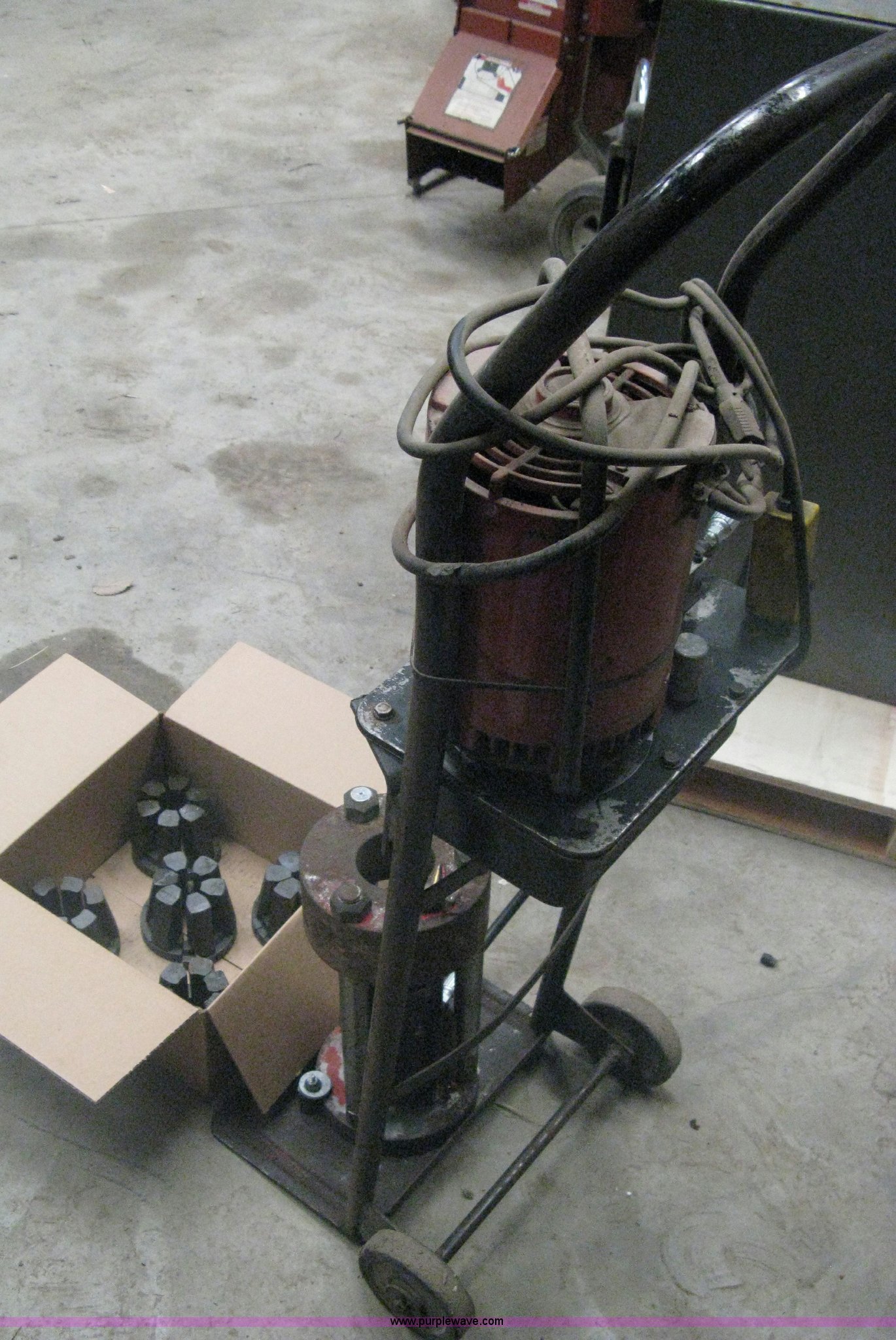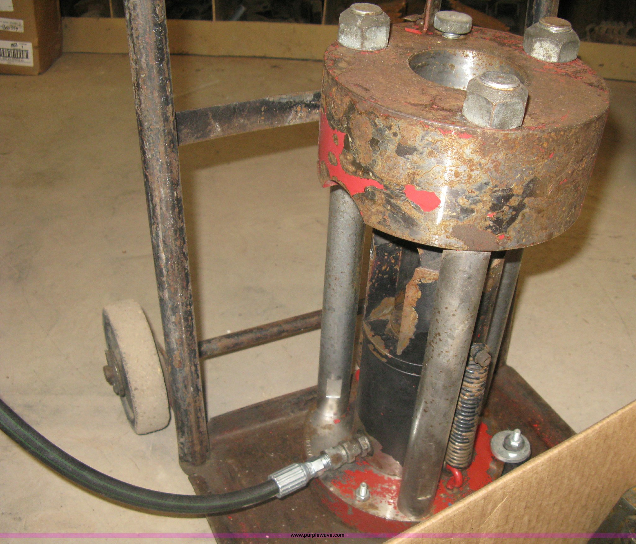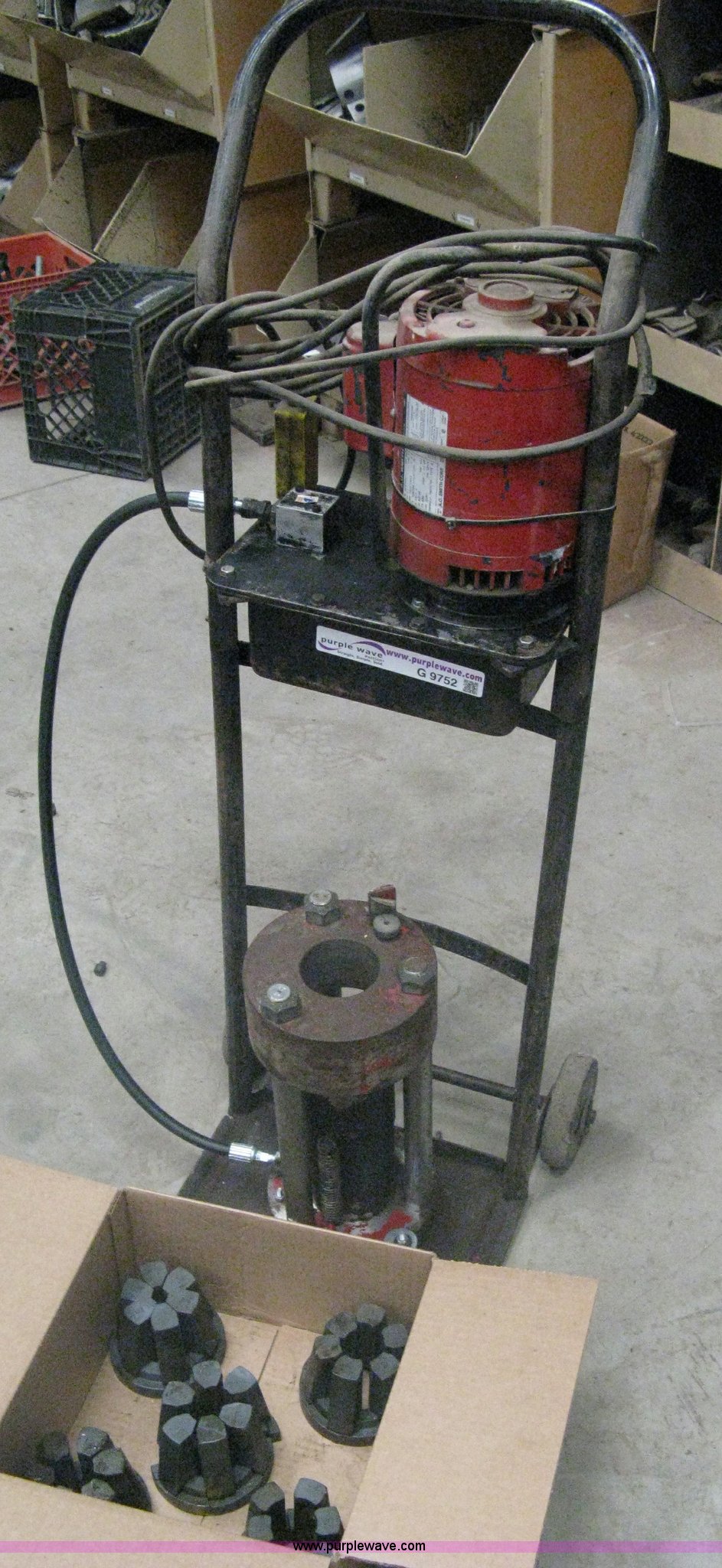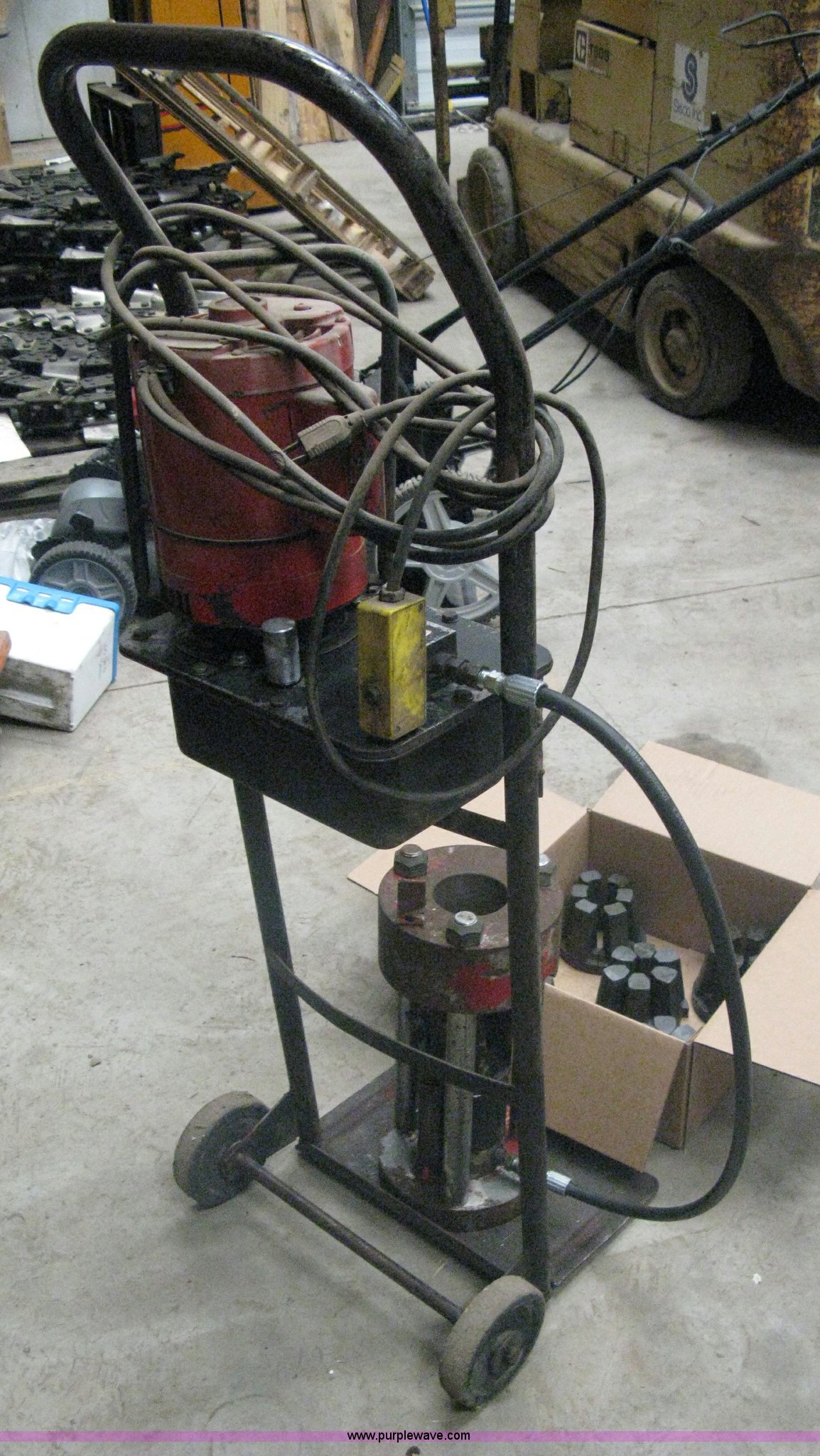 Purple Wave is selling a used Tools in Kansas. This item is a Hydraulic hose machine with the following: A.O. Smith 1 HP electric motor, Dolly mounted press, Dies