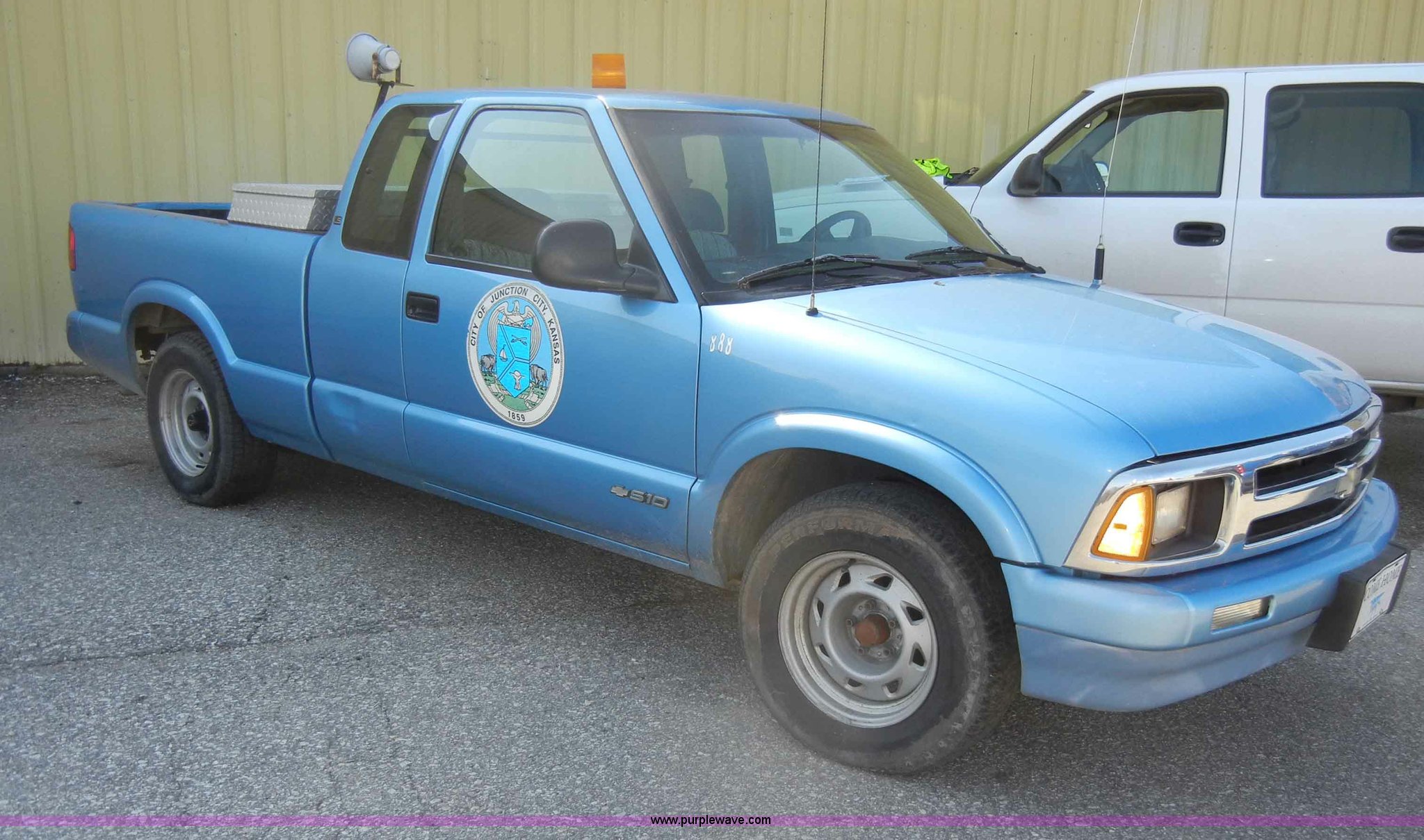 1997 Chevrolet S10 LS extended cab pickup truck. 114,671 miles on odometer, 4.3L V6 CPI engine, Automatic transmission, AC and heat, Tilt, Cruise, AM/FM, Manual windows and locks, Cloth interior, Toolbox, Ball hitch, Trailer wiring, 225/70R15 tires, CB unit not included, Interior/exterior cosmetic damage, Dents, Unit# 888. 1GCCS19X7V8176033. City of Junction City. 2324 N Jackson. Junction City, KS 66441