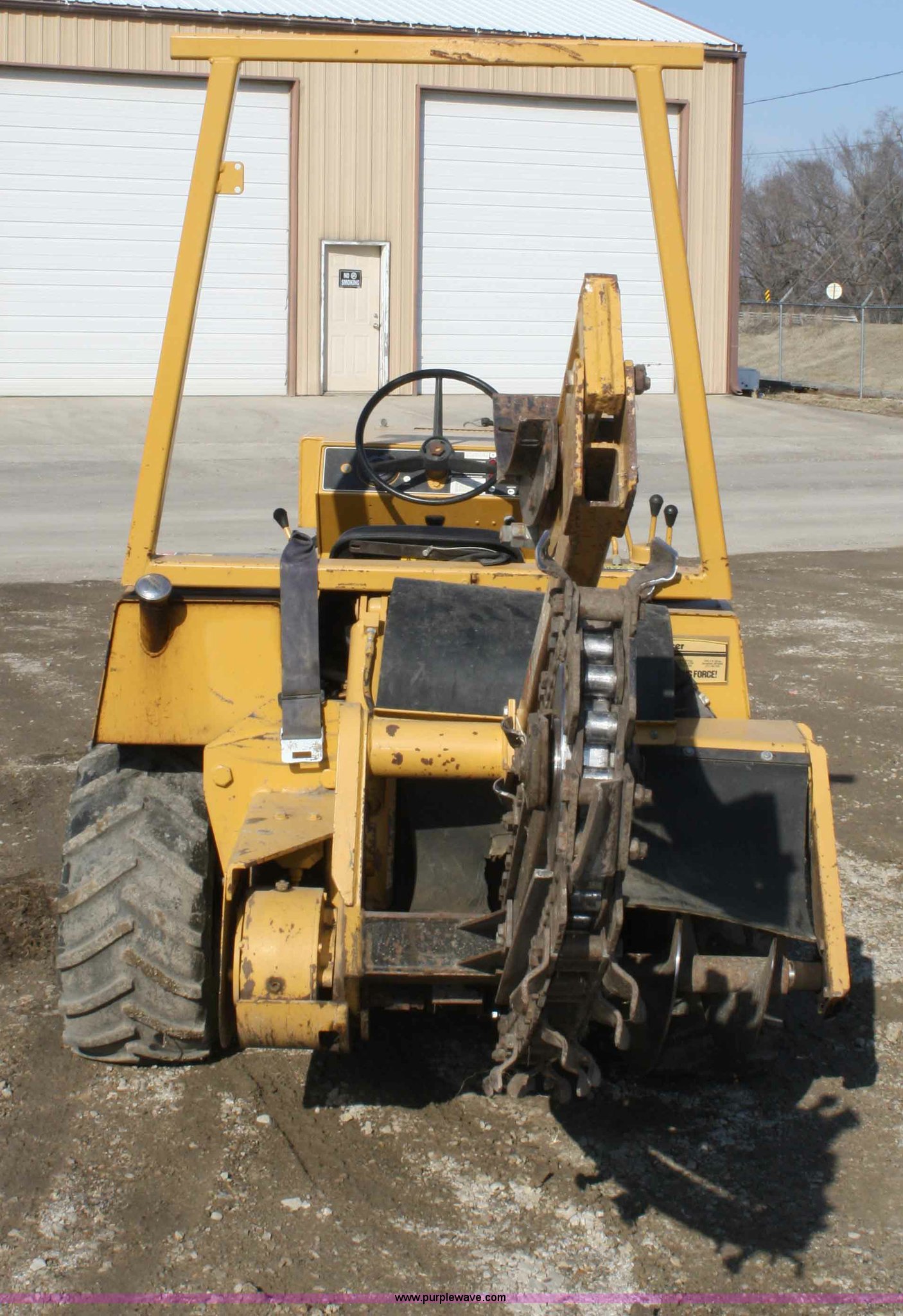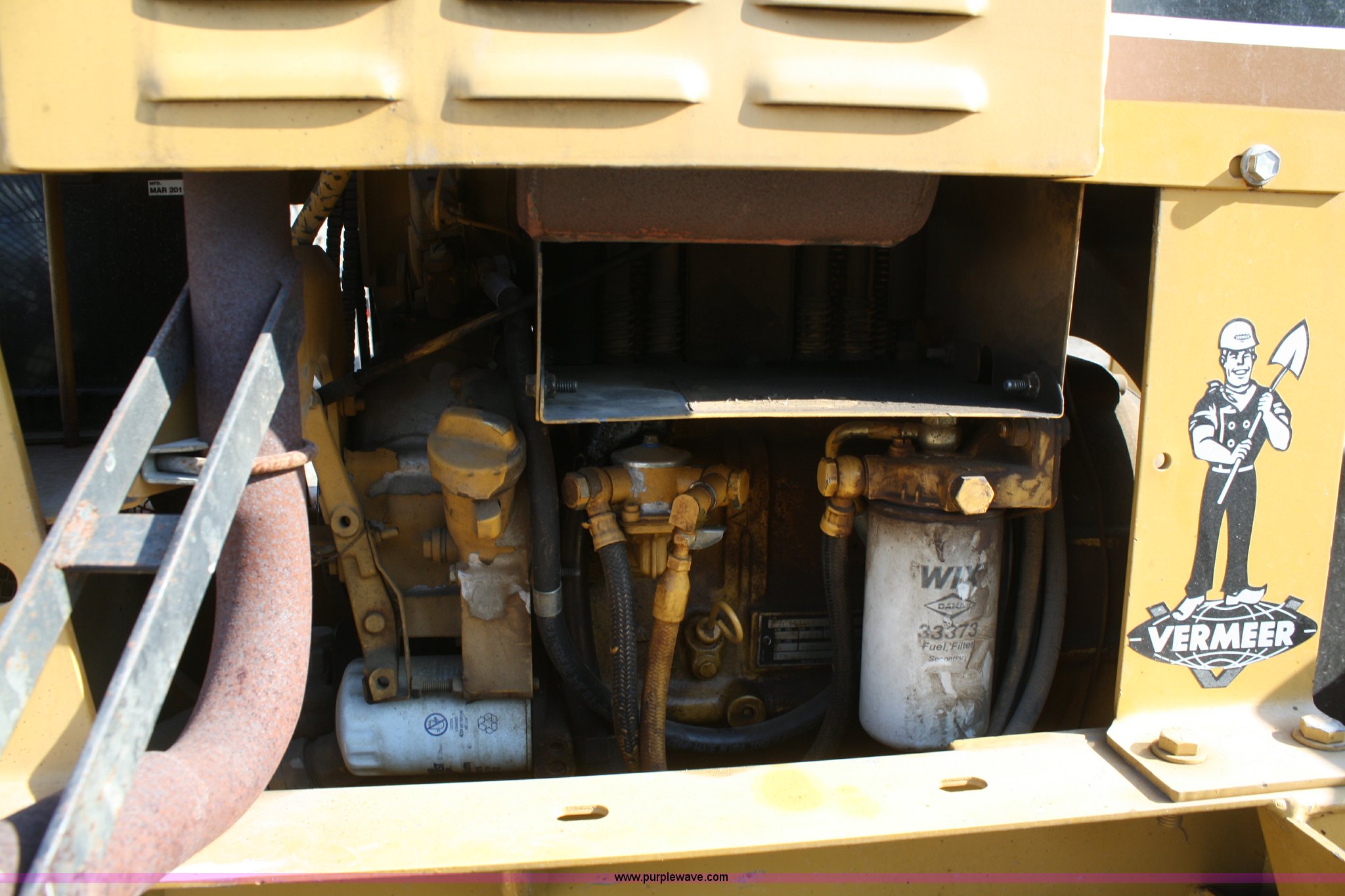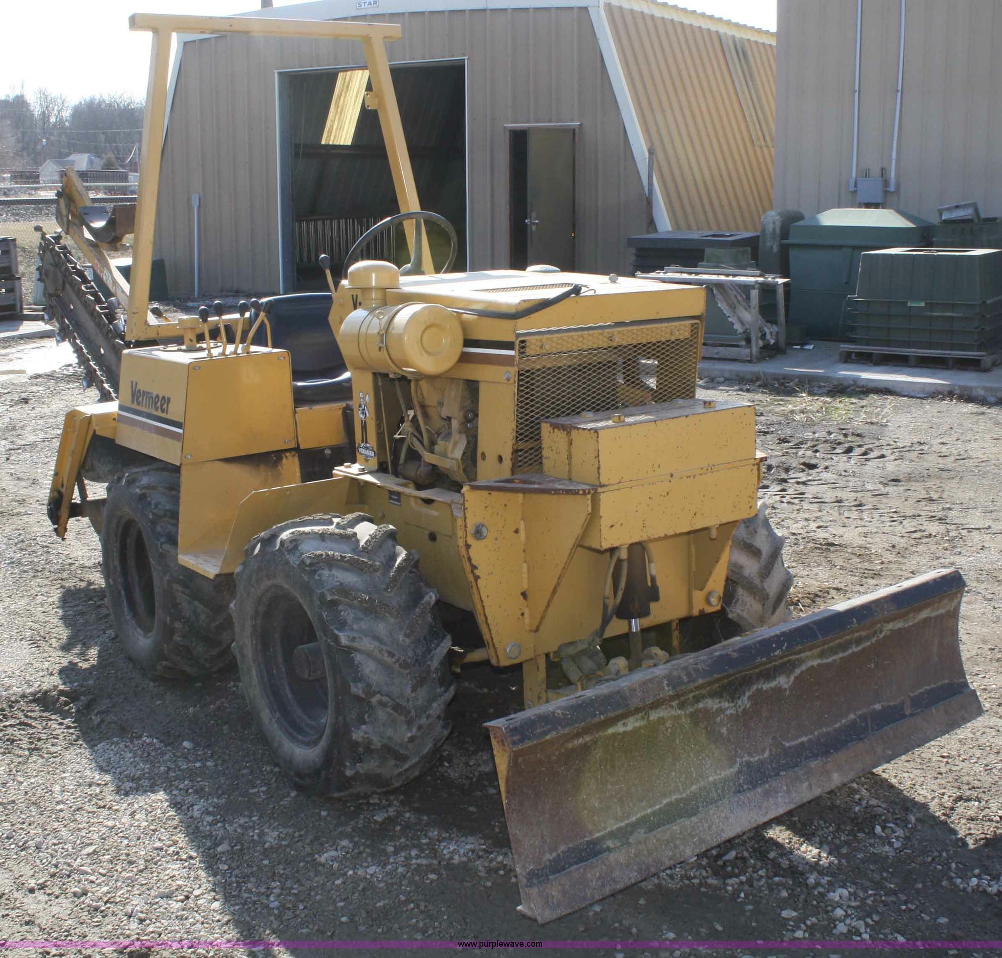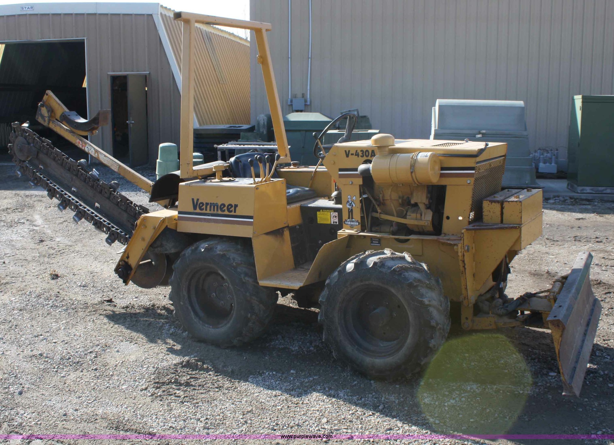 Purple Wave is selling a used Trencher or Rock Saw in Kansas. This item is a Vermeer V-430A trencher with the following: 606 hours on meter, Deutz two cylinder diesel engine, Three speed transmission, Four wheel drive, V-16A trencher attachment, 4' dig depth, Setup for 5"W trench, V-60A back fill blade, 5'W, Six-way control, Front counter weight, 29x12.5-15 tires, Serial 1VRF0625BL1000676
