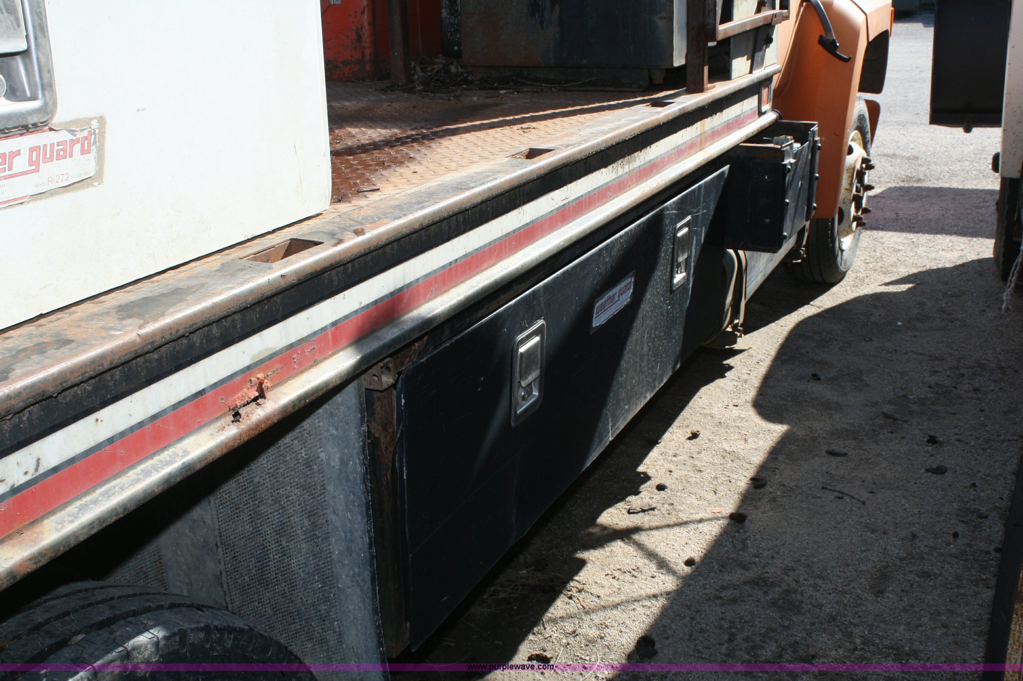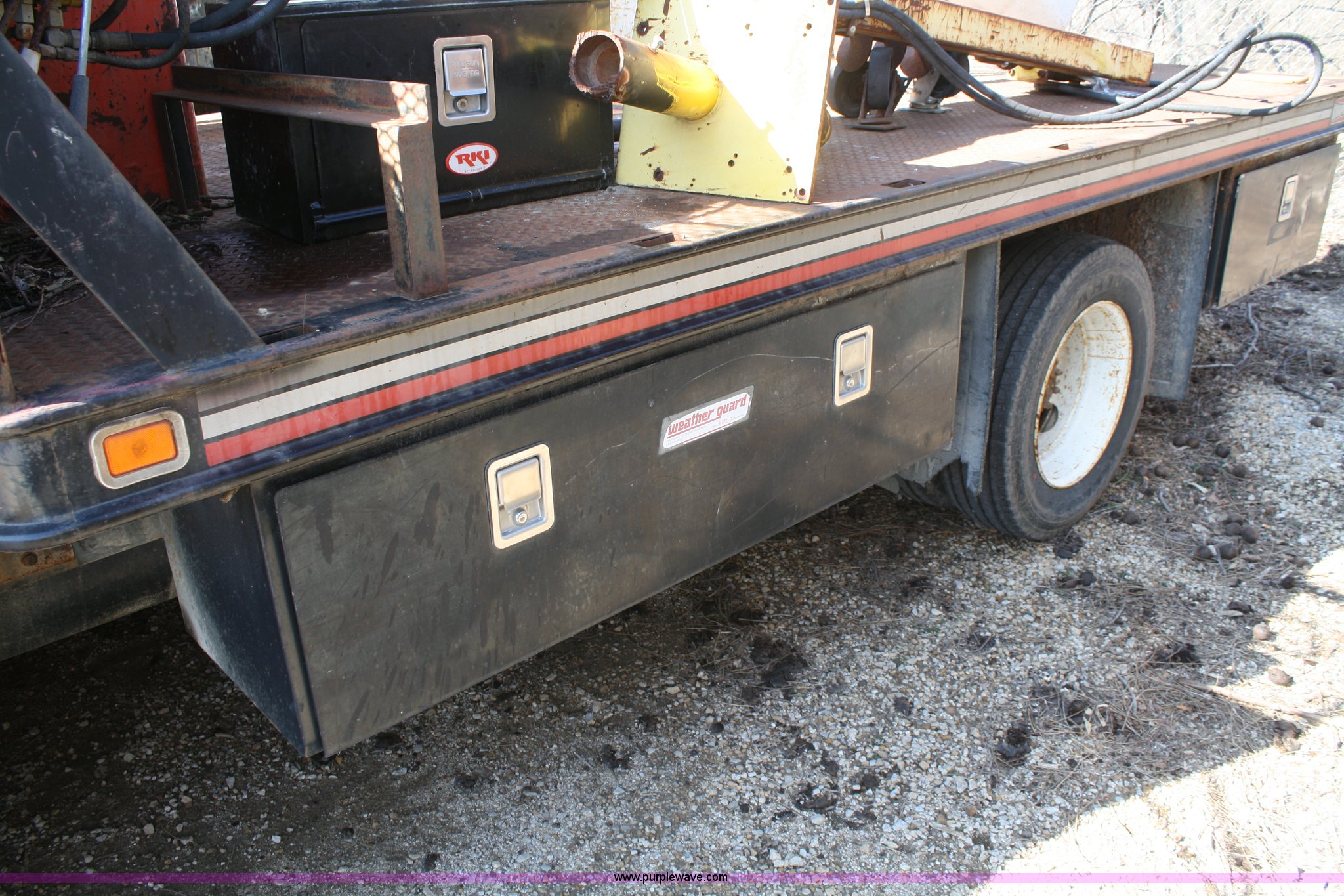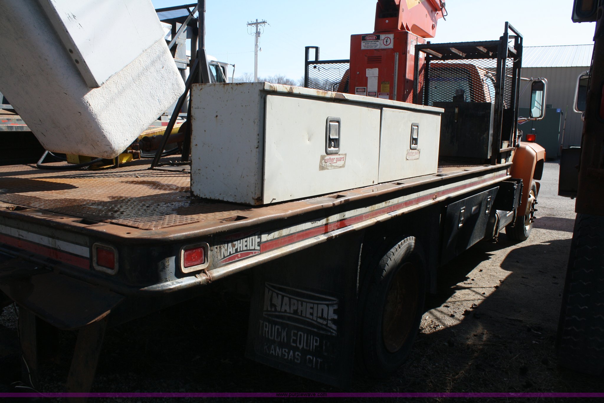 Purple Wave is selling a used Bucket Truck in Kansas. This item is a 1993 Ford F600 boom truck with the following: 77,279 miles on odometer, Not actual mileage, 8,673 hours on meter, Ford 6.6L six cylinder diesel engine, 165 HP, Automatic transmission, AM/FM, Knapheide 14' bed, Arm Lift bucket boom, Model AE-TEL-33 PTO, 28' platform height, 10" digger attachment, 50 gallon fuel tank, (4) under bed toolboxes, 245/70R19.5 tires, GVWR 21,000 lbs