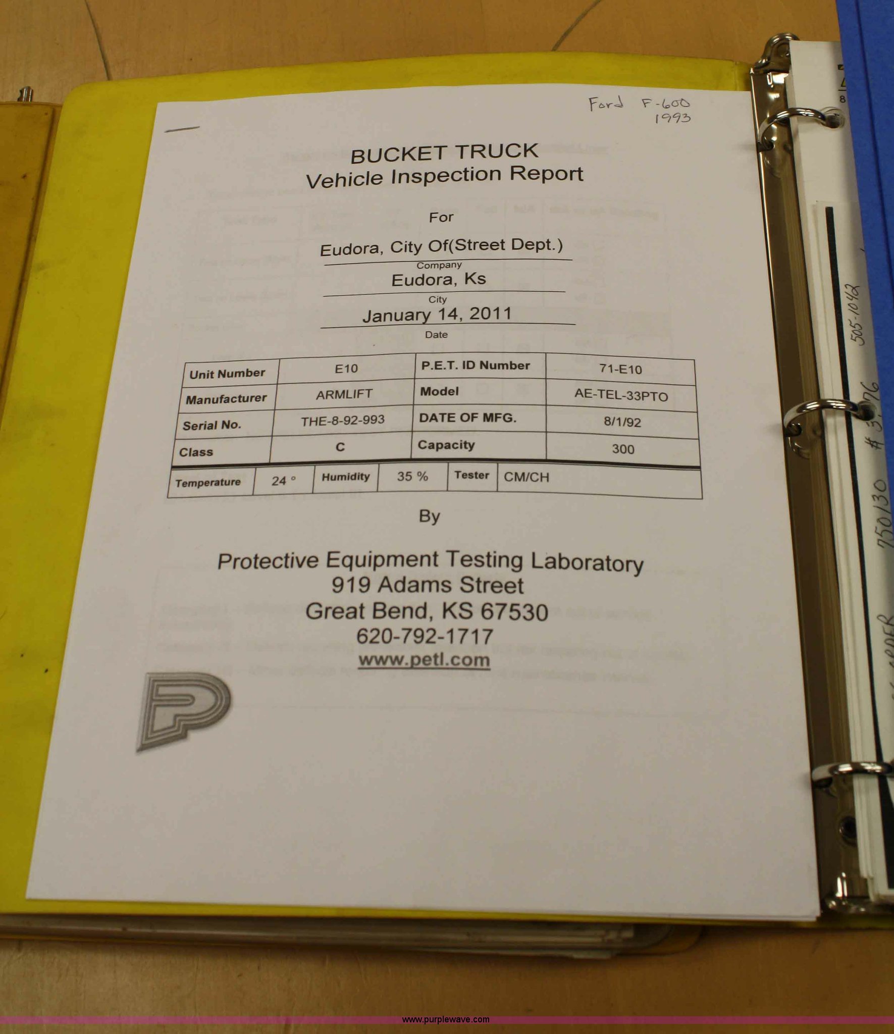 1993 Ford F600 boom truck. 77,279 miles on odometer Not actual mileage, 8,673 hours on meter, Ford 6.6L six cylinder diesel engine 165 HP, Automatic transmission, AM/FM, Knapheide 14' bed, Arm Lift bucket boom Model AE-TEL-33 PTO, 28' platform height, 10" digger attachment, 50 gallon fuel tank, (4) under bed toolboxes, 245/70R19.5 tires, GVWR 21,000 lbs. 1FDNK62P3PVA01262. City of Eudora. 107 W 5th St. Eudora, KS 66025