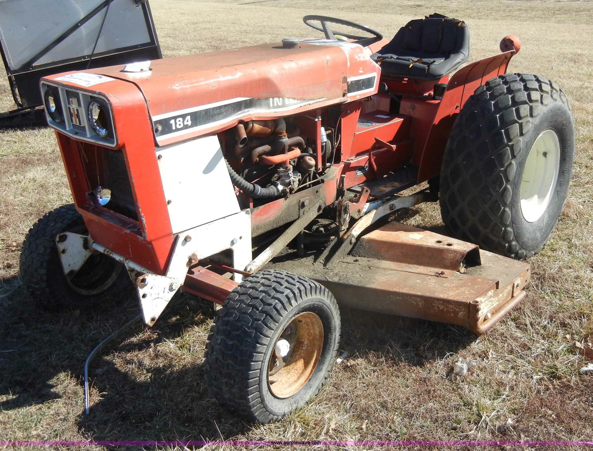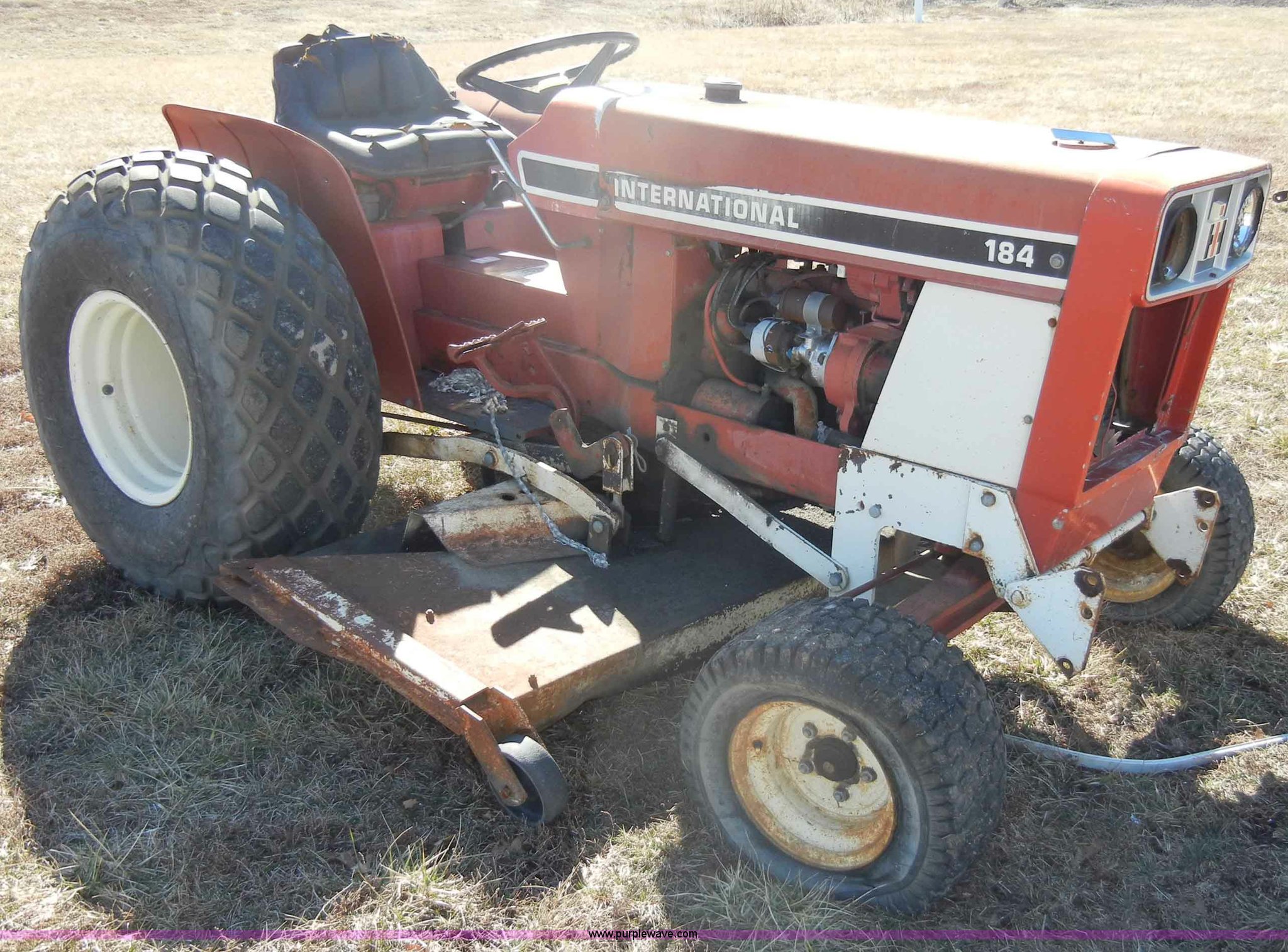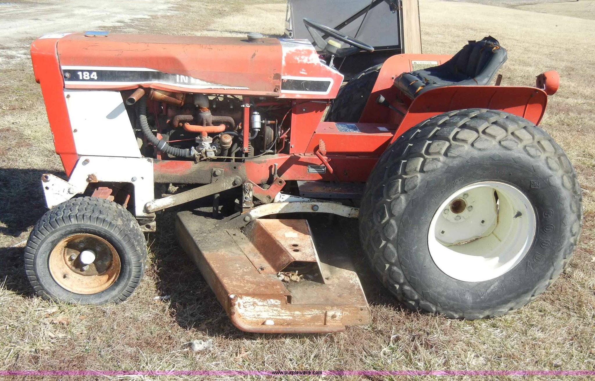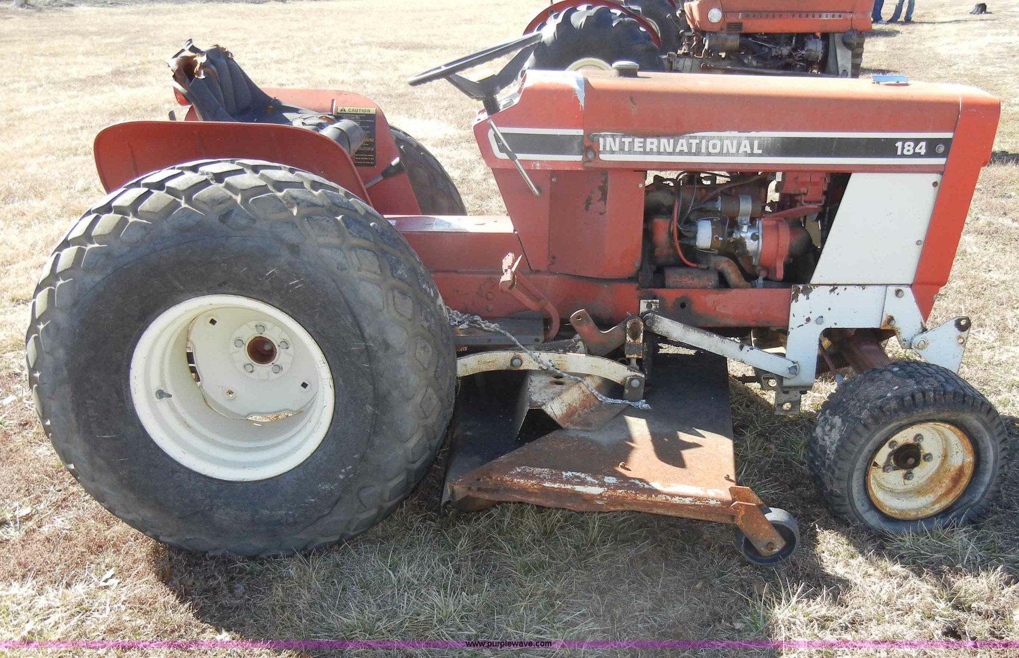 Purple Wave is selling a used Tractor in Kansas. This item is a International 184 tractor with the following: 6' mower, Gas engine, 2,050 RPM PTO, 4' wheelbase, 20x8.00-10 front tires, flat, 13.6-16.1 rear tires, Damaged seat, Lights non-operational, Cosmetic damage, No keys, Serial 2000116U049036