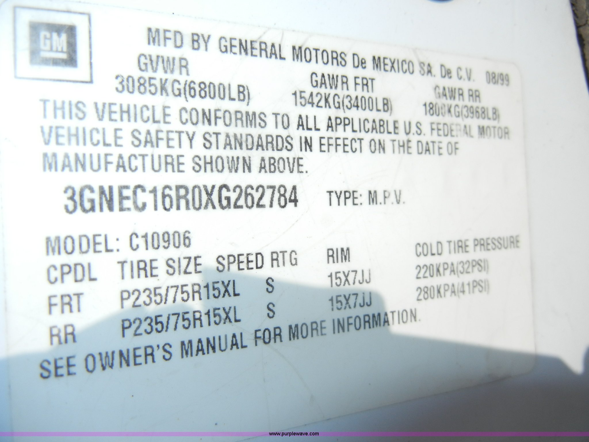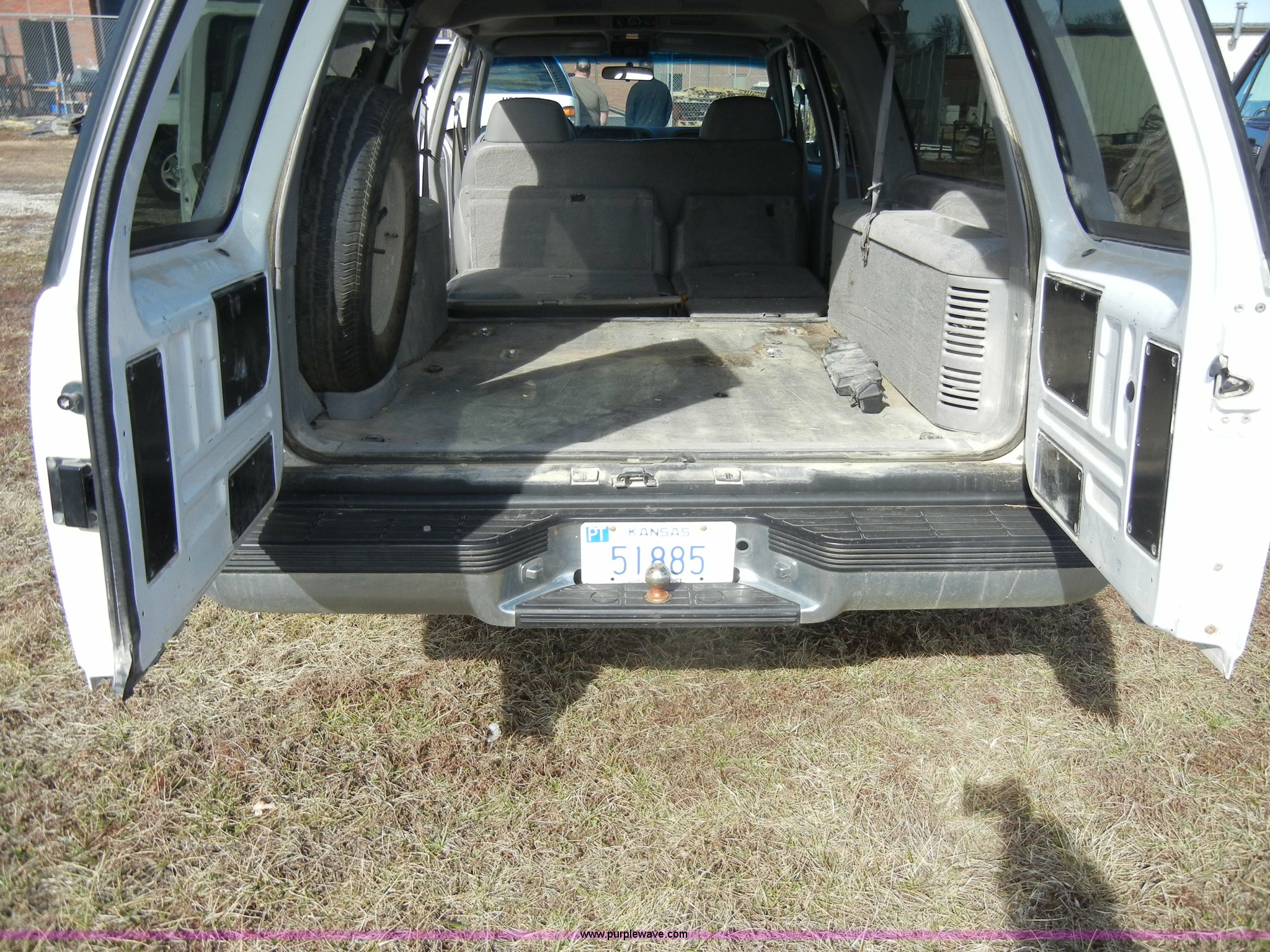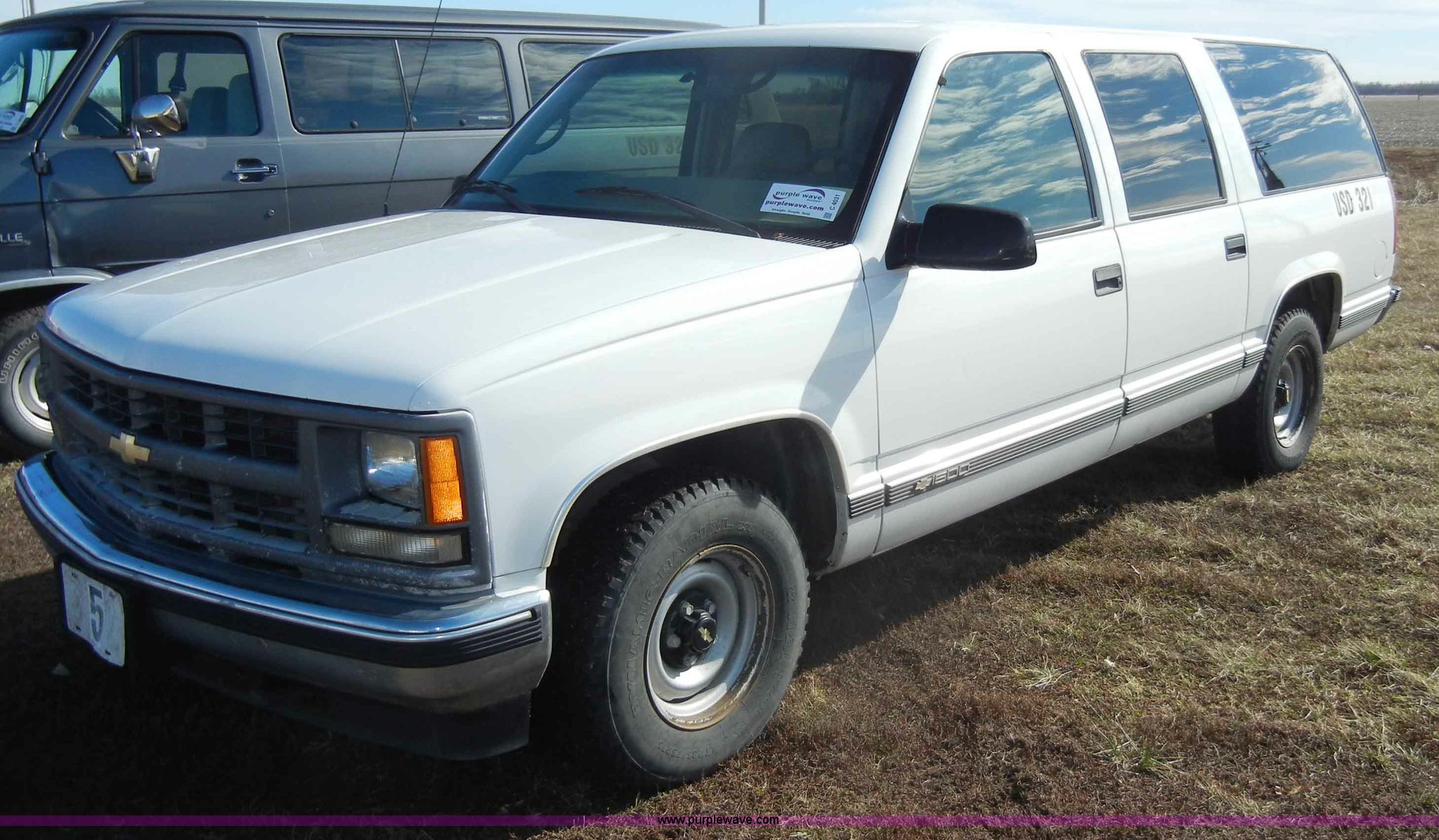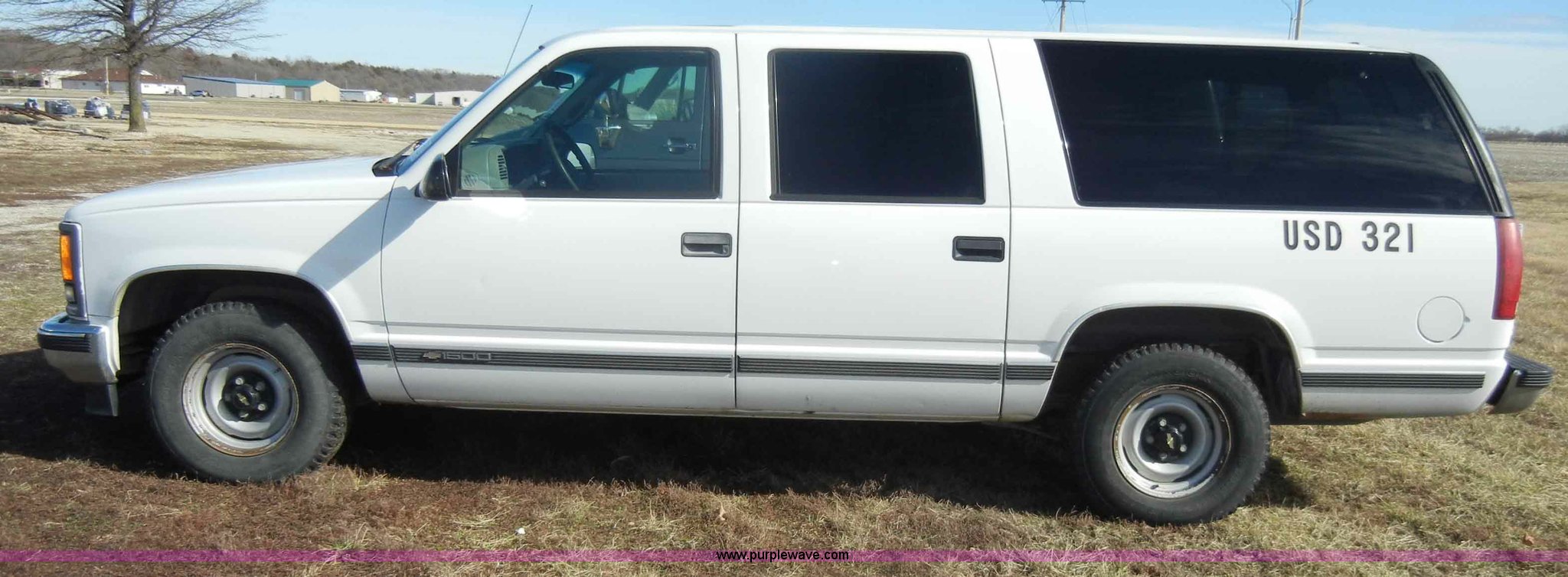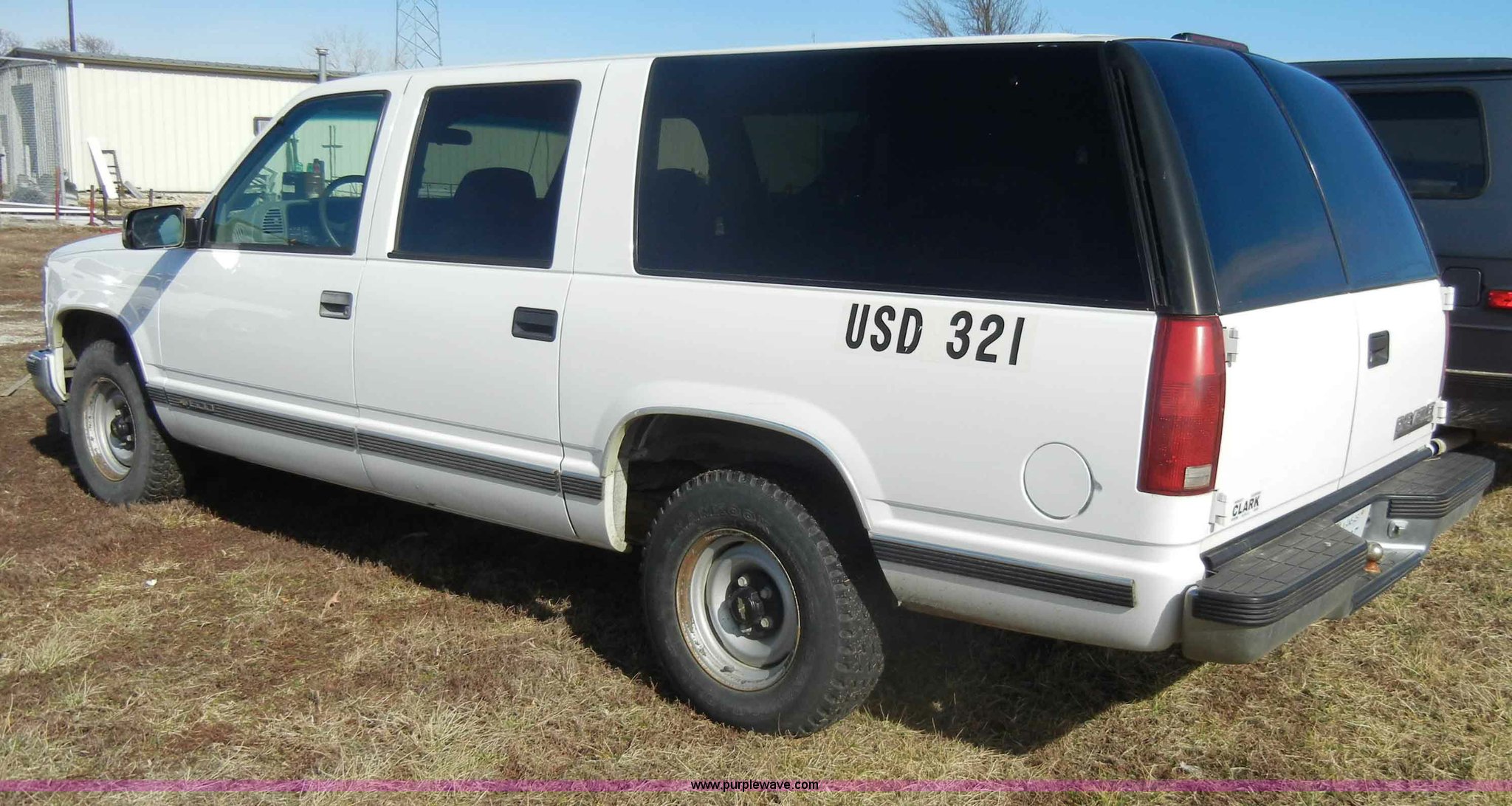 Purple Wave is selling a used Passenger Vehicle in Kansas. This item is a 1999 Chevrolet Suburban 1500 SUV with the following: 220,289 miles on odometer, 5.7L V8 CPI engine, Automatic transmission, AC and heat, Tilt, Cruise, AM/FM, Manual windows and locks, Vinyl bench seat, Front tow hooks, Ball hitch, 235/75R15 tires, Front and second row seats only, Interior/exterior cosmetic damage, Paint fading/peeling, Body rust