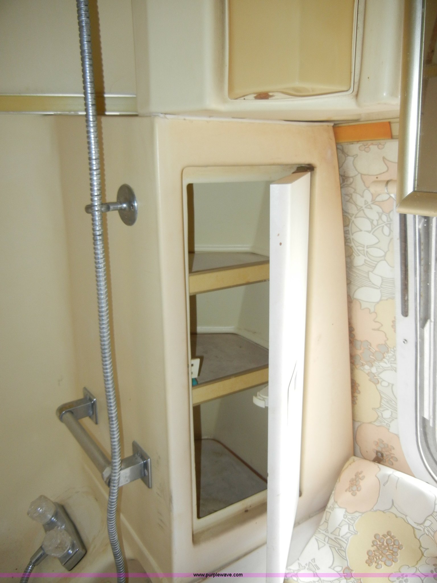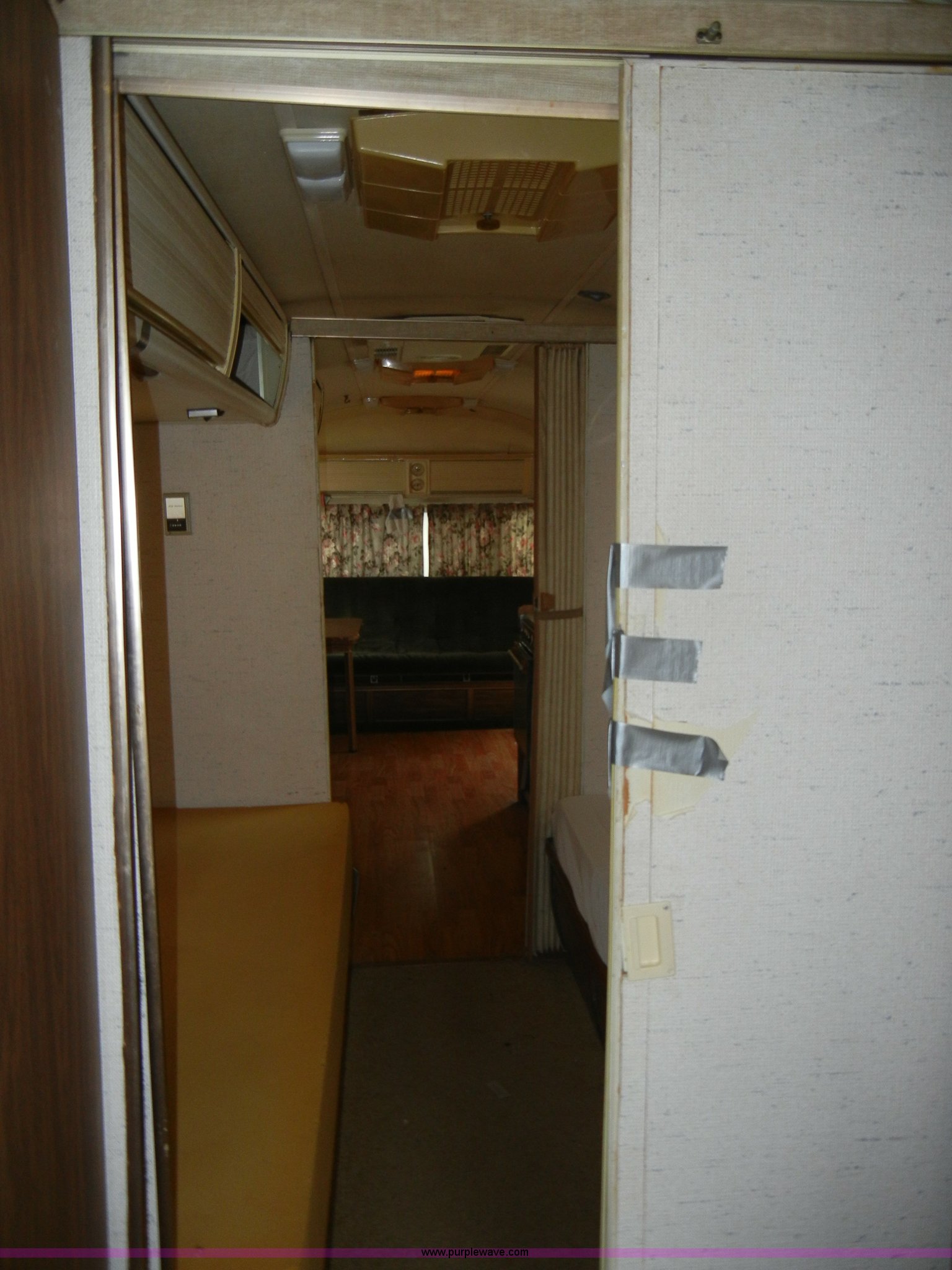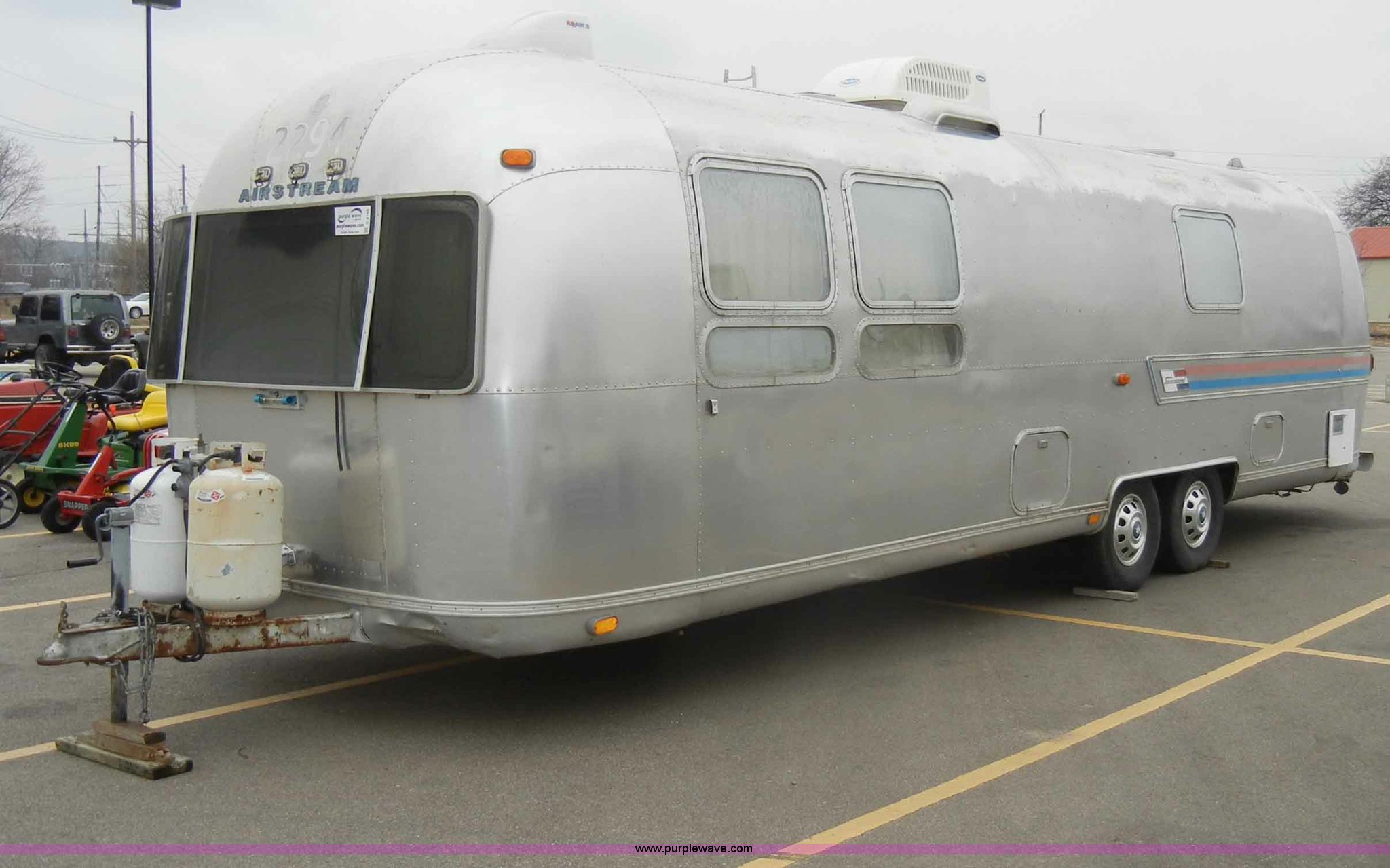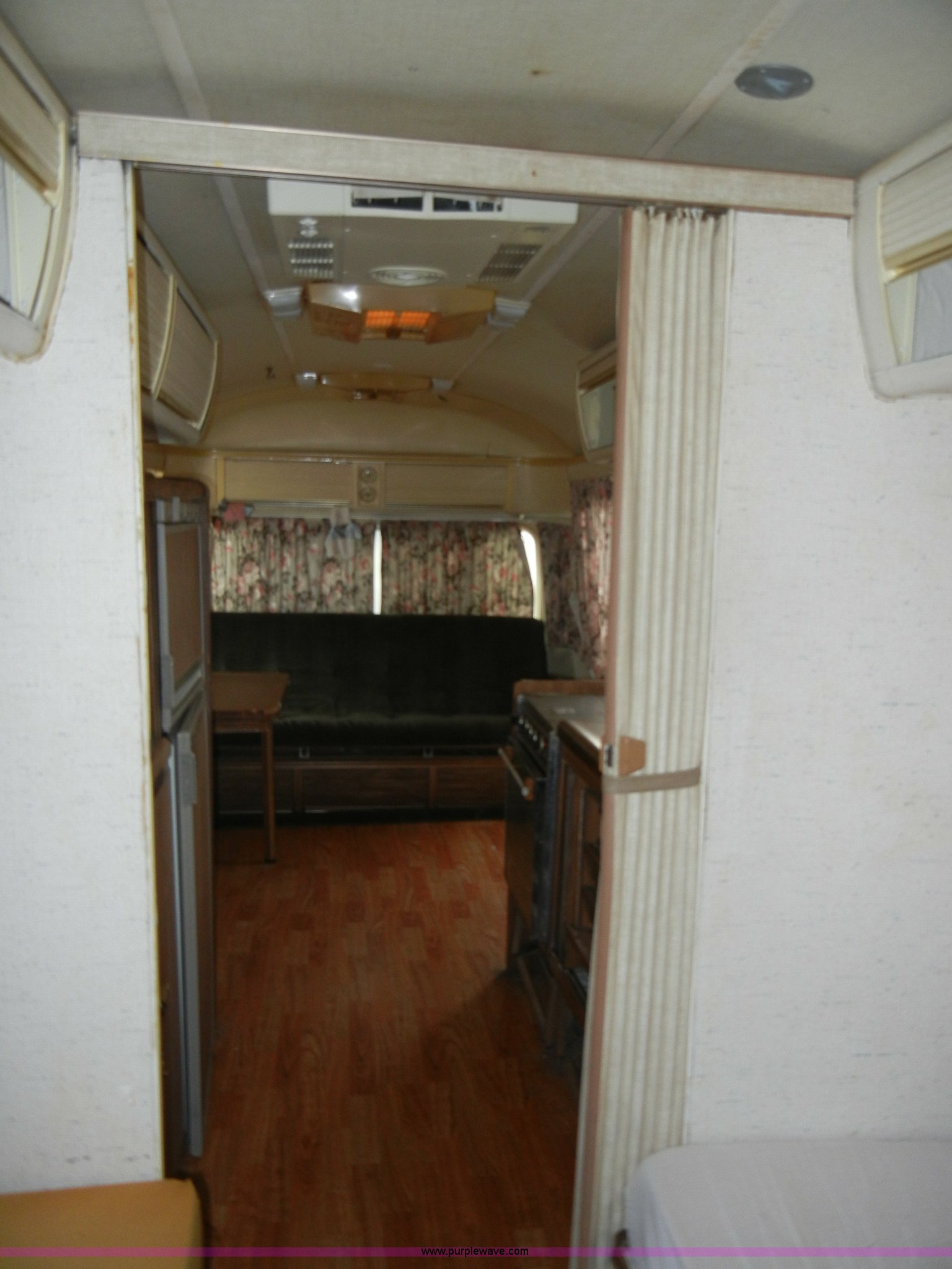 Purple Wave is selling a used RV in Kansas. This item is a 1976 Airstream Sovereign Land Yacht 27' travel trailer with the following: Dual axle, GVWR 7,100 lbs, Carpet and laminate flooring, Fold out couch/bed, Fold up table, Stove, sink, fridge/freezer, Carrier Air V unit, (2) single foam mattresses, Shower, sink, toilet, storage, Hot water heater, Portable water tank, (2) LP bottles, Top and bottom storage compartments, Keys for door and outside compartments, Break-away cable, Jack, lights, chains with out hooks, 2 5/16" ball hitch, 225/75R15 tires, Interior/exterior cosmetic damage, No battery