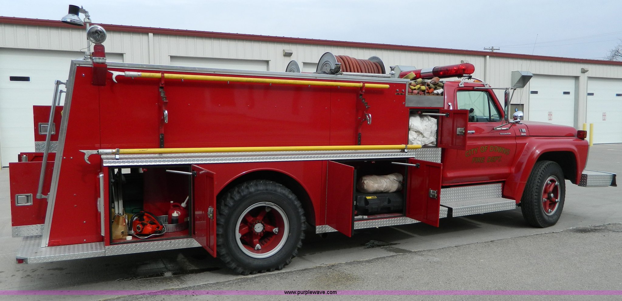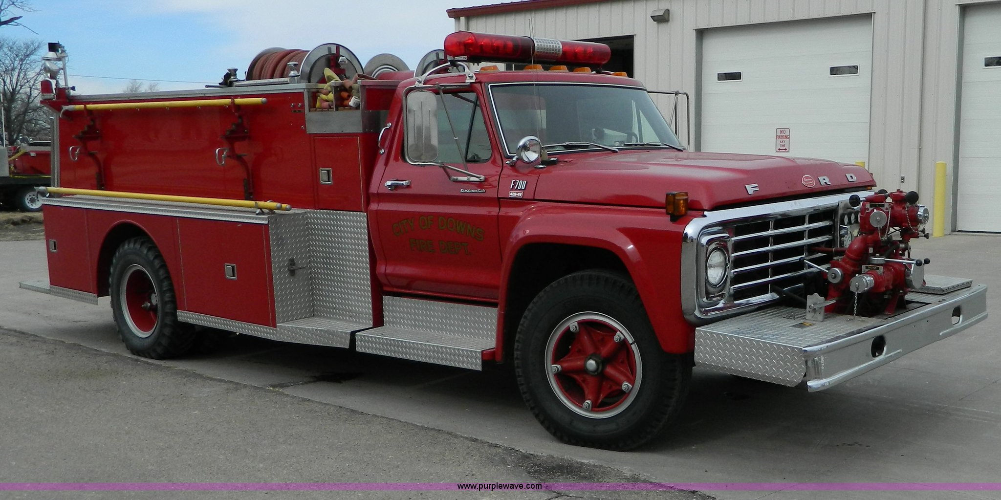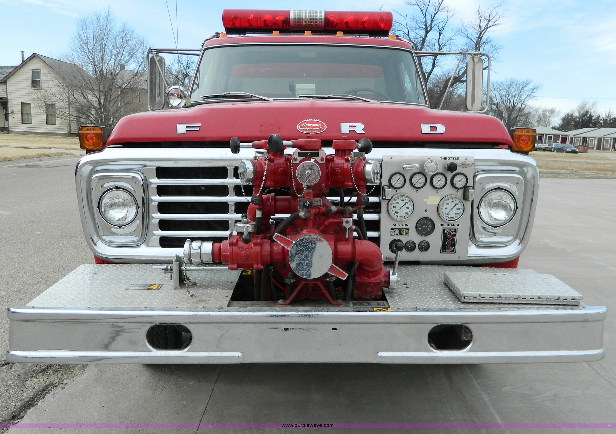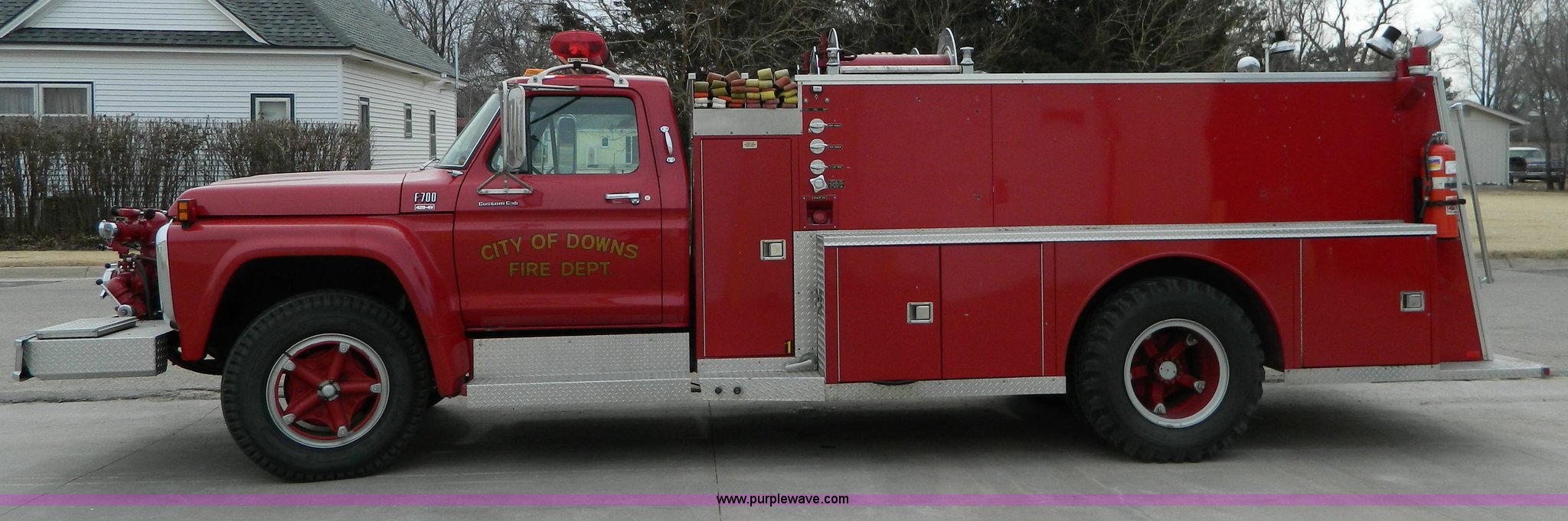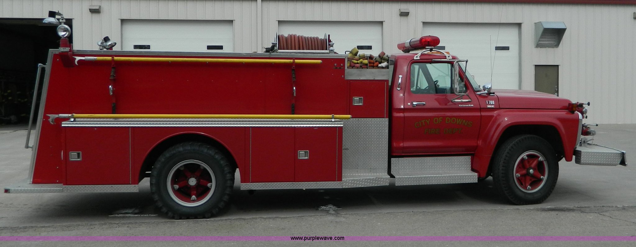 Purple Wave is selling a used Fire Truck or Emergency Vehicle in Kansas. This item is a 1979 Ford F700 firetruck with the following: 5,290 miles on odometer, 429 gas engine, Five speed manual transmission, Custom cab, Heater, AM radio, Electronic siren, Light bar, Rear strobe lights, American Barton 750 front mount pump, 750 gallon water tank, Cole Hersee battery shutoff, Electric hose reels, 4" intake, (3) 2.5" front discharge, (2) 1.5" cross lays, 2.5" rear discharge, 9.00-20 tires, Passed pump test in Nov. 2011, Complete pump rebuild in 2008, No loose tools, hose, appliances, radios, or personal property included
