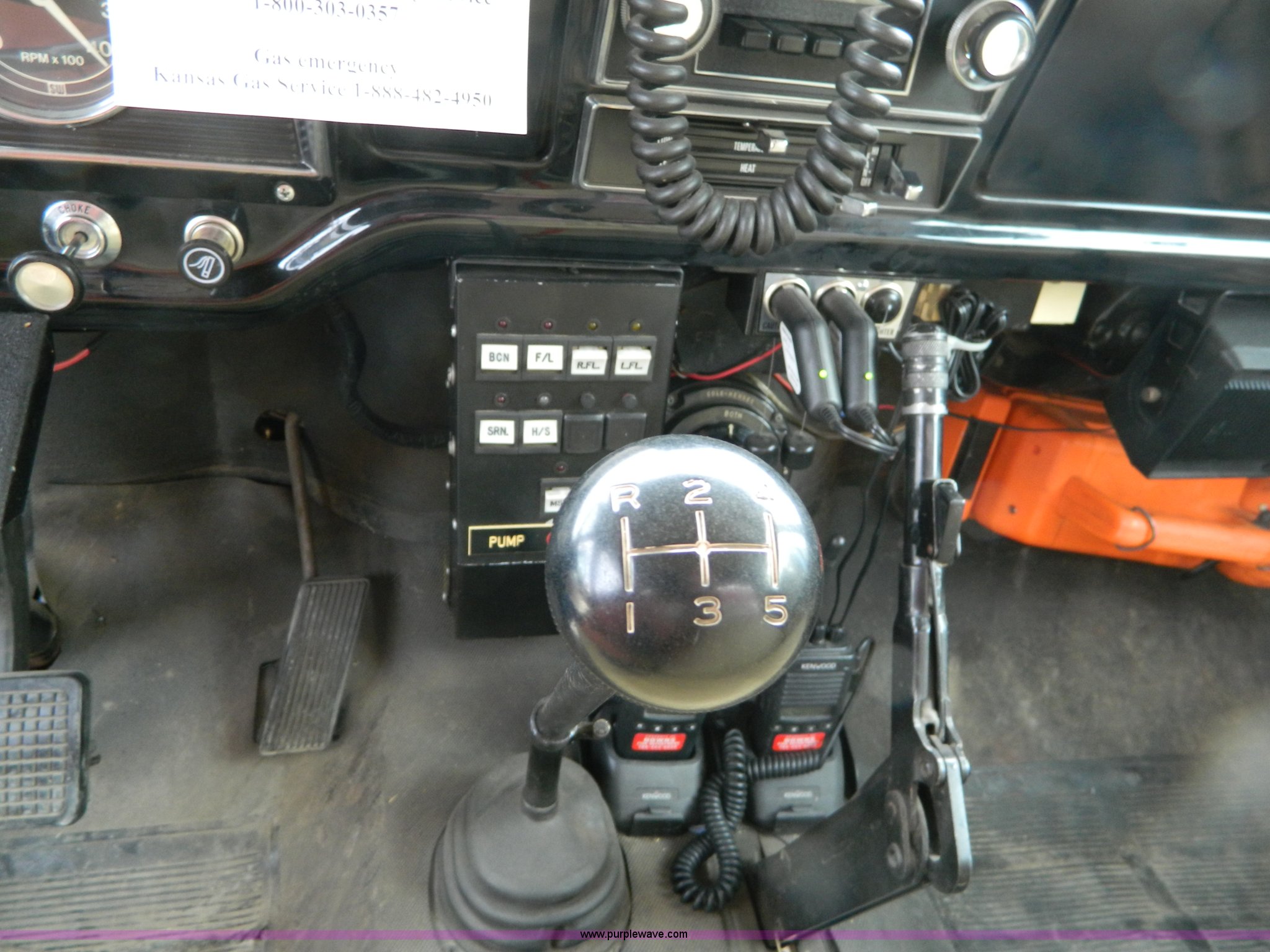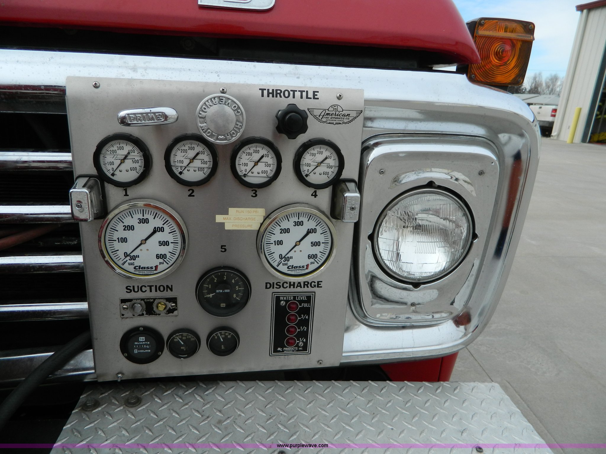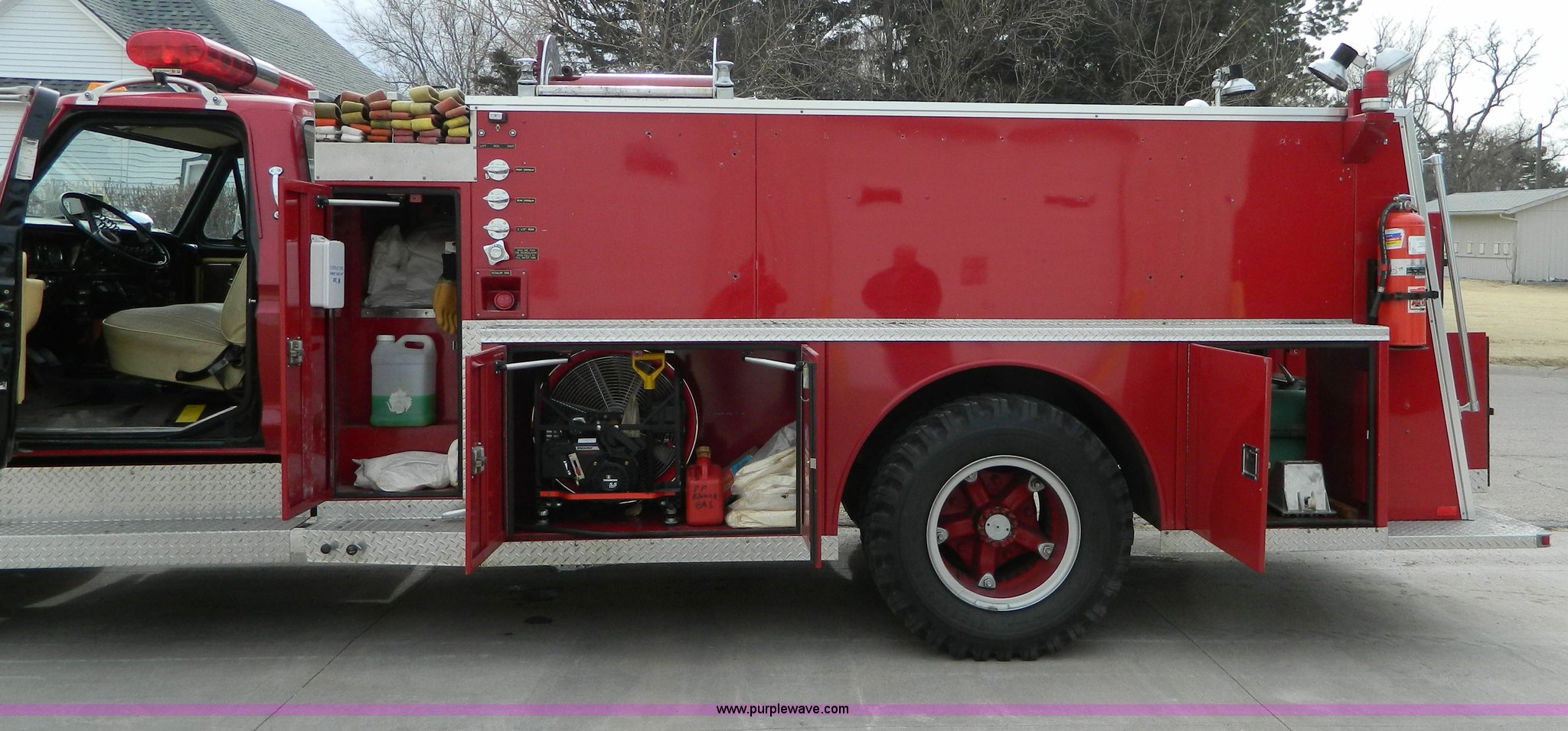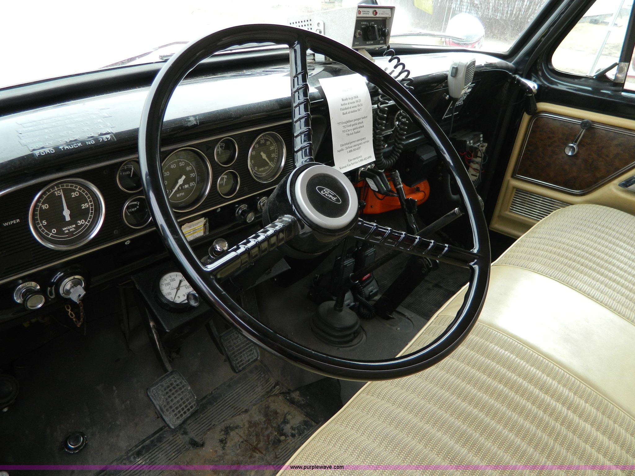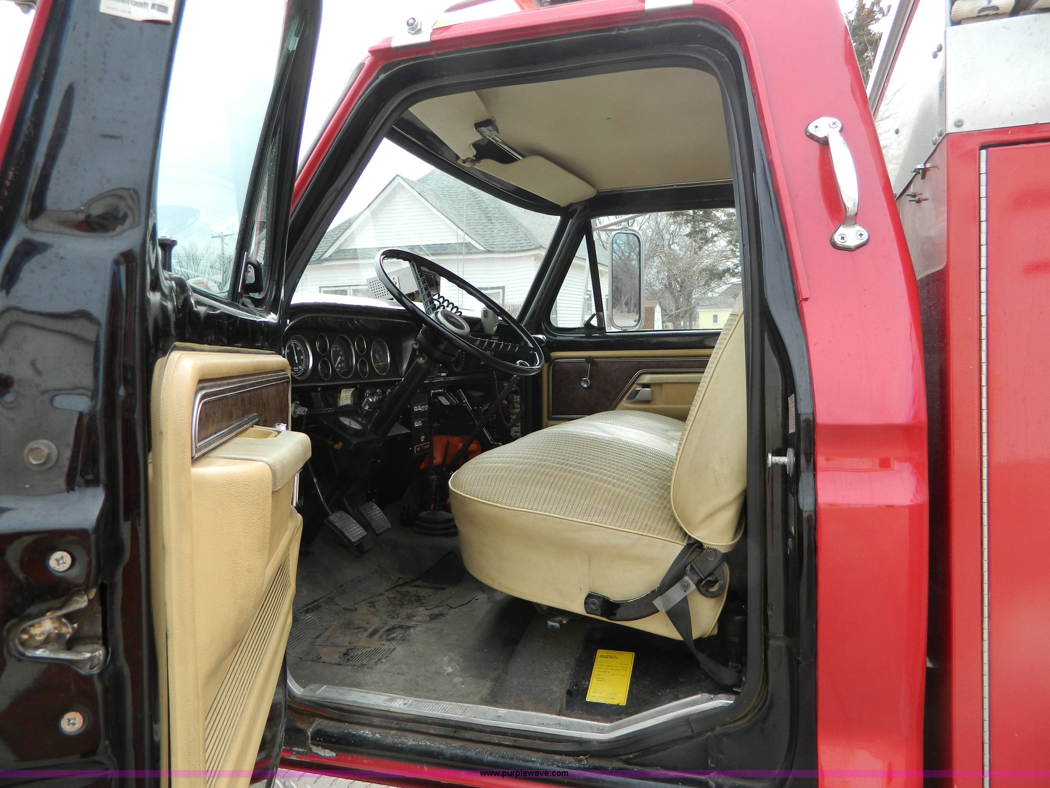 Purple Wave is selling a used Fire Truck or Emergency Vehicle in Kansas. This item is a 1979 Ford F700 firetruck with the following: 5,290 miles on odometer, 429 gas engine, Five speed manual transmission, Custom cab, Heater, AM radio, Electronic siren, Light bar, Rear strobe lights, American Barton 750 front mount pump, 750 gallon water tank, Cole Hersee battery shutoff, Electric hose reels, 4" intake, (3) 2.5" front discharge, (2) 1.5" cross lays, 2.5" rear discharge, 9.00-20 tires, Passed pump test in Nov. 2011, Complete pump rebuild in 2008, No loose tools, hose, appliances, radios, or personal property included