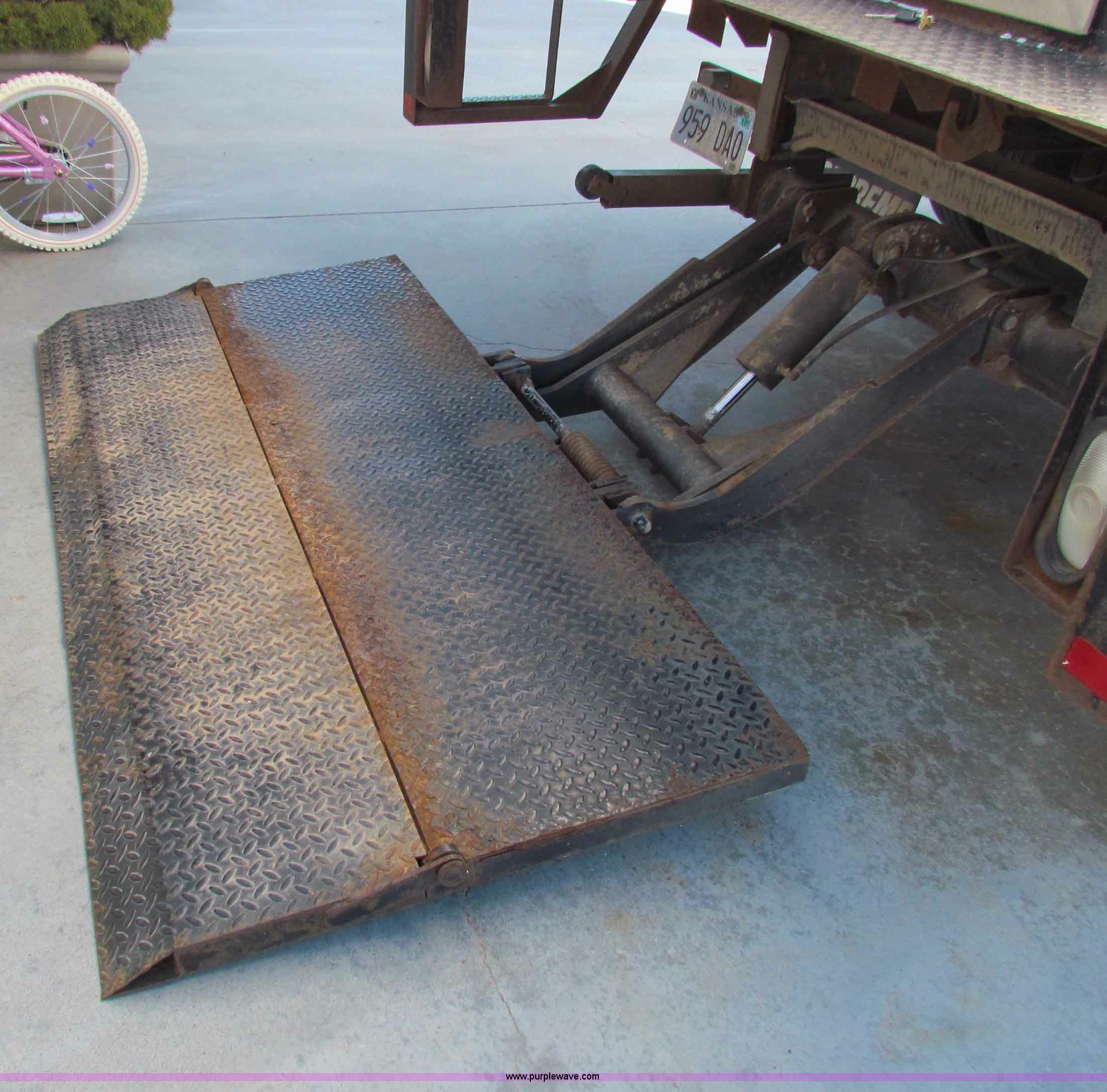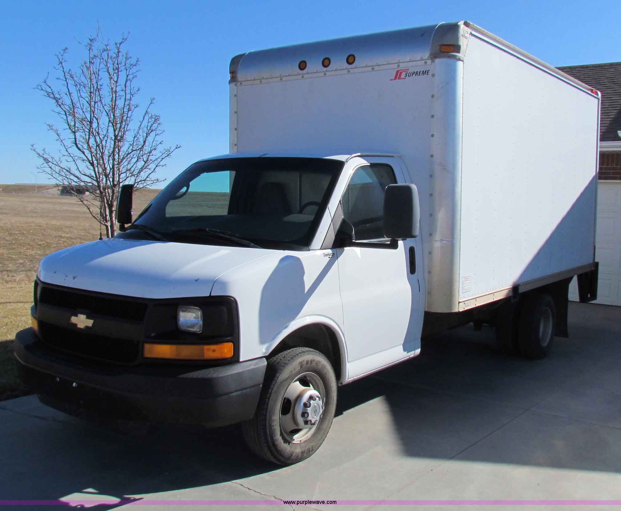 Purple Wave is selling a used Box Truck in Kansas. This item is a 2005 Chevrolet G3500 Express box van with the following: Vortec 6.0L V8 SFI gas engine, Automatic transmission, AC and heat, Tilt, Cruise, AM/FM, Supreme 14' box, Tommy lift, Front and rear entry doors, 225/75R16 tires, Interior/exterior cosmetic damage, Paint peeling on cab and hood