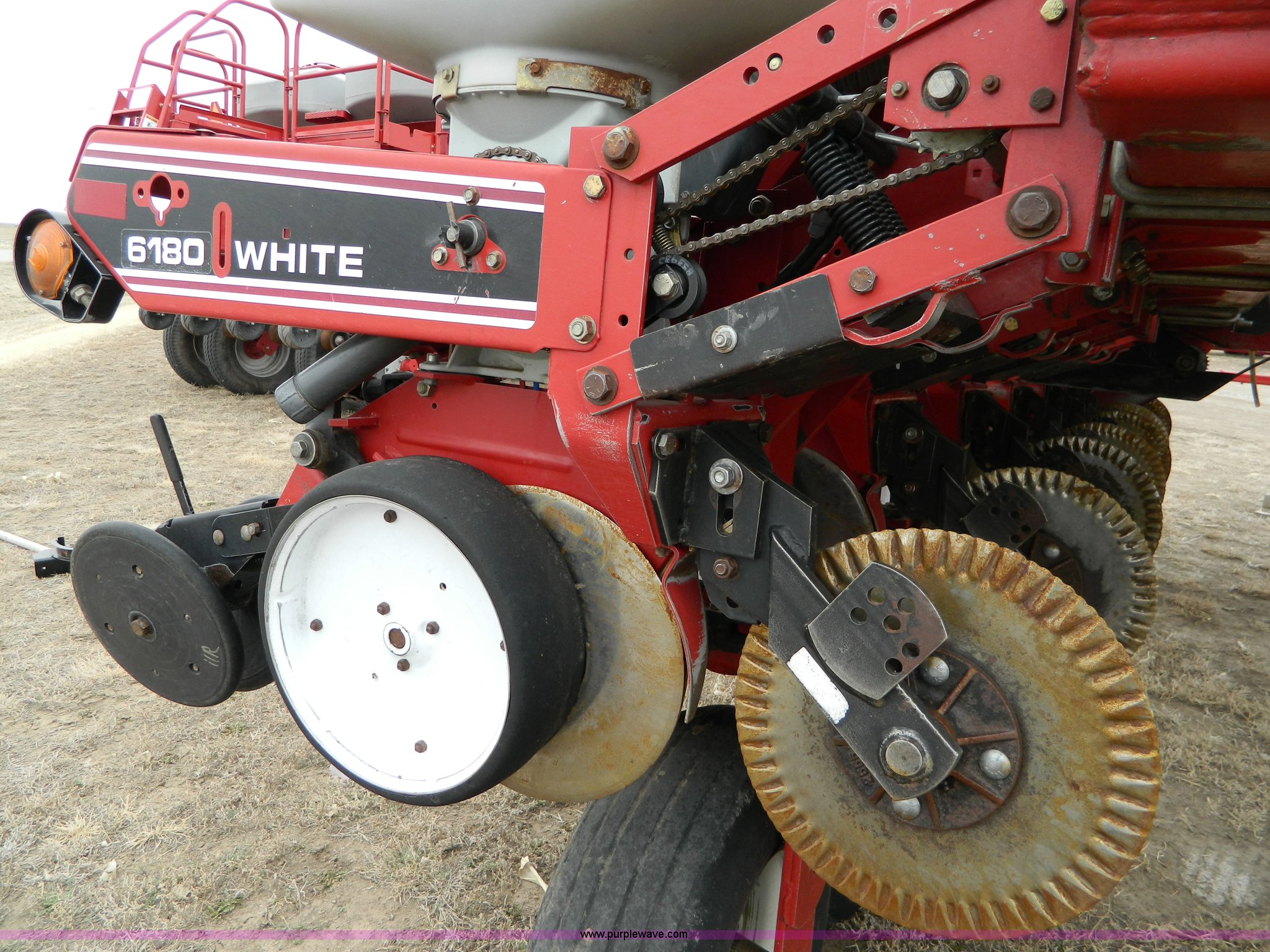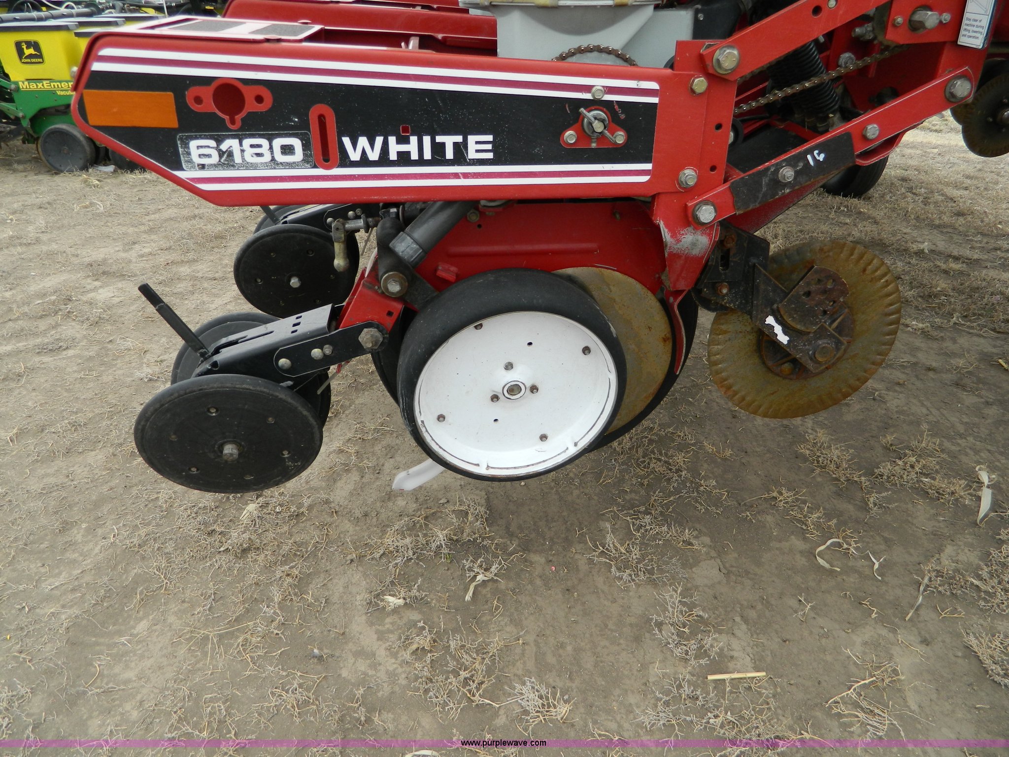 Purple Wave is selling a used Planter in Kansas. This item is a 1998 AGCO White 6186 16 row planter with the following: Approx. 18,000 acres use, 30" spacing, Individual hoppers, (6) 80 gallon poly tanks for liquid fertilizer, Hydraulic markers, Vacuum row unit meter, Seed firmers, No-till coulters, Corn, milo, soybean, and sunflower discs included, Serial 614823