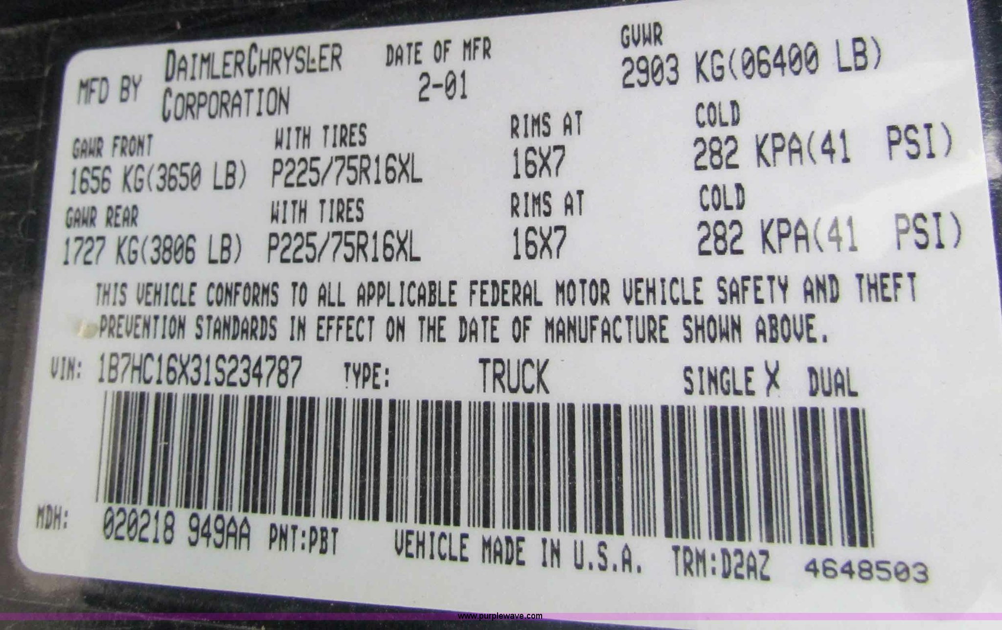 Purple Wave is selling a used Passenger Vehicle in Kansas. This item is a 2001 Dodge Ram 1500 pickup truck with the following: 158,929 miles on odometer, 3.9L V6 MPI engine, Automatic transmission, AC and heat, AM/FM, Manual locks and windows, Tilt, Cruise, 225,75R16 tires, Interior/exterior cosmetic damage, Hail damaged, Paint faded and scratched, KDOT ID 051-4031