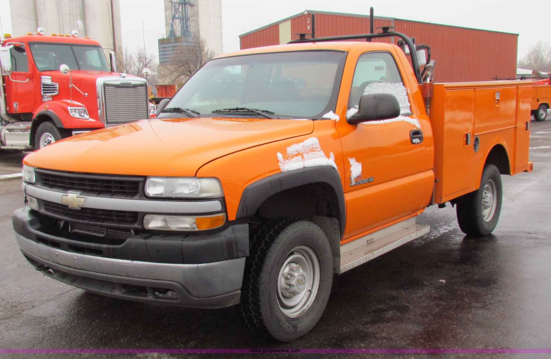 Purple Wave is selling a used Service Truck in Kansas. This item is a 2002 Chevrolet C2500HD pickup truck with the following: 231,336 miles on odometer, 6.6L V8 diesel engine, Automatic transmission, AC and heat, Tilt, Cruise, AM/FM, Manual windows and locks, Running boards, Utility bed, Fuel transfer tank with 12V fuel pump, Receiver hitch, Trailer wiring, 245/75R16 tires, Tires worn, Interior/exterior cosmetic damage, Paint faded and scratched, Cab replaced, KHP issued new VIN, KDOT ID 112-5162