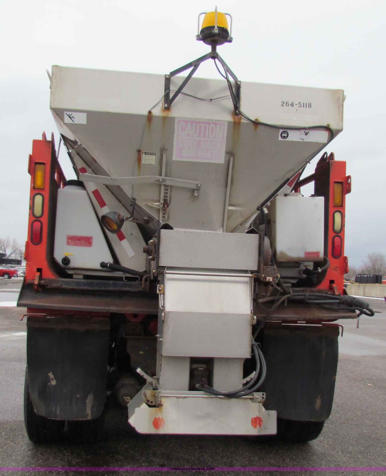 Purple Wave is selling a used Construction Dump Truck in Kansas. This item is a 1999 International 4900 tandem axle dump truck with the following: 207,729 miles on odometer, 7,580 hours on meter, Navistar DT530 8.7L diesel engine, Allison MD3060 transmission, Twin screw, Heater, Cruise, AM/FM/CD, Heated mirrors, Manual windows and locks, Suspension seat, Air brakes, Gresen spreader and plow controls, 11' reversible plow, Stainless steel 9 cu. yd. spreader, Air operated end gate, Rear air brake hookups, Rear hydraulic remotes, Spring suspension, Pintle hitch, Trailer wiring, 295/75R22.5 tires, Tires worn, Interior/exterior cosmetic damage, Cab and bed rust, Batteries maybe dead, KDOT ID 264-5118