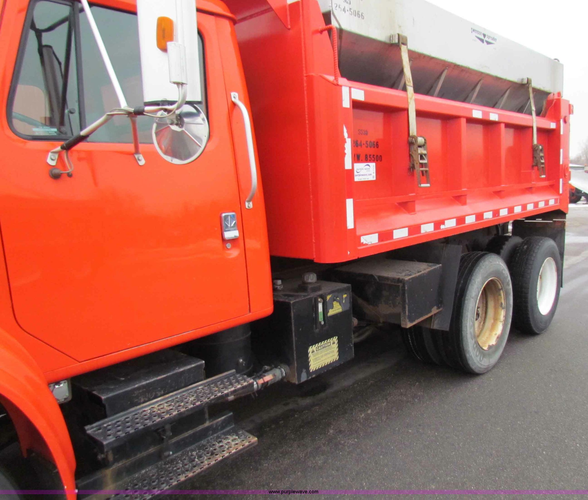 Purple Wave is selling a used Construction Dump Truck in Kansas. This item is a 1997 International 4900 tandem axle dump truck with the following: 191,574 miles on odometer, 12,578 hours on meter, Navistar DT466 7.6L diesel engine, Allison MD3060 transmission, Twin screw, Heater, AM/FM, Heated mirrors, Manual windows and locks, Suspension seat, Air brakes, Force spreader and plow controls, 1996 Valk RV1142PR plow, KDOT ID 603-5266, Serial 20943, 1996 Swenson EV-100-13 spreader, KDOT ID 721-5266, Serial 13, Air operated end gate, Rear air brake hookups, Rear hydraulic remotes, Spring suspension, Pintle hitch, Trailer wiring, 295/75R22.5 tires, Tires worn, Interior/exterior cosmetic damage, Cab and bed rust, KDOT ID 264-5066