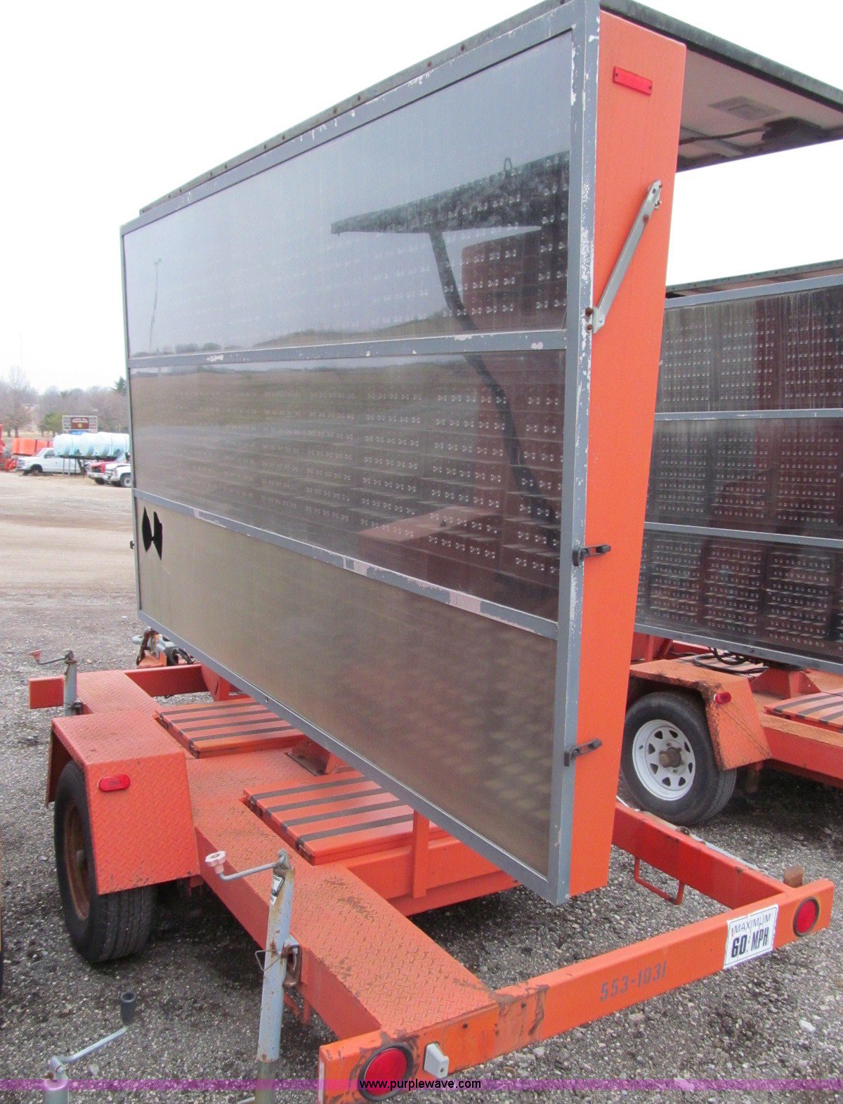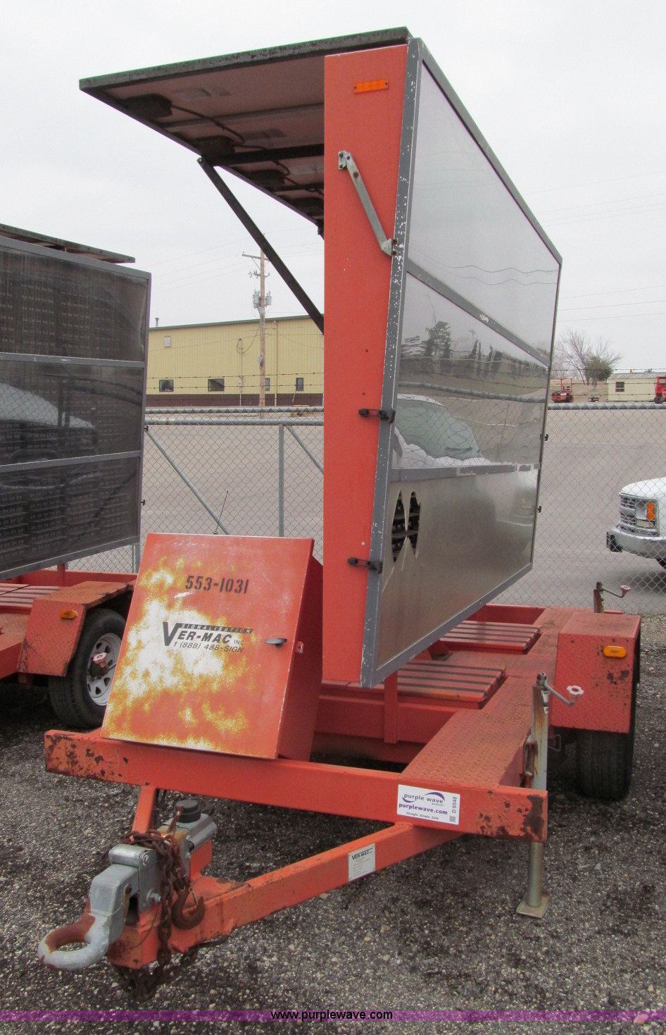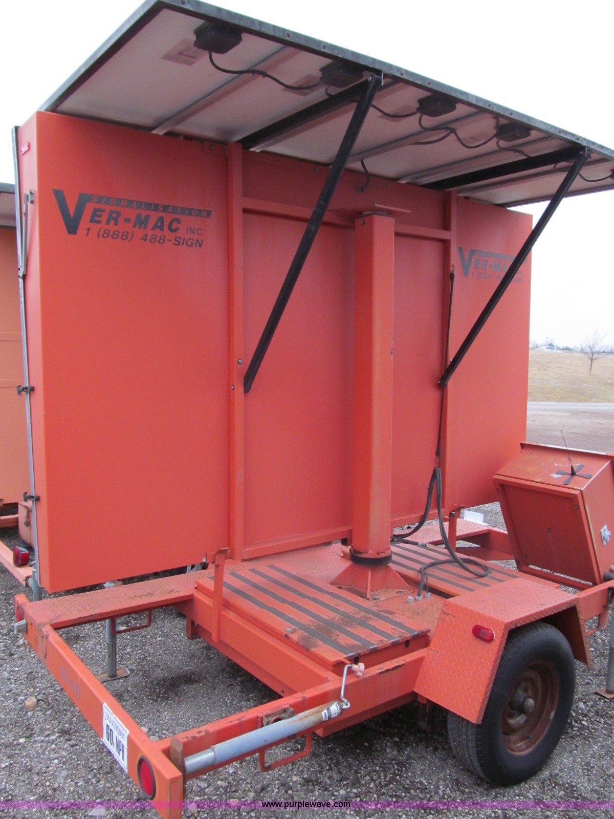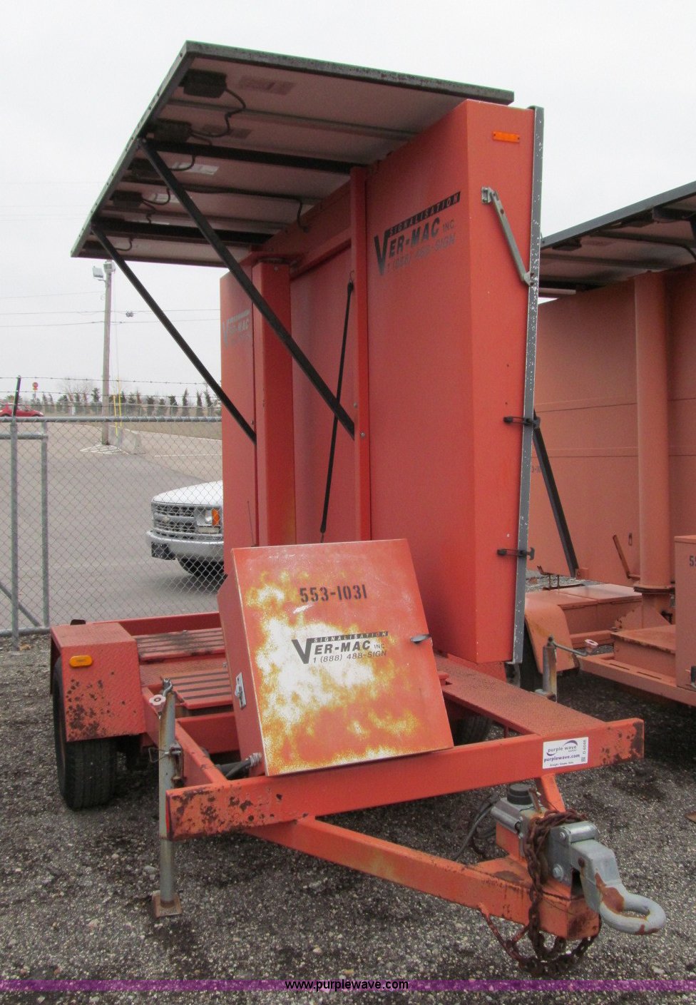 Purple Wave is selling a used Road Safety Equip. in Kansas. This item is a 2001 Ver-Mac PCMS-1210 variable message board with the following: Trailer mounted, Battery powered, Solar charged, (4) stabilizer jacks, Pintle hitch, Chains and lights, ST225/75R15 tires, Plastic panel over LED lights broken, Bed LED light panel, Serial 0102560, KDOT ID 553-1031