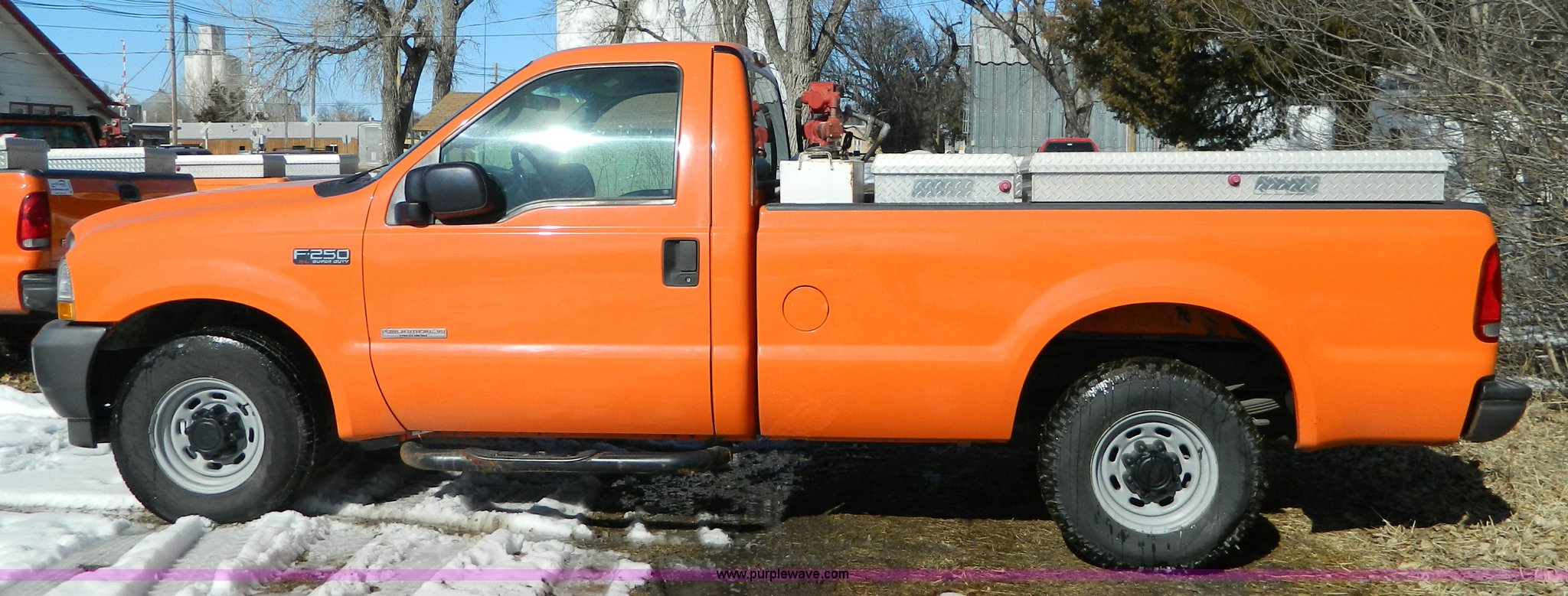 Purple Wave is selling a used Passenger Vehicle in Kansas. This item is a 2003 Ford F250 pickup truck with the following: 178,482 miles on odometer, Powerstroke 6.0L V8 FI diesel engine, Automatic transmission, Heater, Manual windows and locks, 100 gallon fuel tank with transfer pump, Cross bed toolbox, (2) side toolboxes, Interior/exterior cosmetic damage, Paint faded and scratched, Seat needs reupholstered, High mounted brake light out, KDOT ID 113-3113