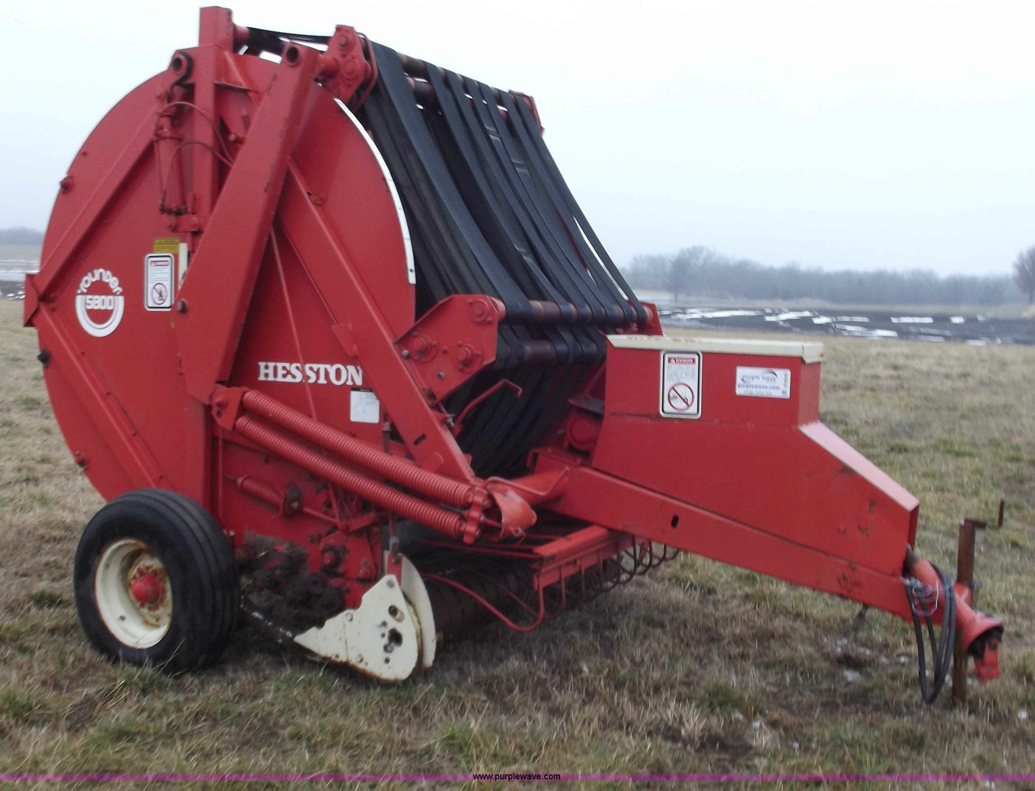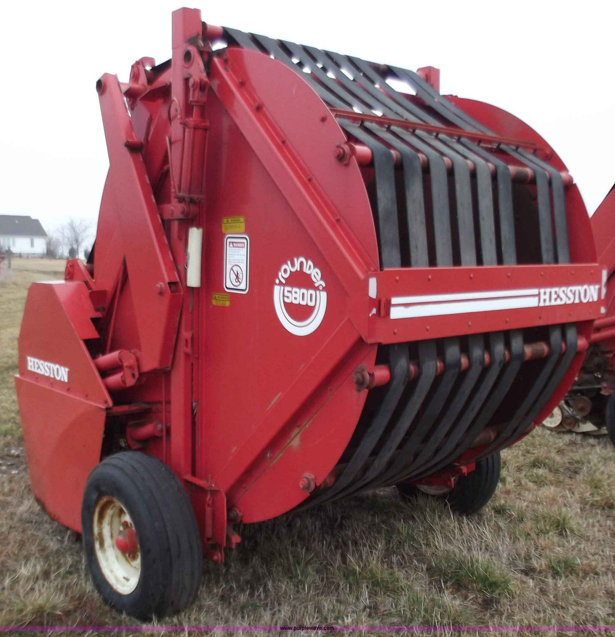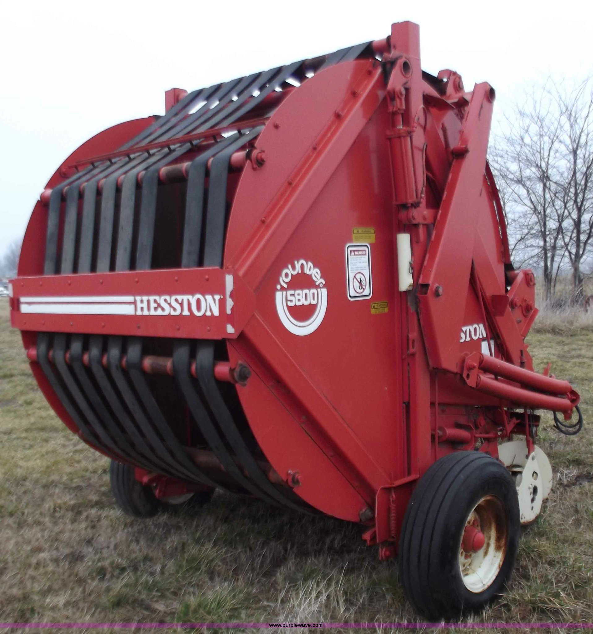 Purple Wave is selling a used Round Baler in Missouri. This item is a Hesston 5800 round baler with the following: 5x5 bales, 540 PTO, Pioneer fittings, Pin hitch, 9.5L-15 tires, Missing one belt and idler chain, Serial RB583942