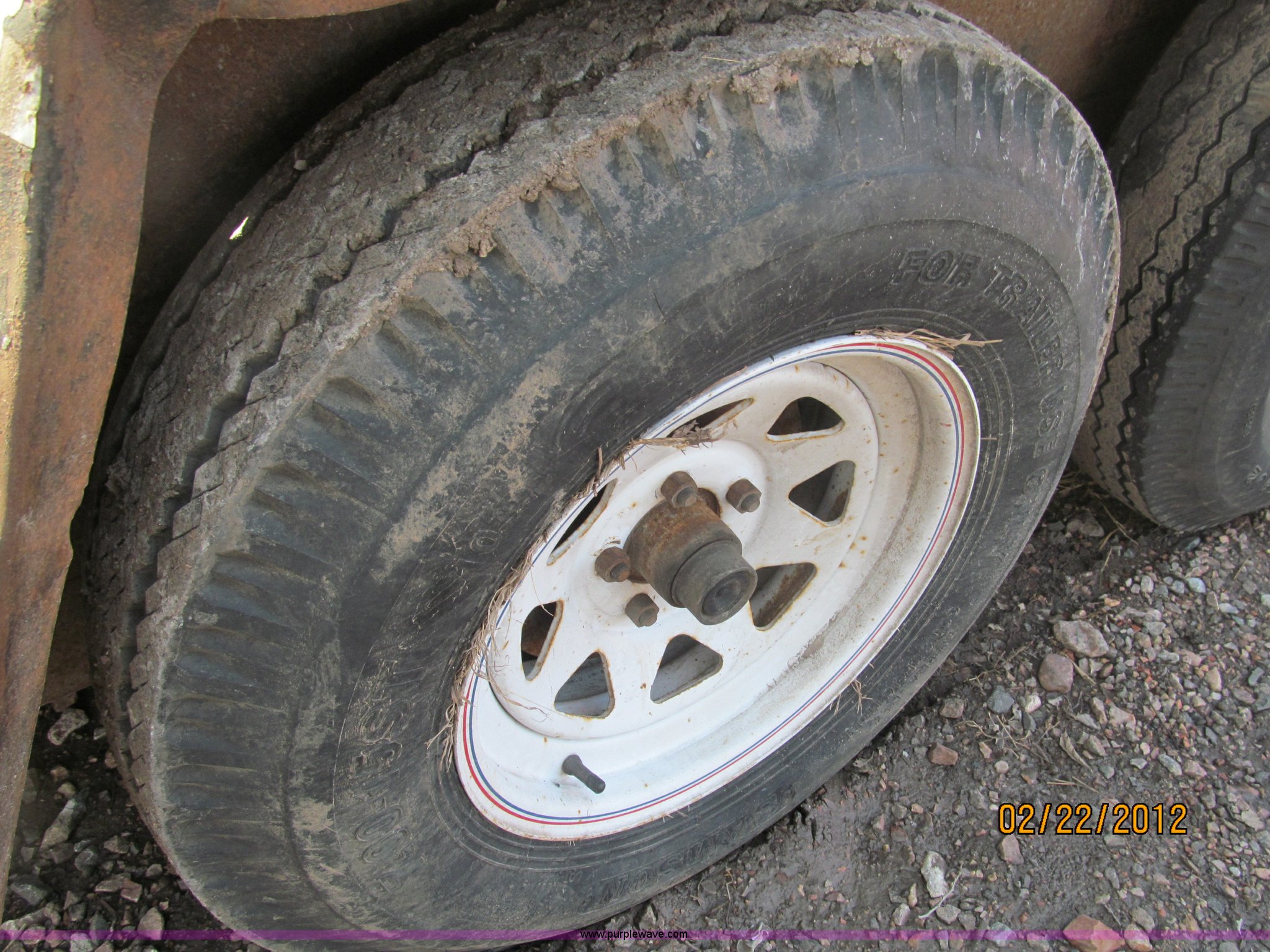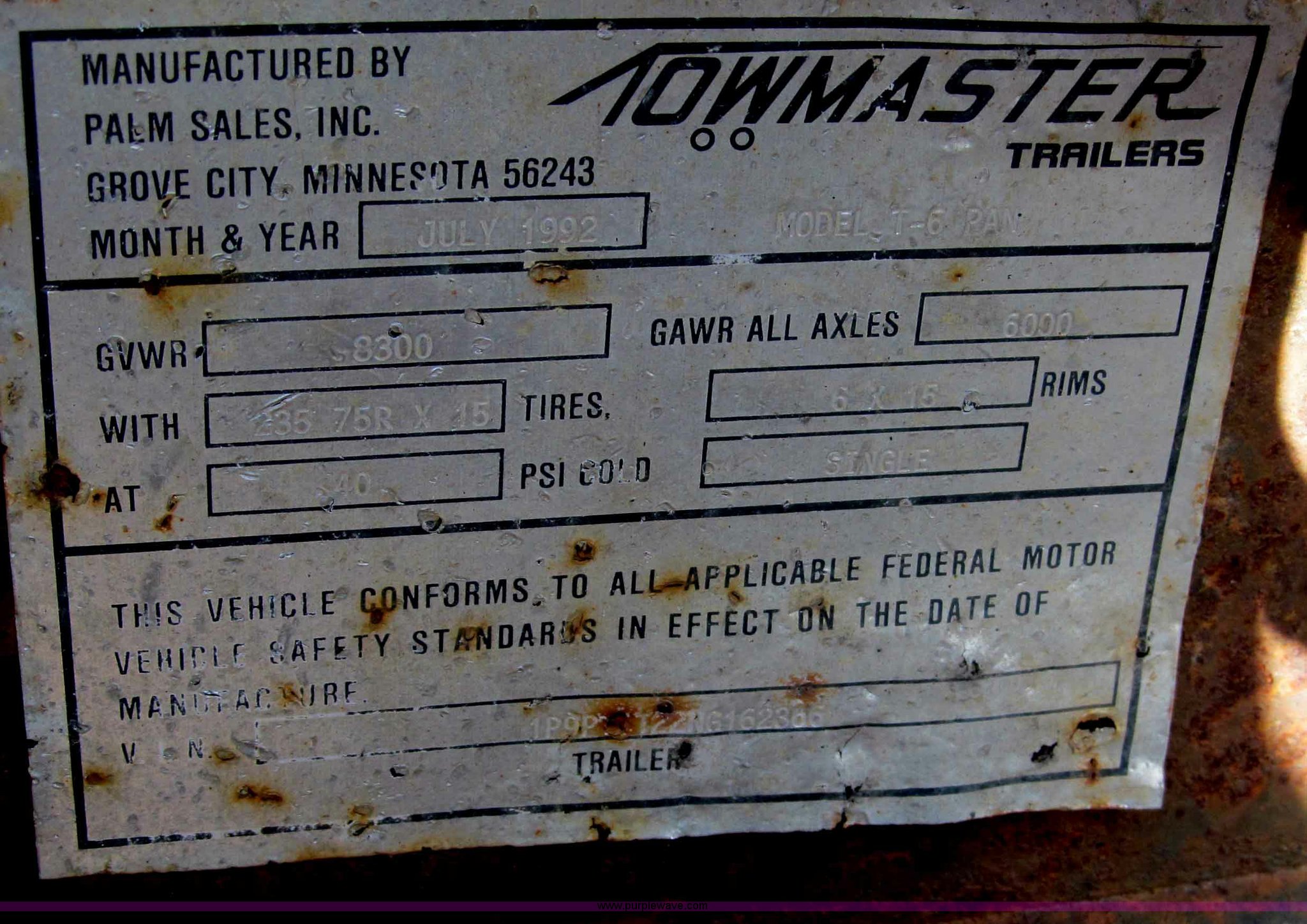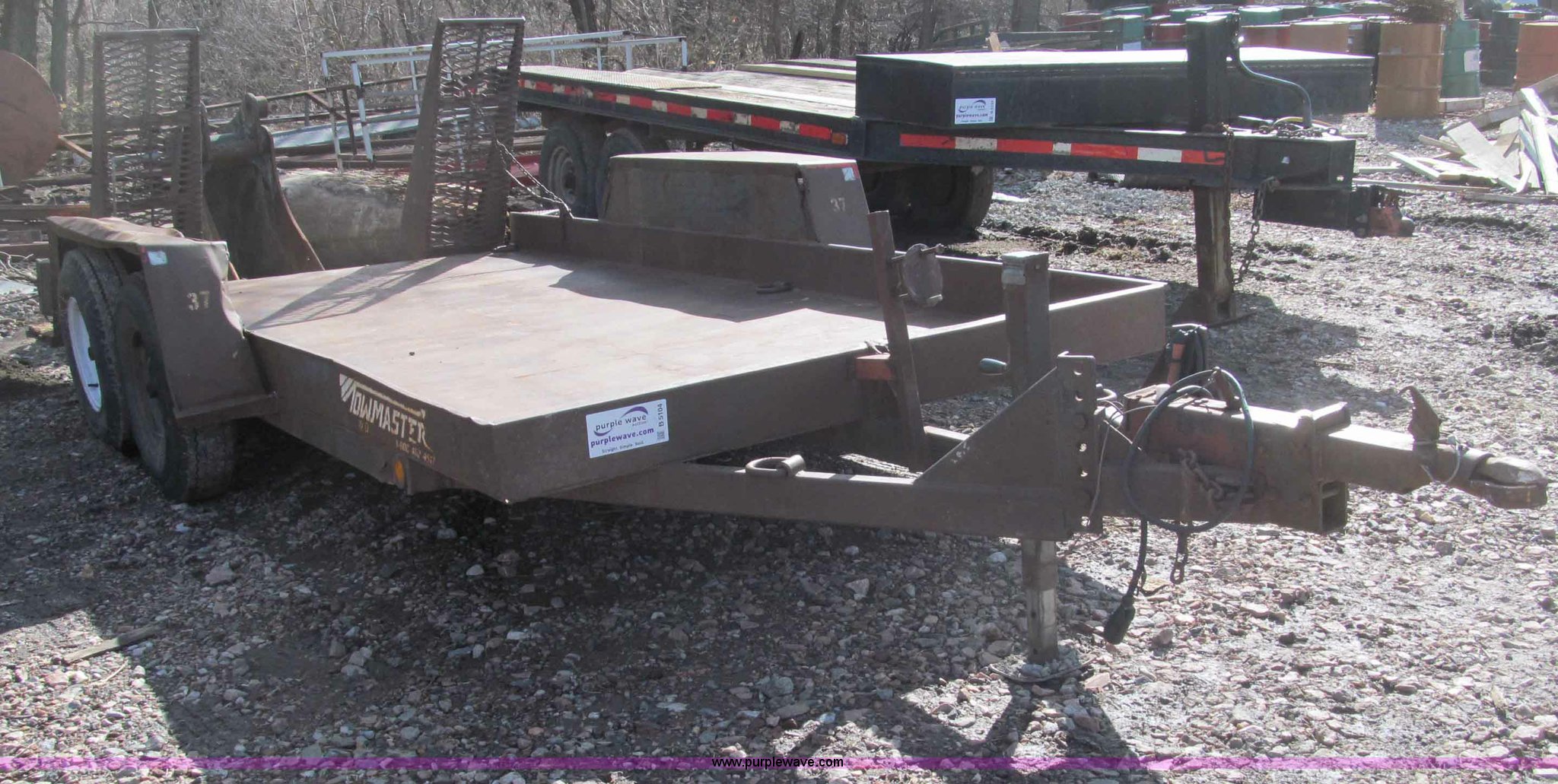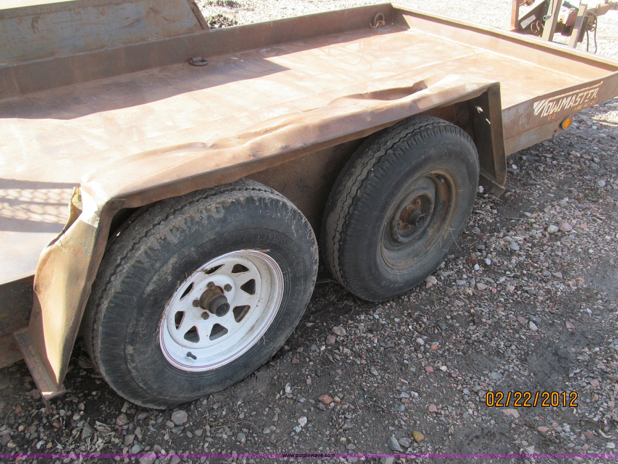Purple Wave is selling a used Car or Utility Trailer in Nebraska. This item is a 1992 Towmaster T-6 PAN tandem axle trailer with the following: GVWR 8,300 lbs, Metal deck, D-rings on tongue and sides, Bulldog jack, Hydraulic brake actuator, 6,000 lbs gross, Model DA-91, Clam shell hitch, Fold down ramps with steel mesh grating, 7.00-15 tires, Spare tire bracket, no spare, Annual inspection Aug. 2011, (3) black steel rims, One white spoke rim, Fender damage, Rust