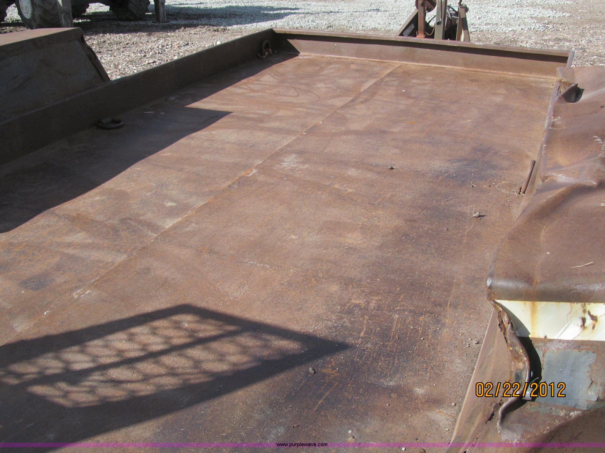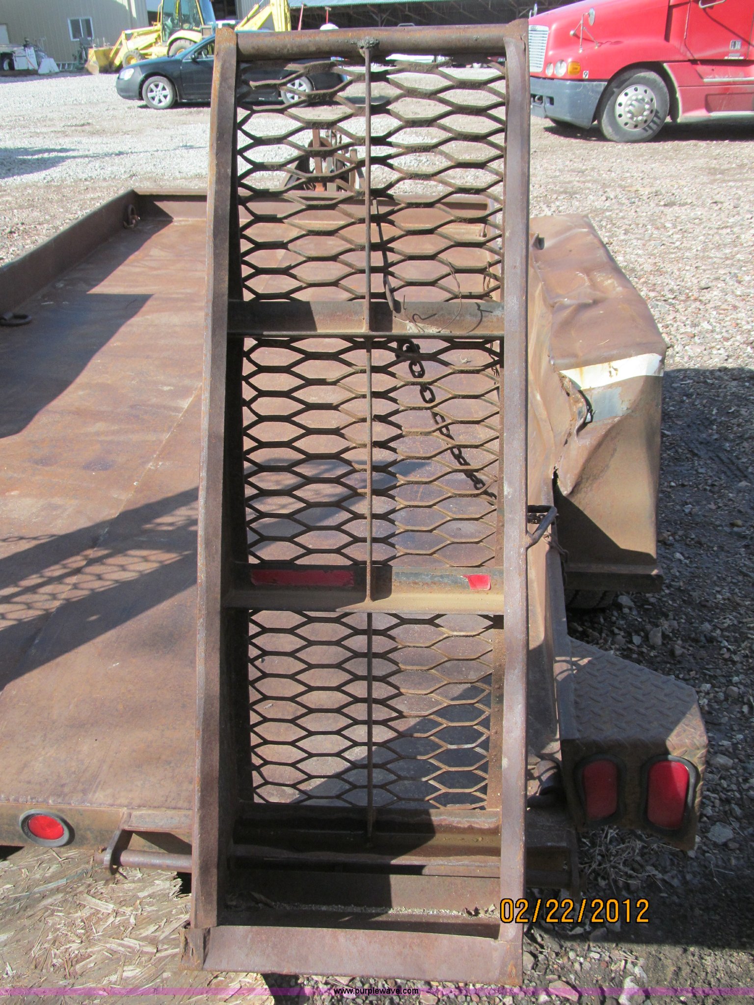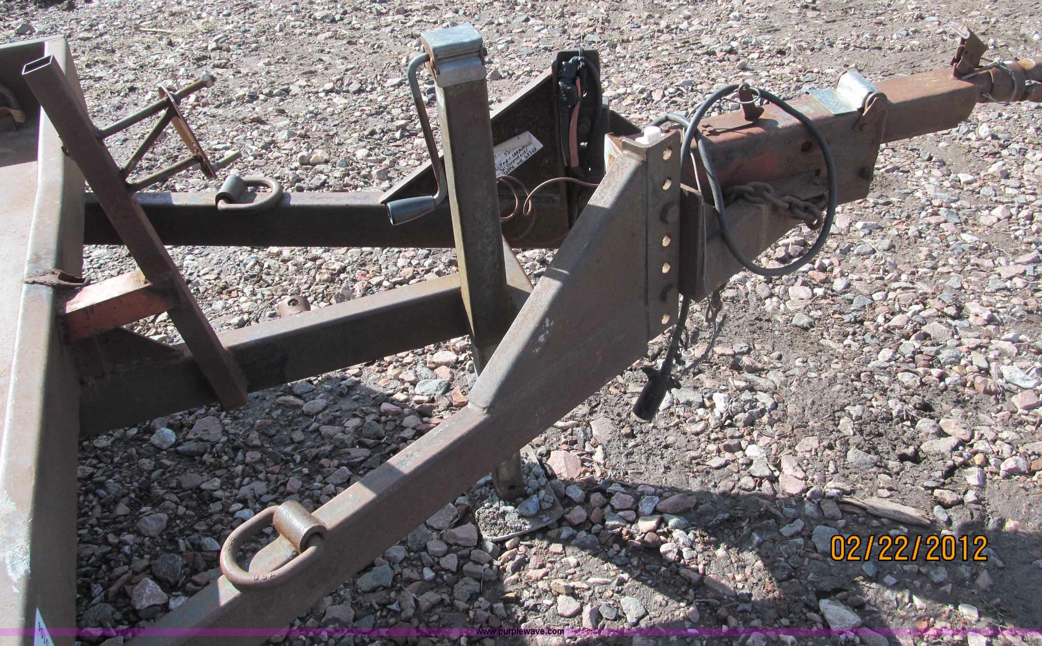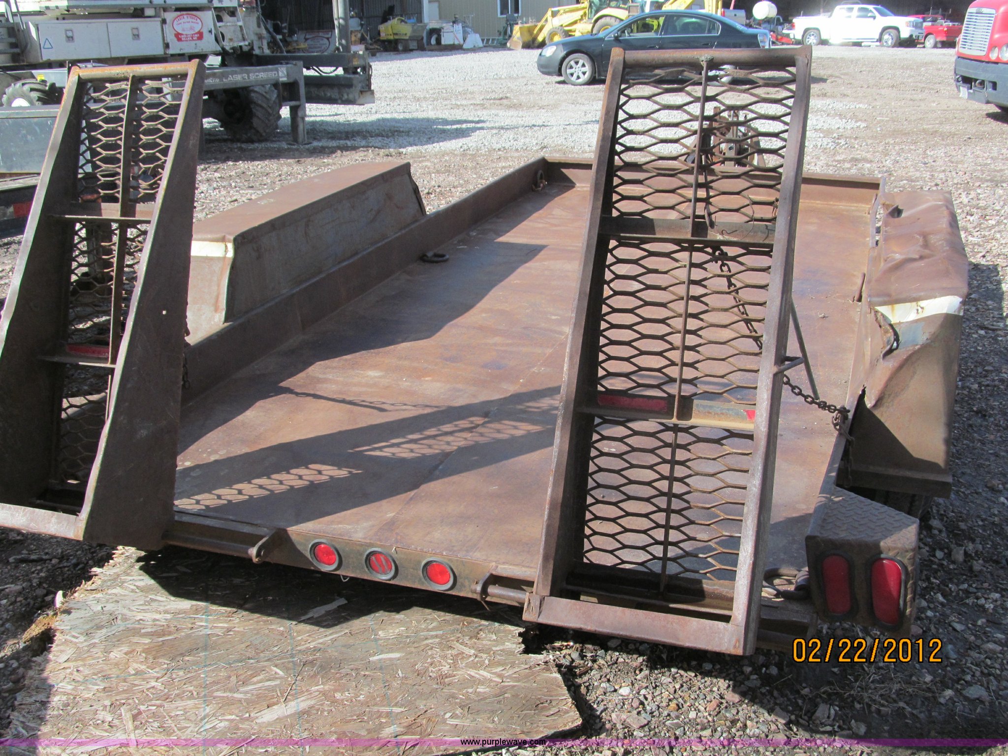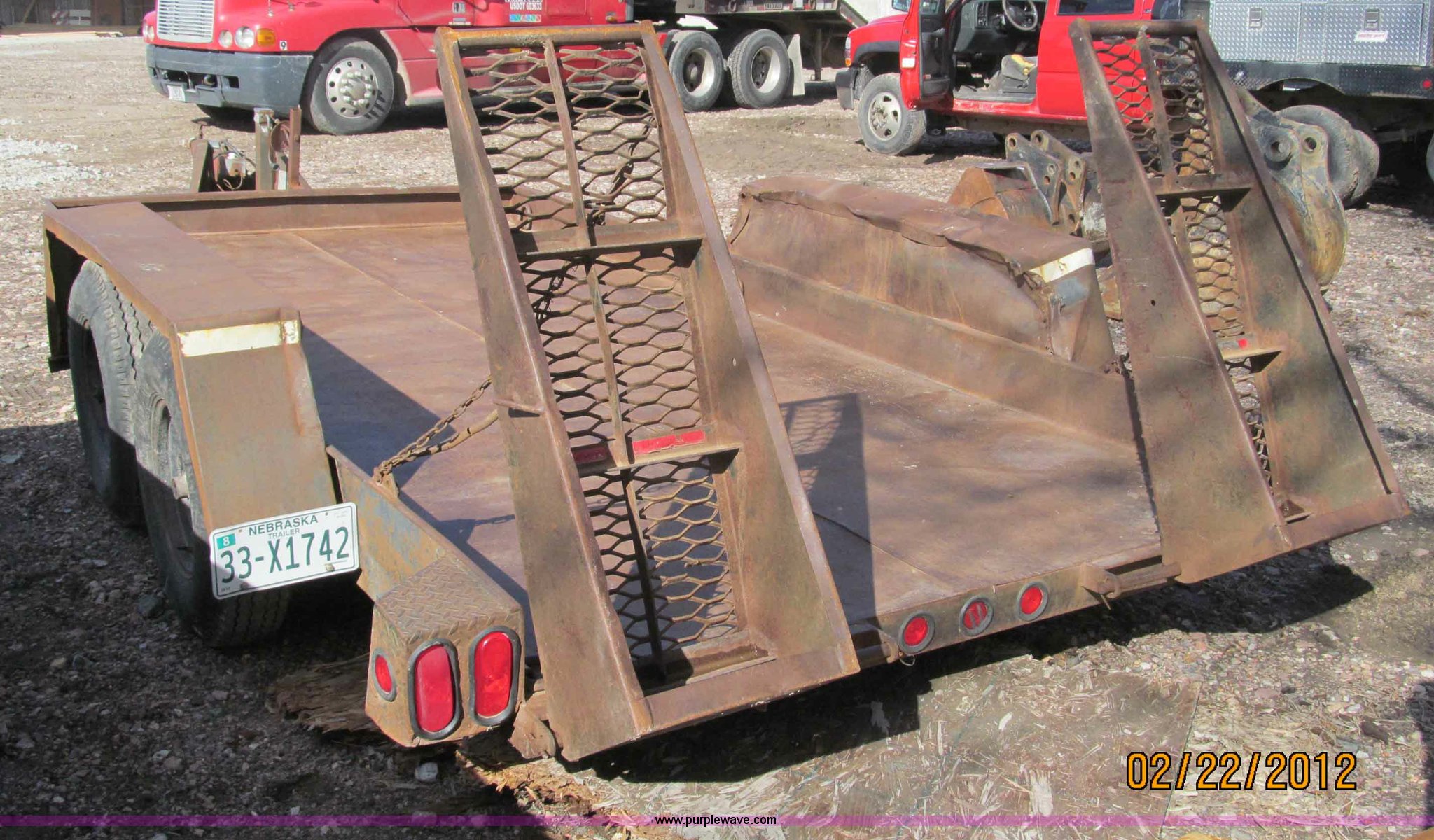 Purple Wave is selling a used Car or Utility Trailer in Nebraska. This item is a 1992 Towmaster T-6 PAN tandem axle trailer with the following: GVWR 8,300 lbs, Metal deck, D-rings on tongue and sides, Bulldog jack, Hydraulic brake actuator, 6,000 lbs gross, Model DA-91, Clam shell hitch, Fold down ramps with steel mesh grating, 7.00-15 tires, Spare tire bracket, no spare, Annual inspection Aug. 2011, (3) black steel rims, One white spoke rim, Fender damage, Rust