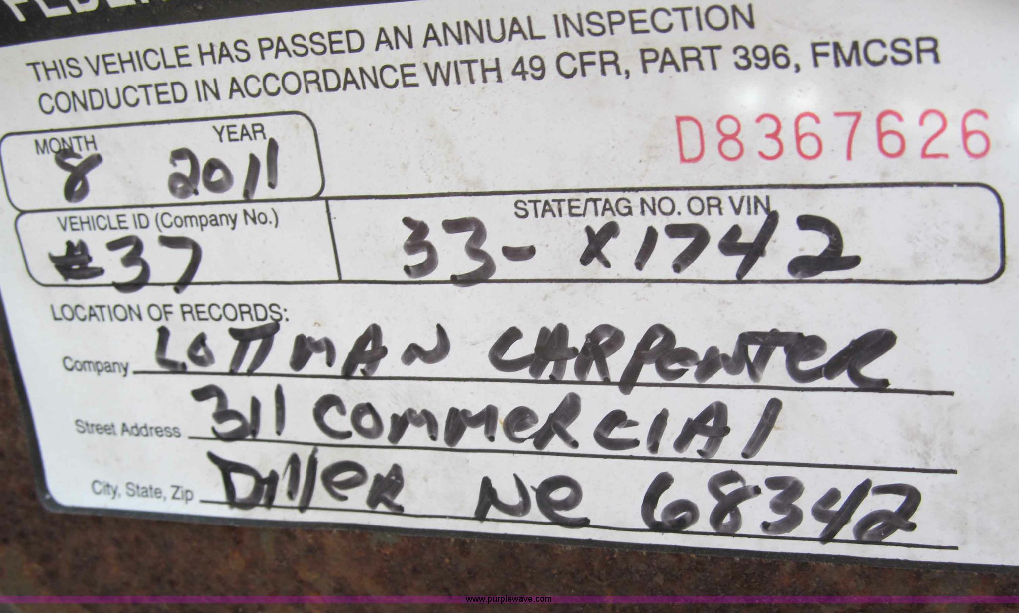 1992 Towmaster T-6 PAN tandem axle trailer. GVWR 8,300 lbs, Metal deck, D-rings on tongue and sides, Bulldog jack, Hydraulic brake actuator, 6,000 lbs gross Model DA-91, Clam shell hitch, Fold down ramps with steel mesh grating, 7.00-15 tires, Spare tire bracket, no spare, Annual inspection Aug. 2011, (3) black steel rims, One white spoke rim, Fender damage, Rust. 1P9P20T22NG162366. Shipping quotes available. Lottman Carpenter Construction. 311 Commercial St. Diller, NE 68342