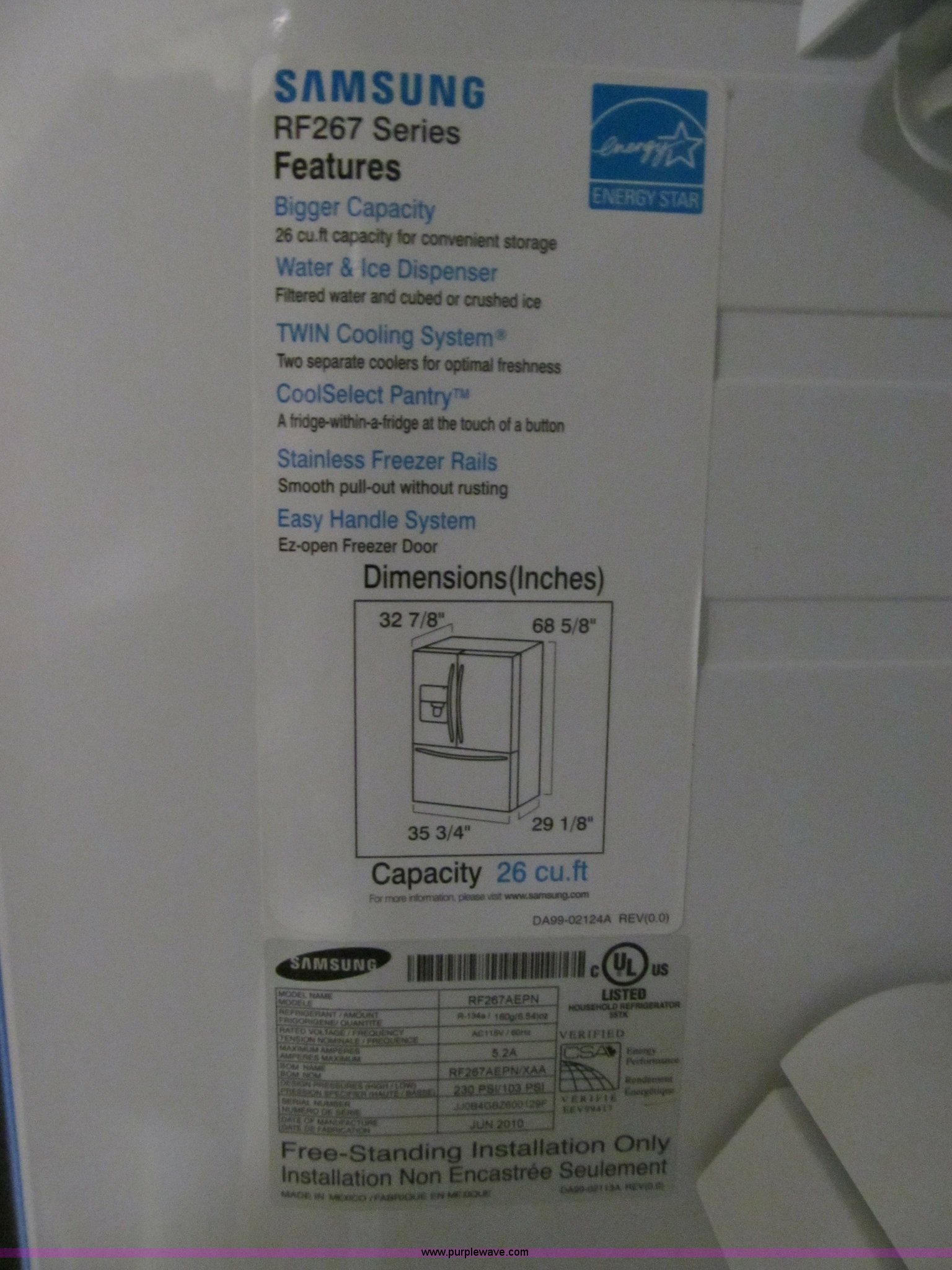 Purple Wave is selling a used Appliances in Kansas. This item is a Samsung stainless steel fridge with the following: Top fridge, bottom freezer, Ice maker/water, RF267 series, 26 cu. ft. capacity, 70"H x 33"W x 36"L, Cosmetic dents to exterior